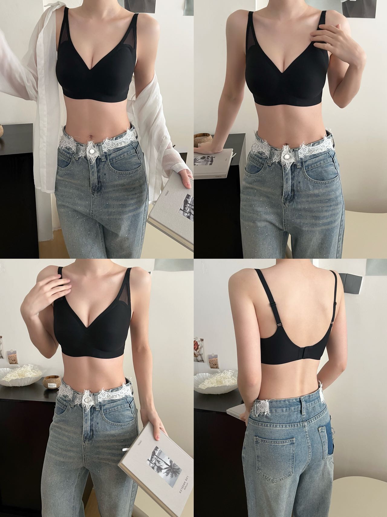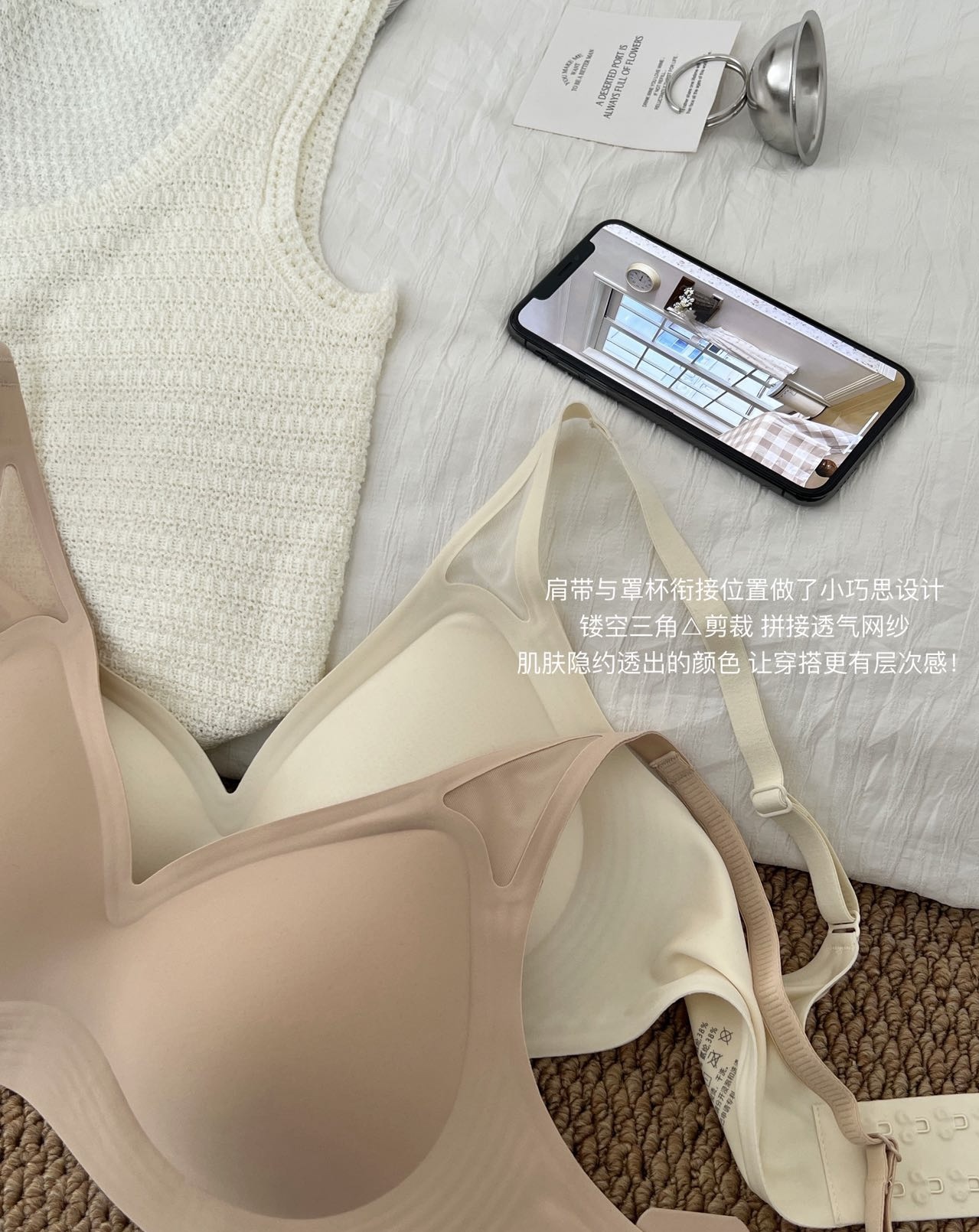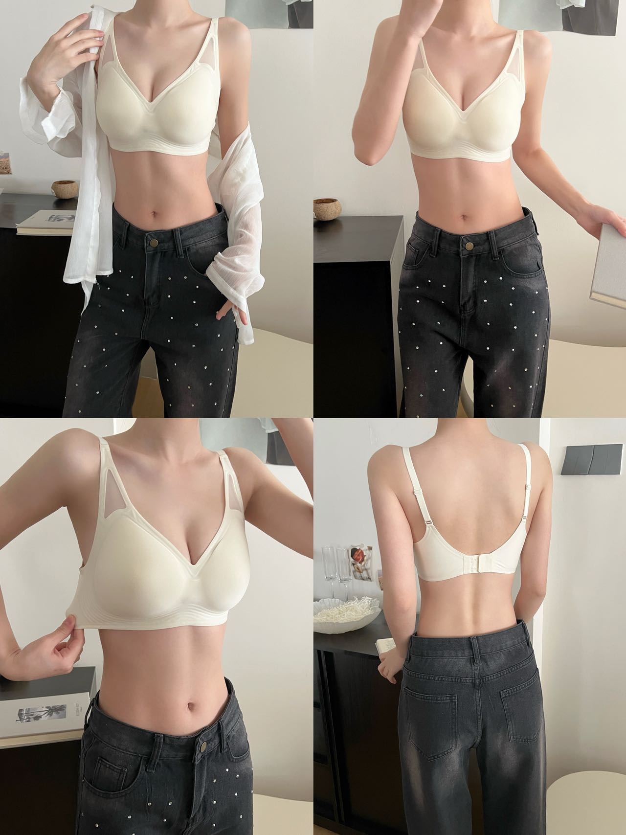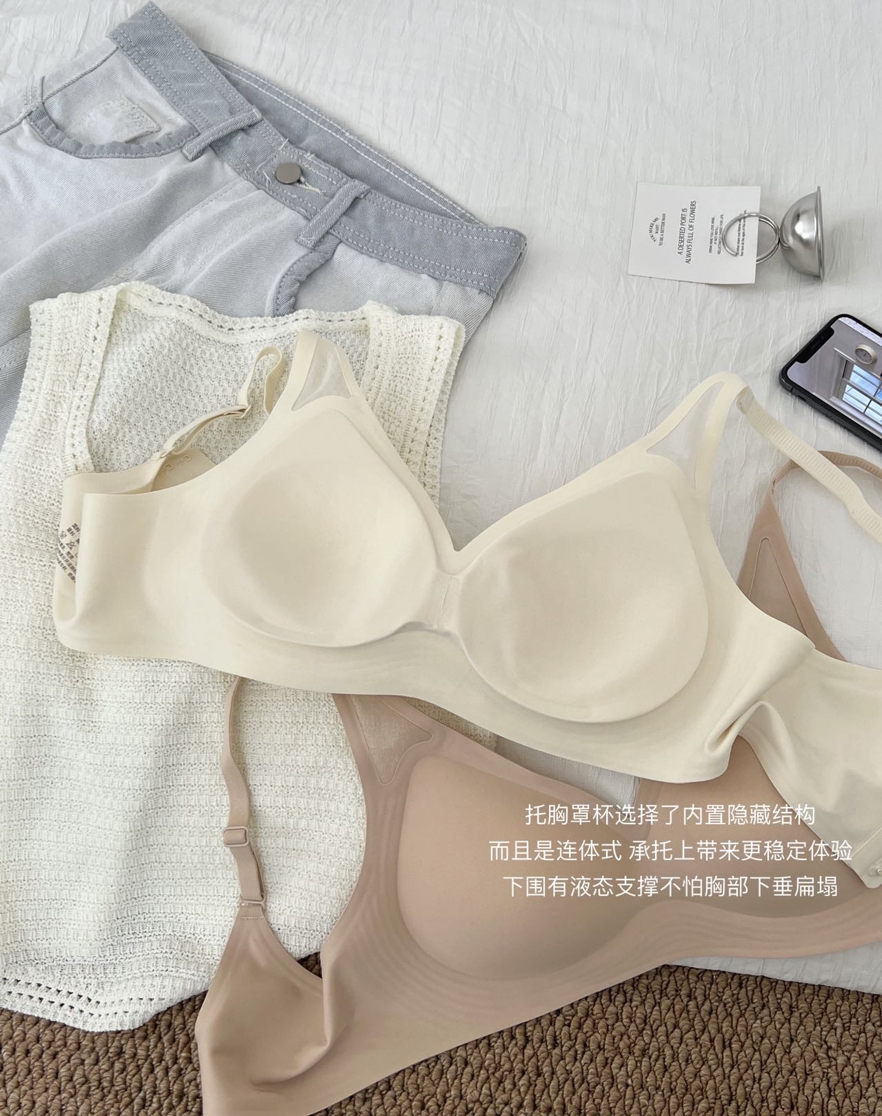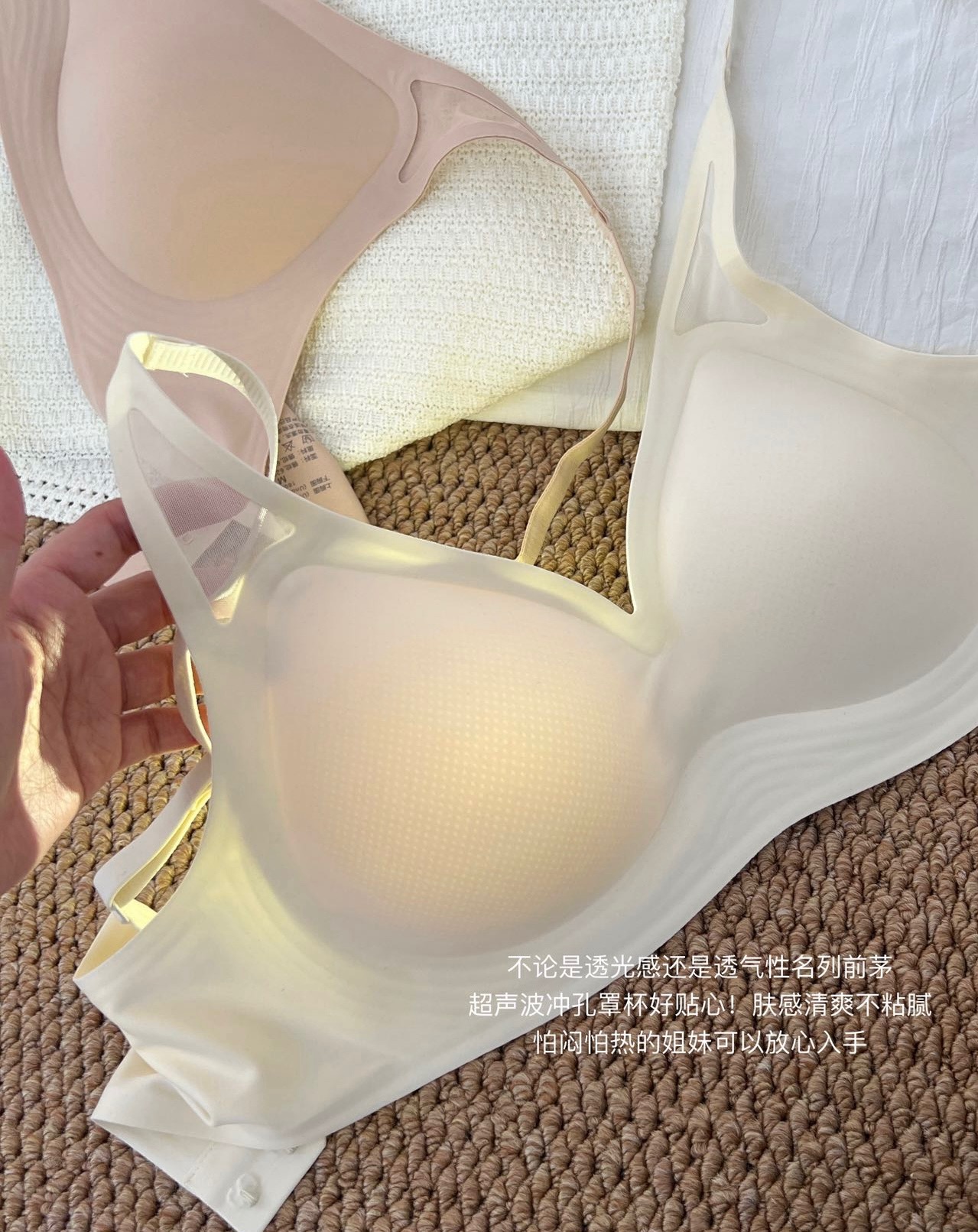 50 华歌尔液态软支撑三角网纱文胸到货!简约版型,第一眼就勾住极简主义的魂,让整个款式设计出流畅线条感,能自然带动你每一套穿搭Look的时髦度!吊脚位置多了小三角镂空剪裁,拼接薄纱,做透视感视觉呈现,丰富穿搭效果!没想到看似简简单单的光面款也能有这么个性的吸睛设计!“抬手不上窜,液态软支撑”也是这款内衣的灵魂所在,每一步设计都环环相扣,才能够让你一接触,一试穿就立马爱上!就上就秒懂这件内衣对下垂胸型的杀伤力!360度环绕式液态结构,全方位包裹,均匀受力稳稳提拉,让胸部直接拔高一个高度!用液态软支撑替代钢圈,温柔且有力量!水滴连体固定杯,服帖包裹。模杯是超生波冲孔罩杯好贴心,肤感清爽不黏腻,怕闷热的姐妹可以放心入!大货3个颜色:黑色,肤色,白色! 大货4个尺码:M L XL 2XL (尺码穿戴说明:M适合70和75AB 杯妹子,L适合75C和80AB杯,XL适合80C和85AB杯,2XL适合85C 和90AB杯)这款ABC 杯都可以穿!