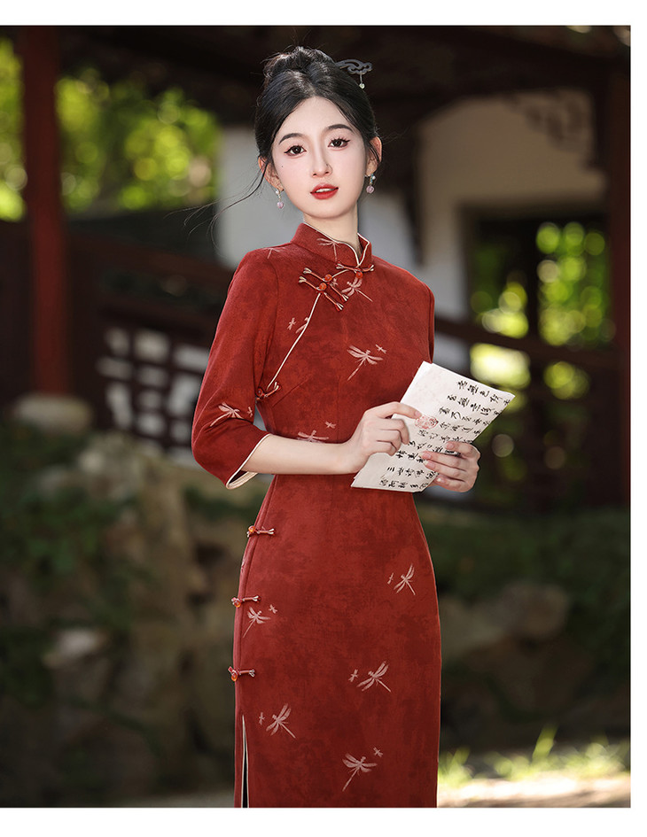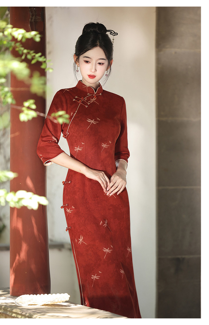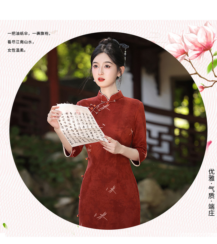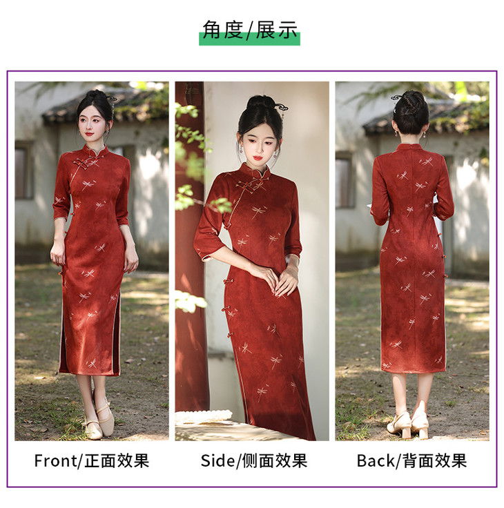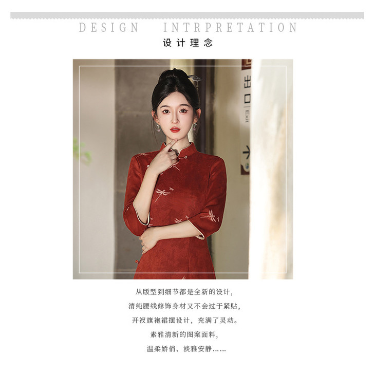 新中式国风订婚旗袍,长袖修身长款日常旗袍MLS7213