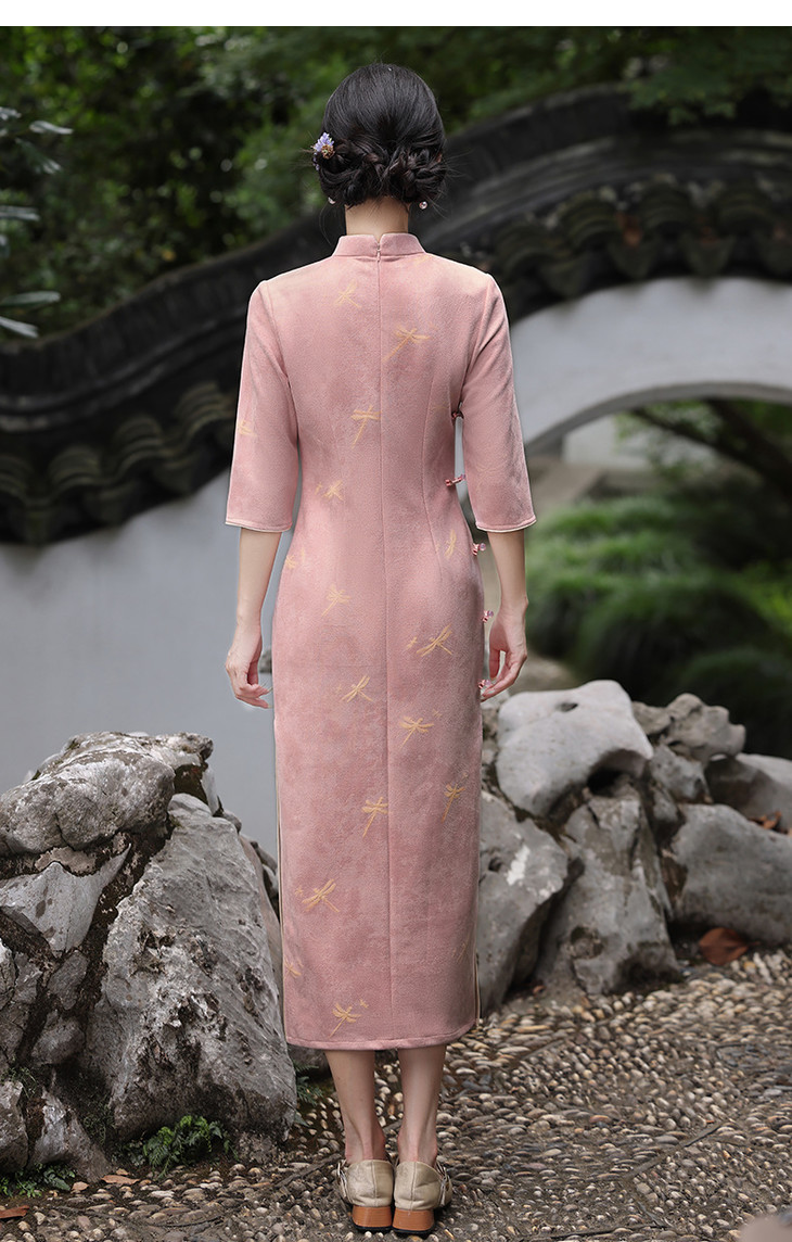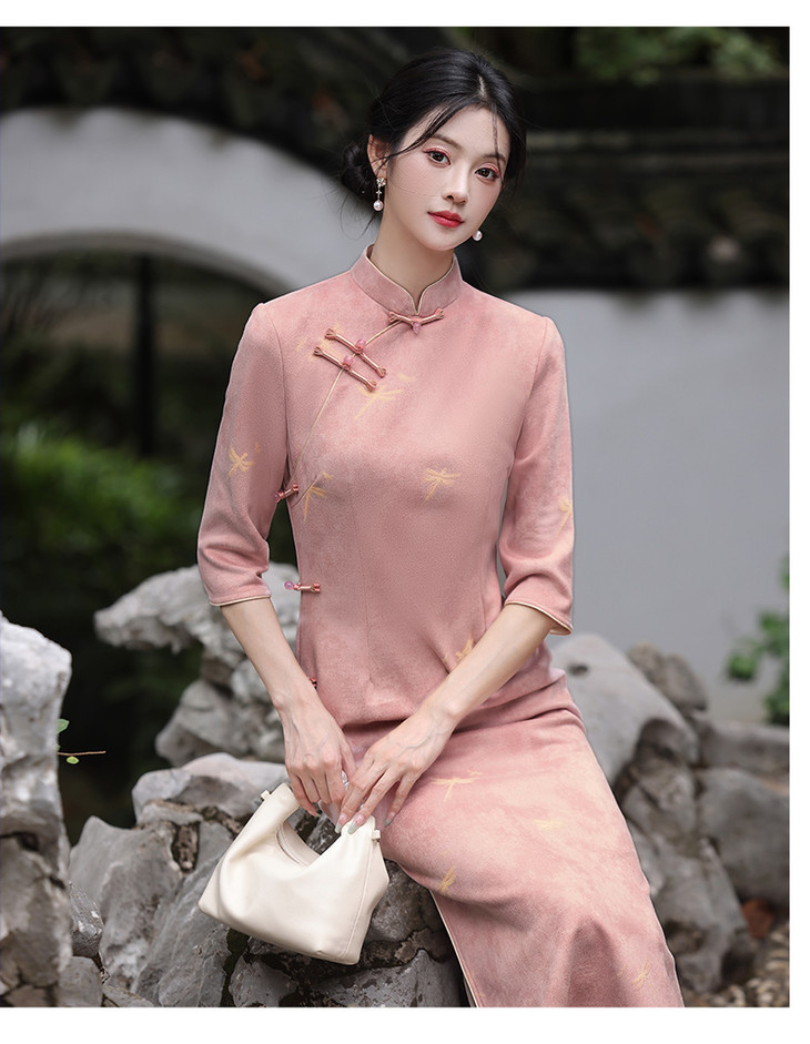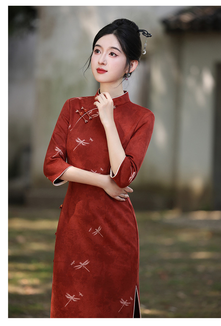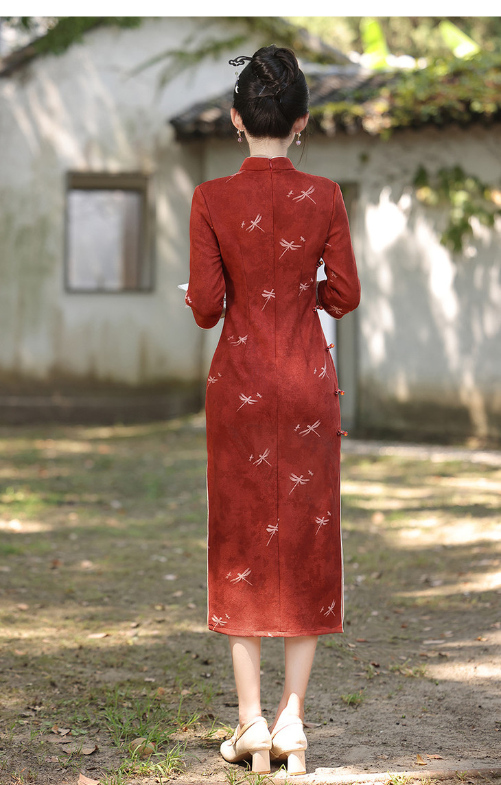 新中式国风订婚旗袍,长袖修身长款日常旗袍MLS7213