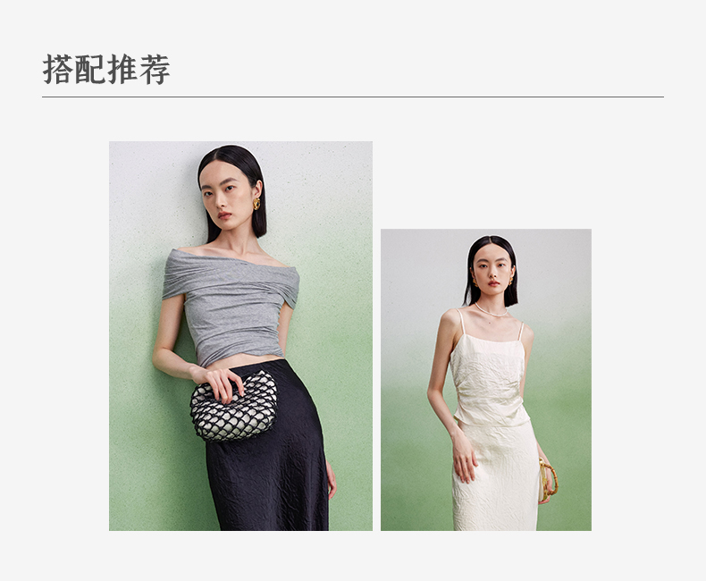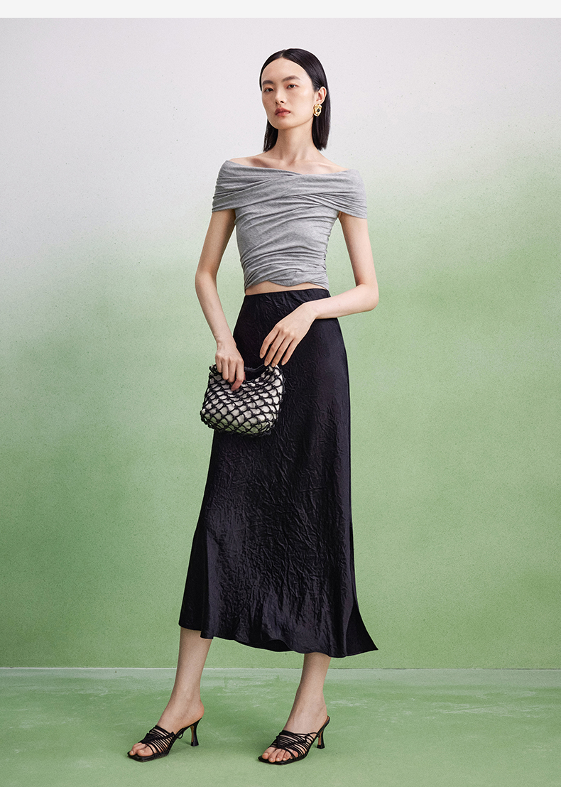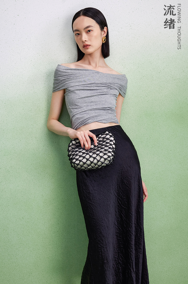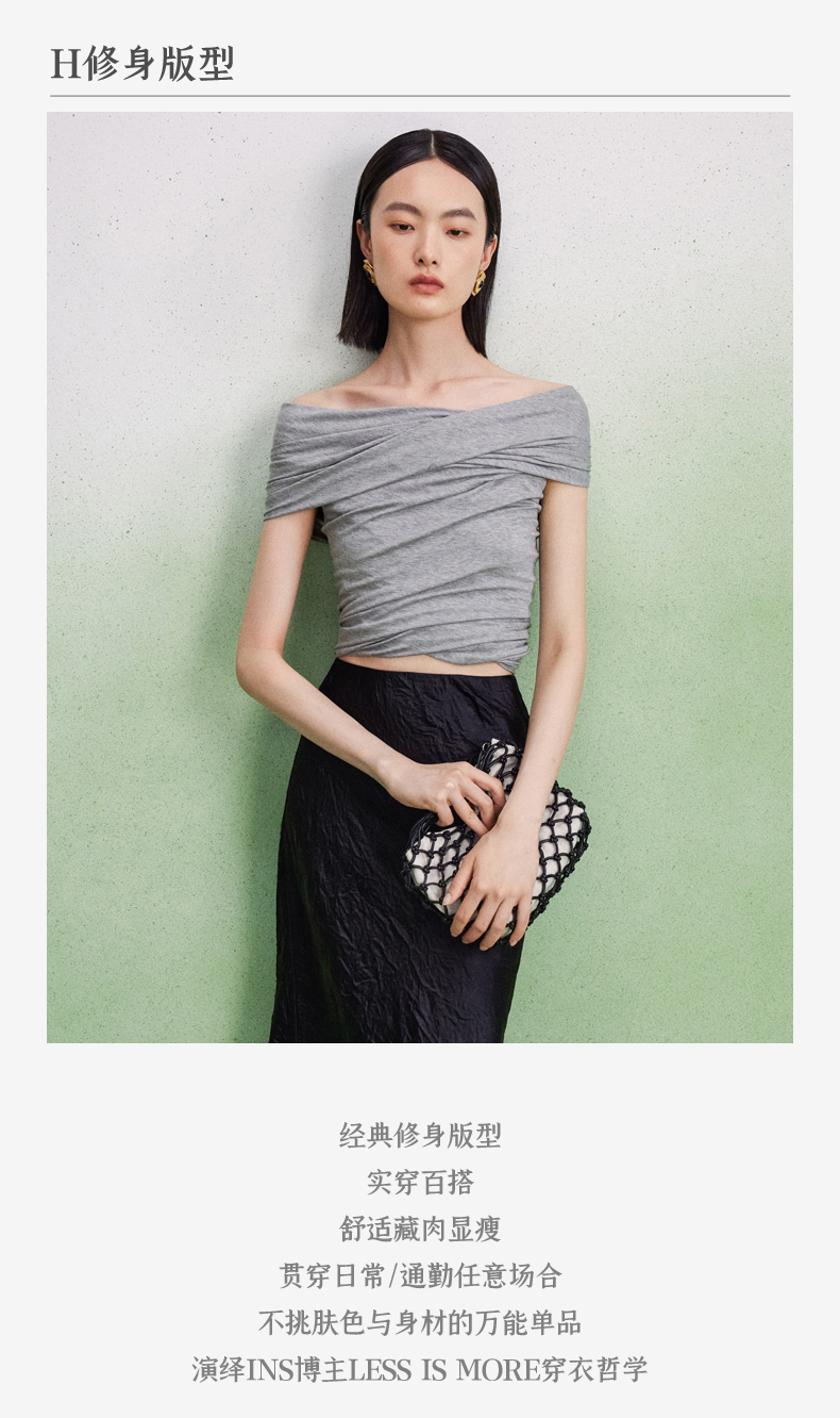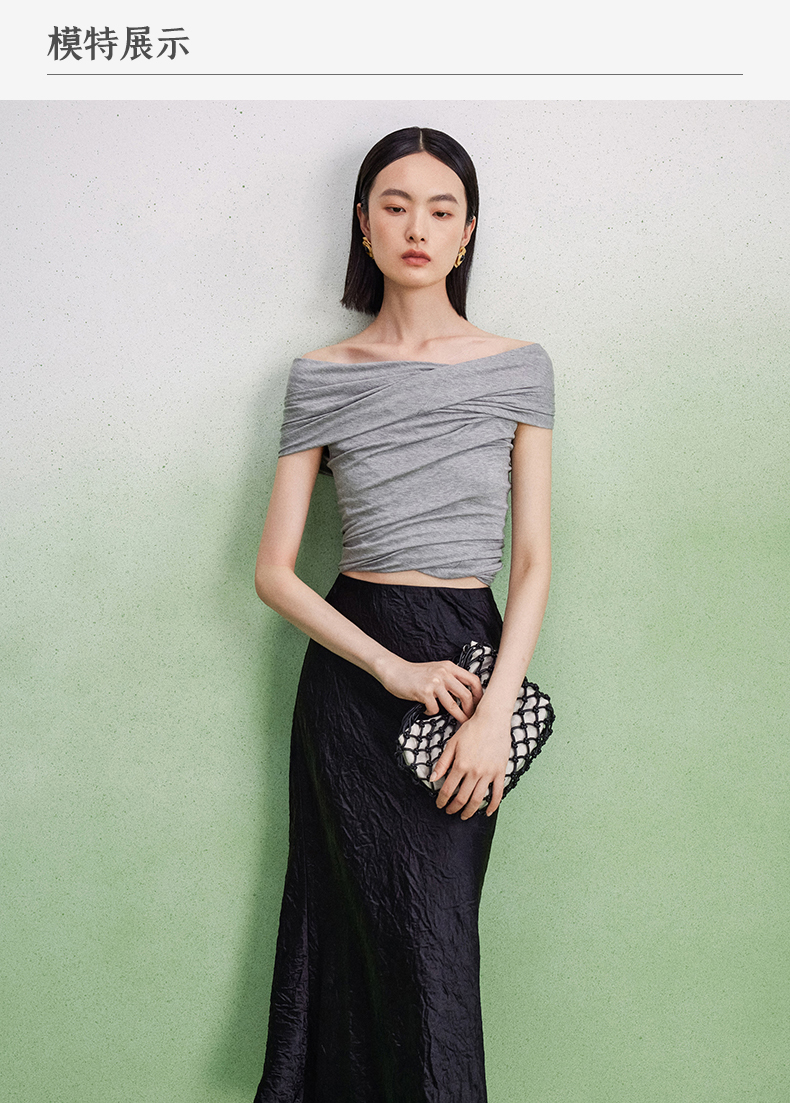 西嘉【该款尺码偏小一码】T2402010C+IMPRESS/西嘉蚕丝针织T恤女夏季新款设计感不对称多穿褶皱短袖