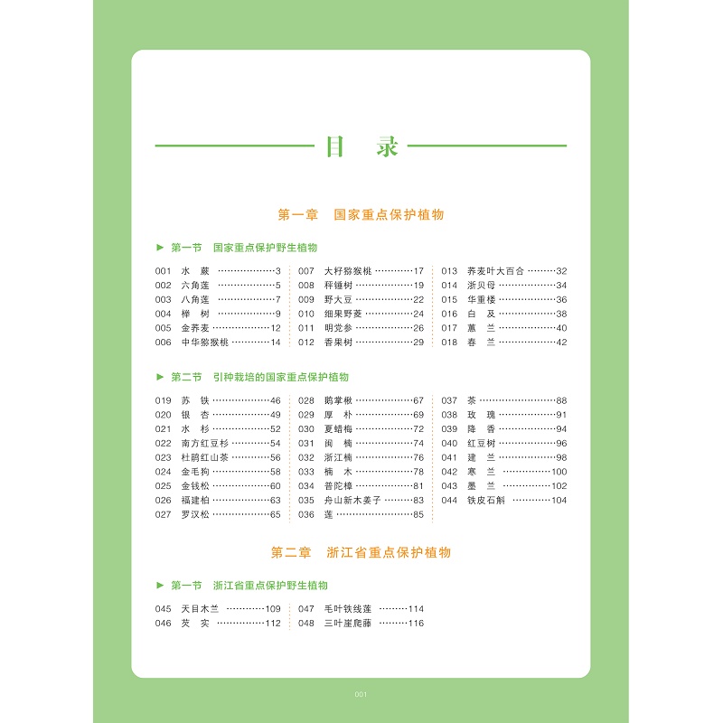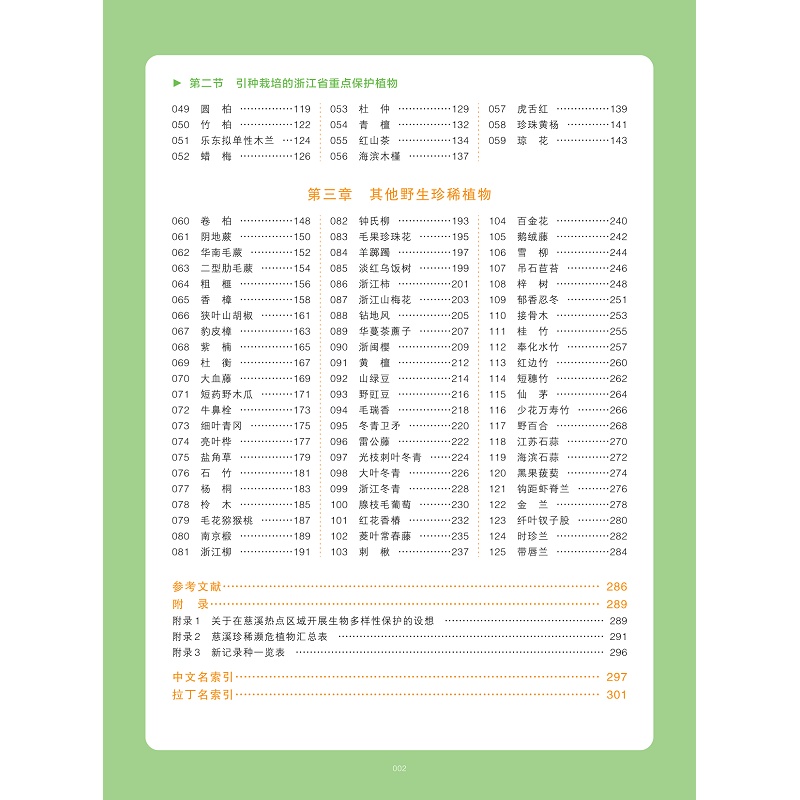 全书收录了浙江慈溪珍稀濒危植物129种。其中,国家重点保护野生植物18种,浙江省重点保护野生植物4种;当地无天然分布而引种的国家级重点保护植物26种,省级重点保护植物11种;其他野生珍稀植物70种。每种记述中文名、拉丁学名、别名、分类地位、形态特征、分布与生境(地理分布)、生态生物学特性、应用价值、文化、濒危状态、保护价值及措施和繁殖方法。同时,每种配置原色照片4~9张。另外,书后还有“珍稀濒危植物汇总表”等附录。
