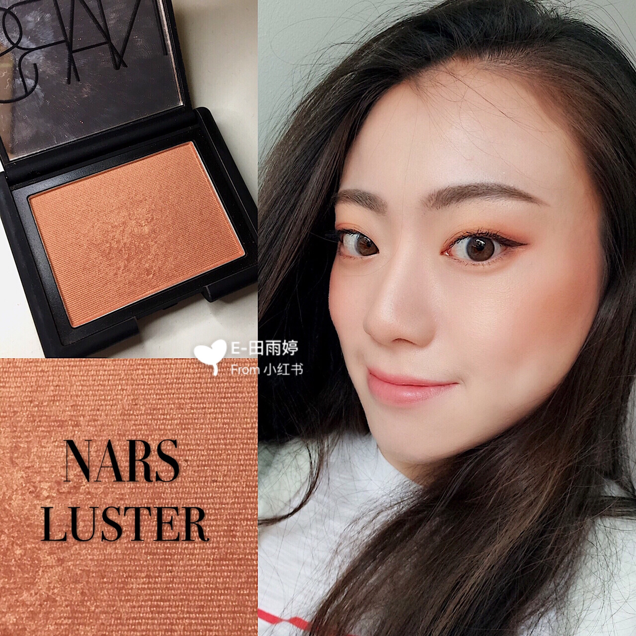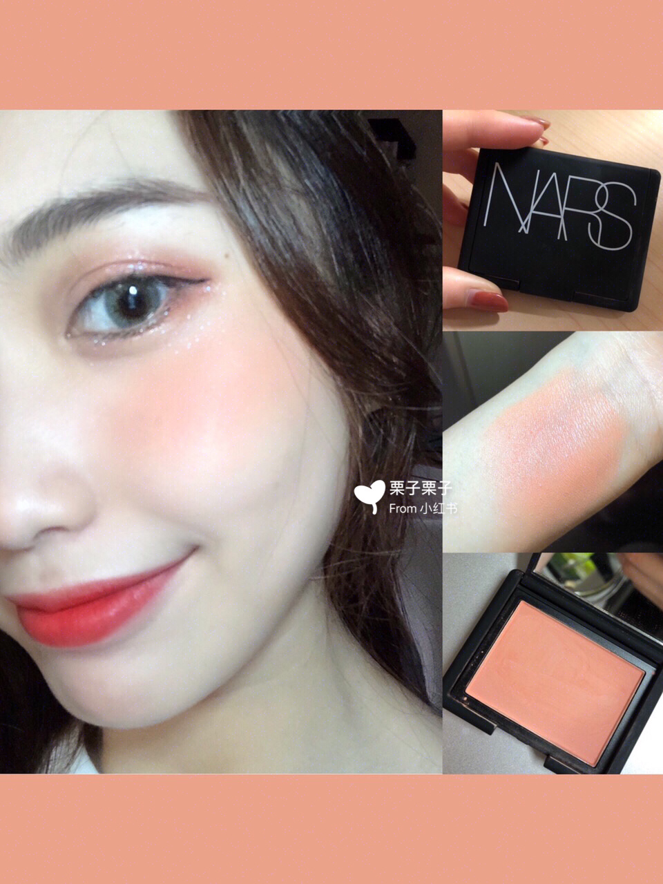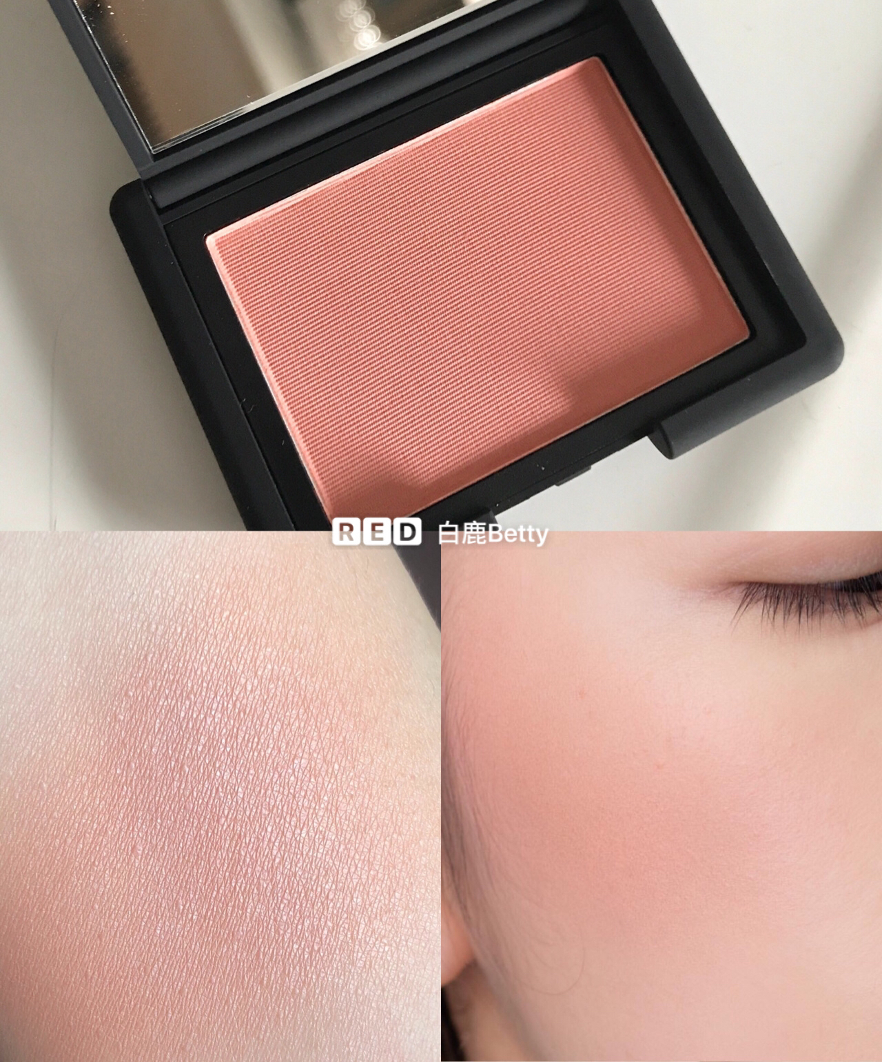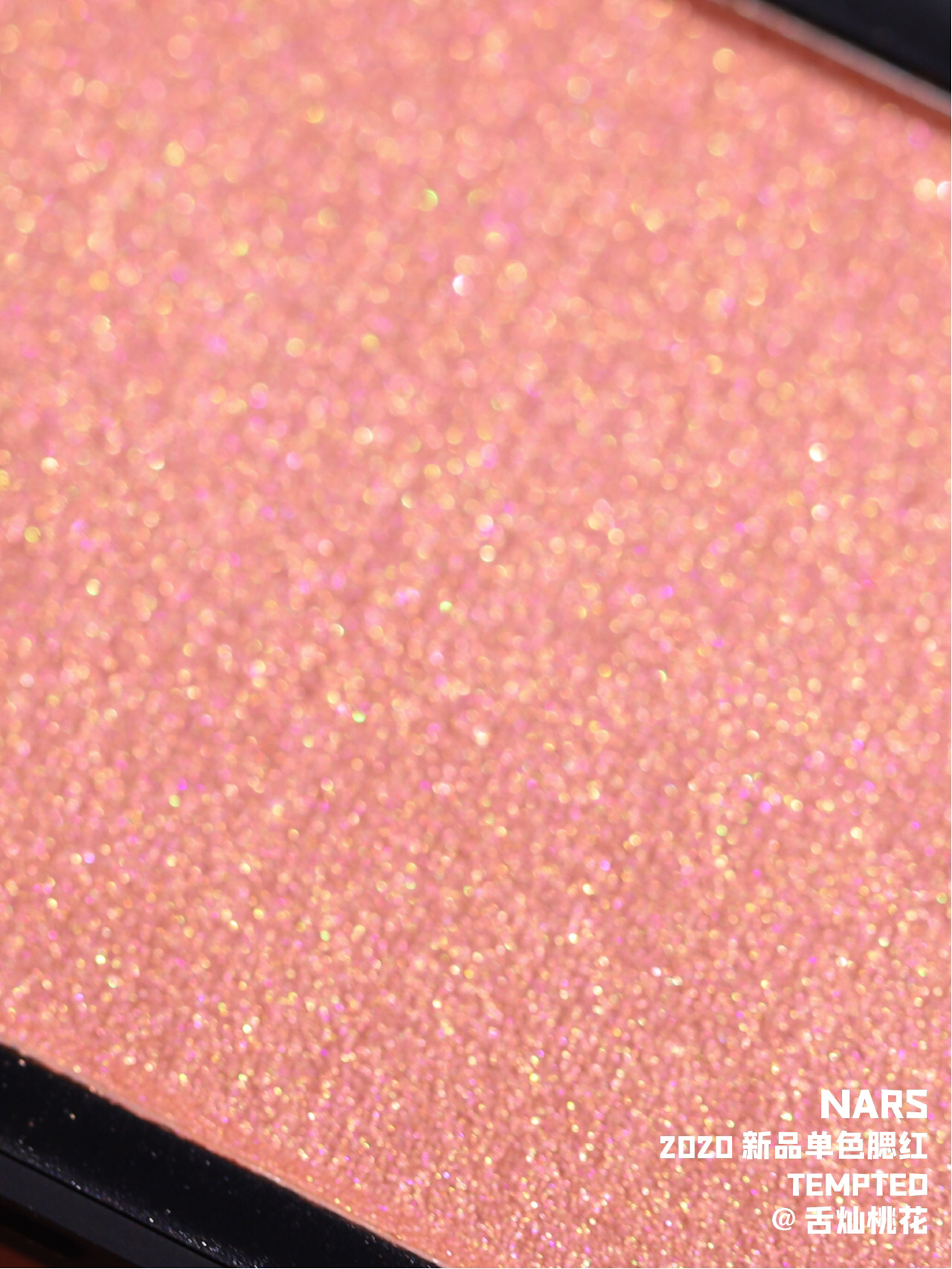 蜜桃色系,粉质细腻,带偏珠光细闪