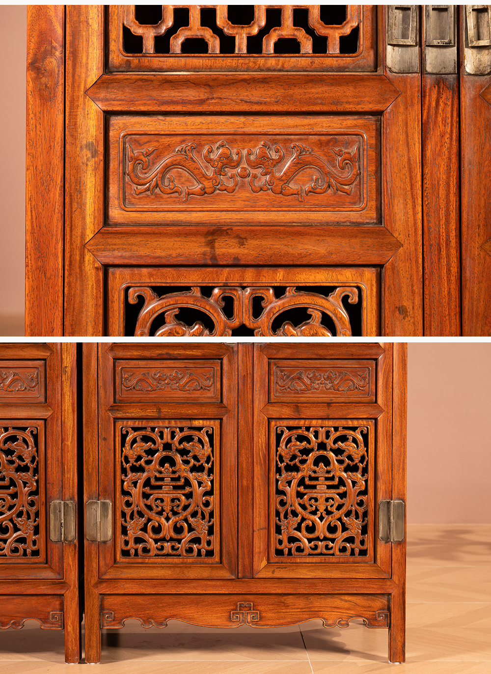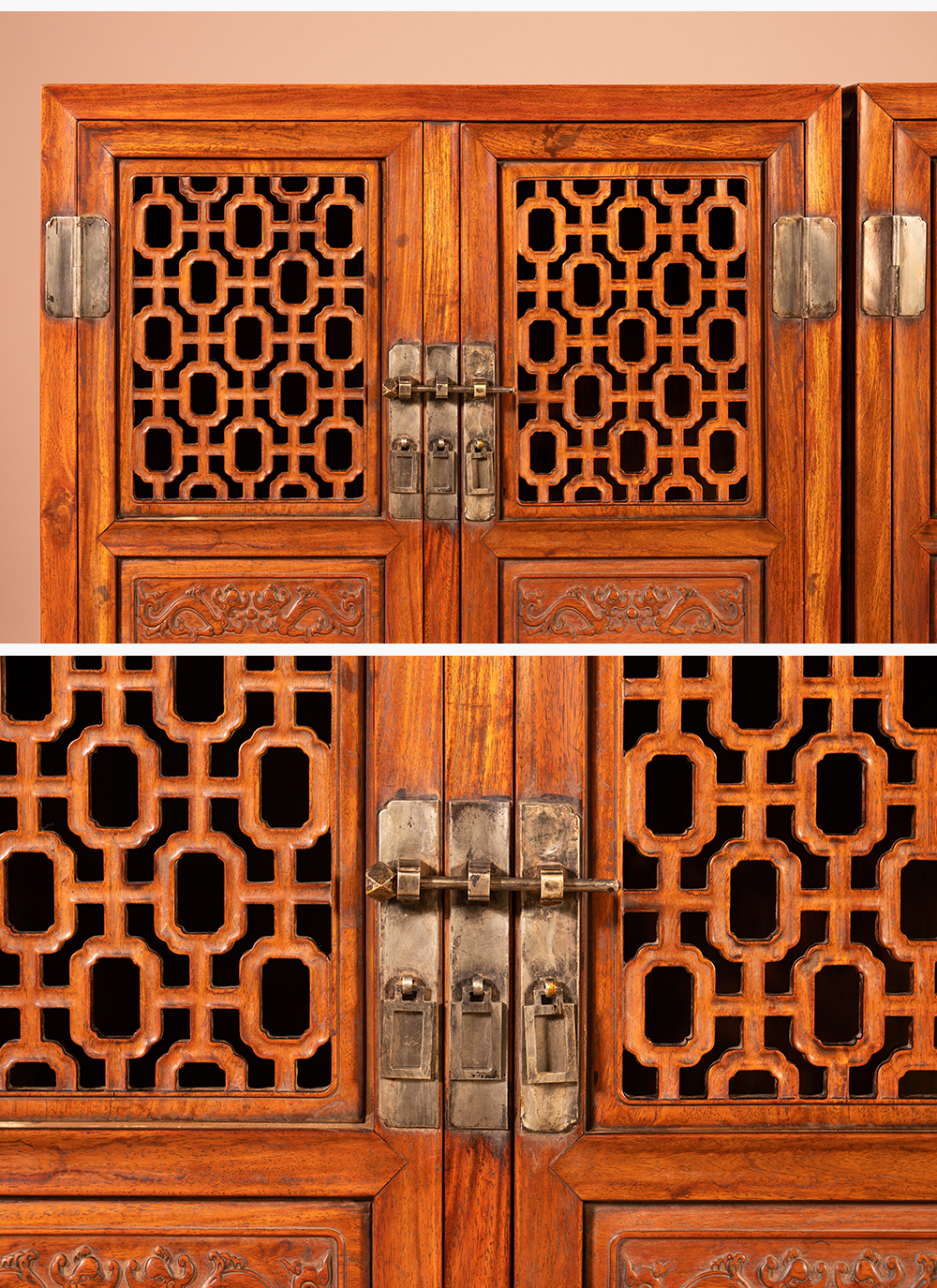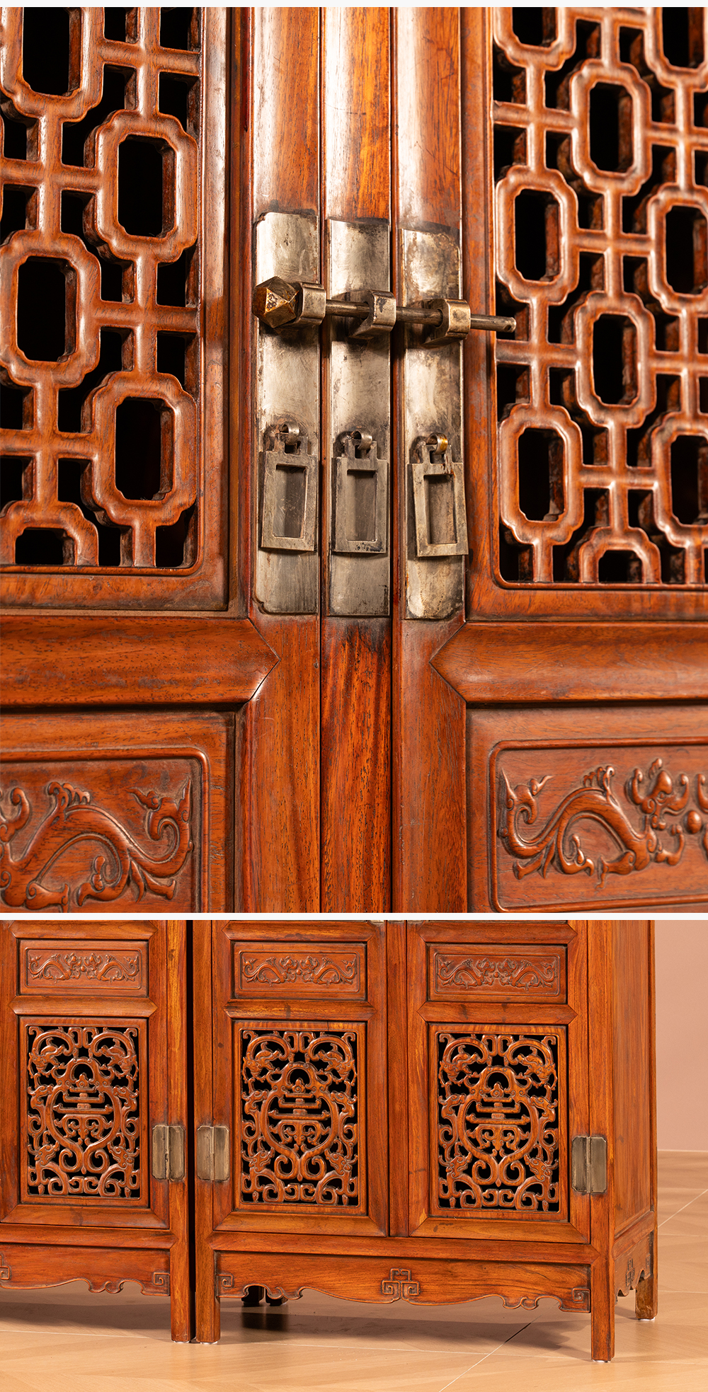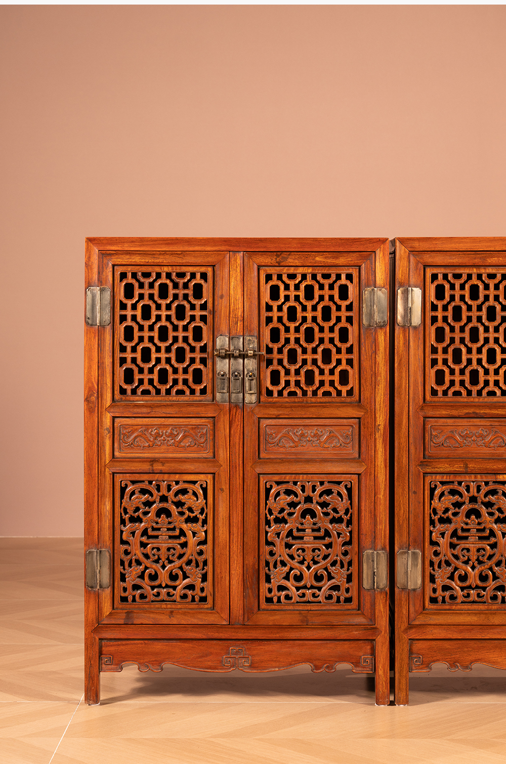 清 黄花梨透雕螭龙捧寿四抹门方角柜(一对)