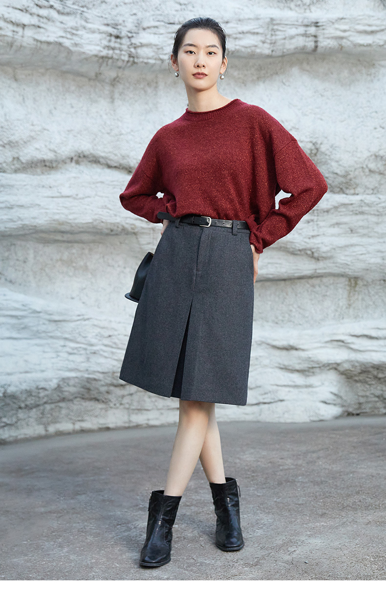 秋冬松弛感穿搭 酒红细闪肌理圆领宽松毛衣 微透光泽感休闲长袖针织上衣