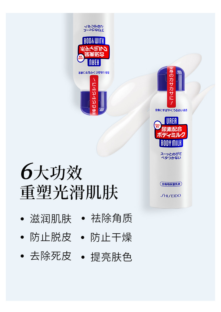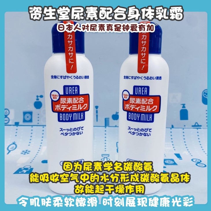 资生堂尿素配合身体乳霜👍日本人🇯🇵对尿素真是钟爱有加,护手霜、身体乳都是尿素的成分💧。因为尿素学名碳酸氨,能吸收空气中的水分形成碳酸氨晶体,故能起干燥作用🌀。资生堂这款尿素保湿身体乳比一般润肤露能更有效地帮助肌肤保持充足水分💦,改善粗糙紧绷及脱皮现象✔。蕴含出色的保湿成份尿素和丰富的维生素E特效美白成分✨,能迅速被肌肤吸收,有效滋润及修护肌肤☺,令肌肤柔软嫩滑,时刻展现健康光彩。
