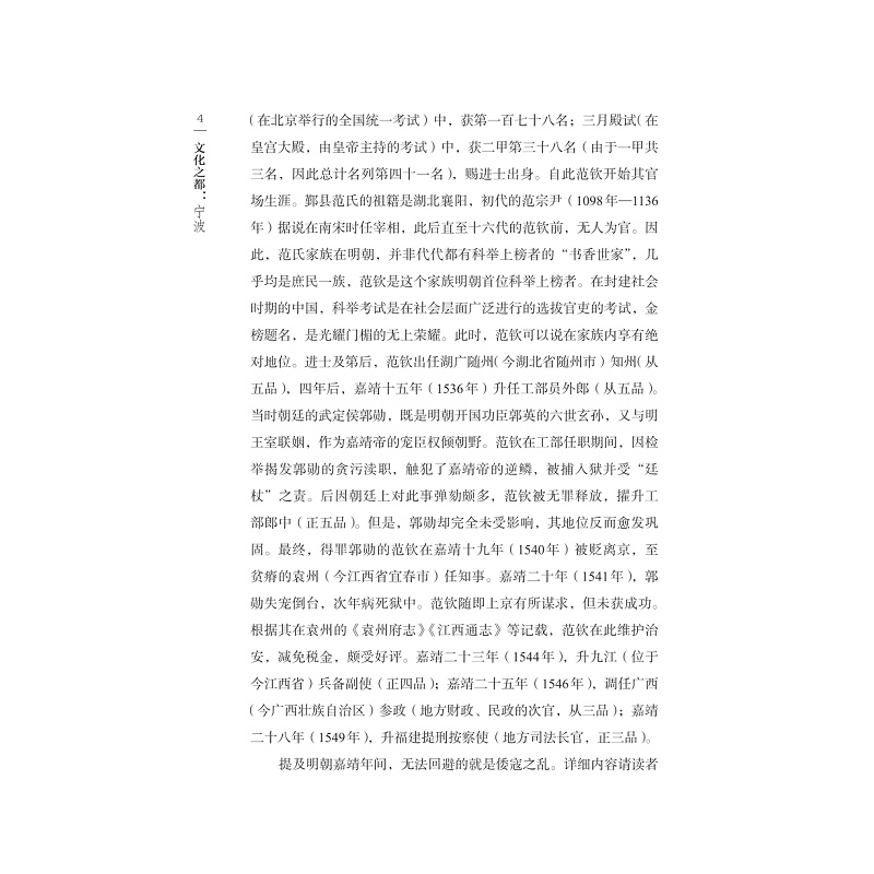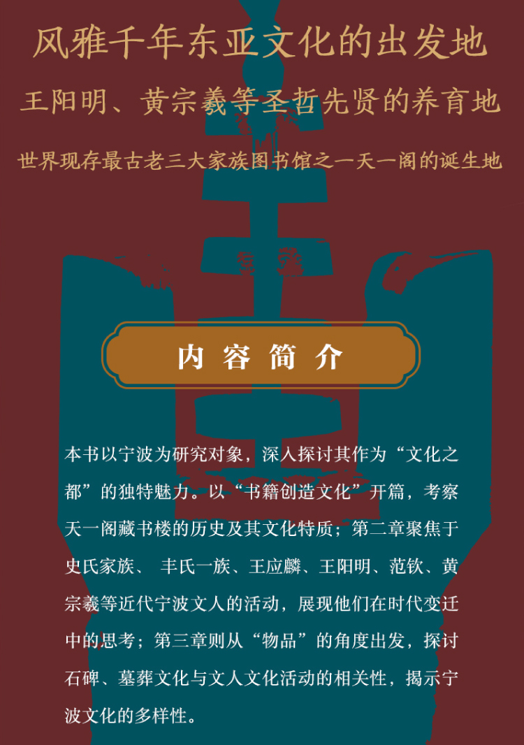 本书以宁波为研究对象,深入探讨其作为“文化之都”的独特魅力。以“书籍创造文化”开篇,考察天一阁藏书楼的历史及其文化特质;第二章聚焦于史氏家族、 丰氏一族、王应麟、王阳明、范钦、黄宗羲等近代宁波文人的活动,展现他们在时代变迁中的思考;第三章则从“物品”的角度出发,探讨石碑、墓葬文化与文人文化活动的相关性,揭示宁波文化的多样性。