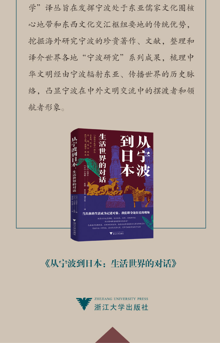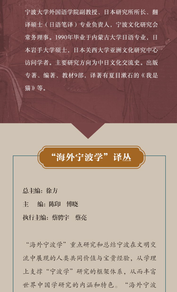 “海外宁波学”译丛重点研究和总结宁波在文明交流中展现的人类共同价值与宝贵经验,从学理上支撑“宁波学”研究的框架体系,从而丰富世界中国学研究的内涵和特色。“海外宁波学”译丛旨在发挥宁波处于东亚儒家文化圈核心地带和东西文化交汇枢纽要地的传统优势,挖掘海外研究宁波的珍贵著作、文献,整理和译介世界各地“宁波研究”系列成果,梳理中华文明经由宁波辐射东亚、传播世界的历史脉络,凸显宁波在中外文明交流中的摆渡者和领航者形象。
