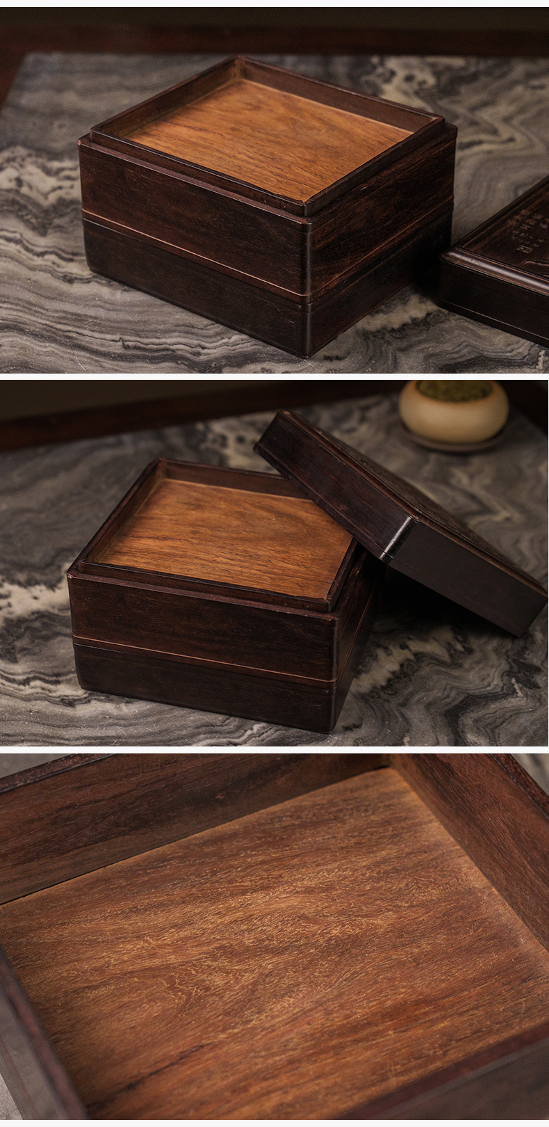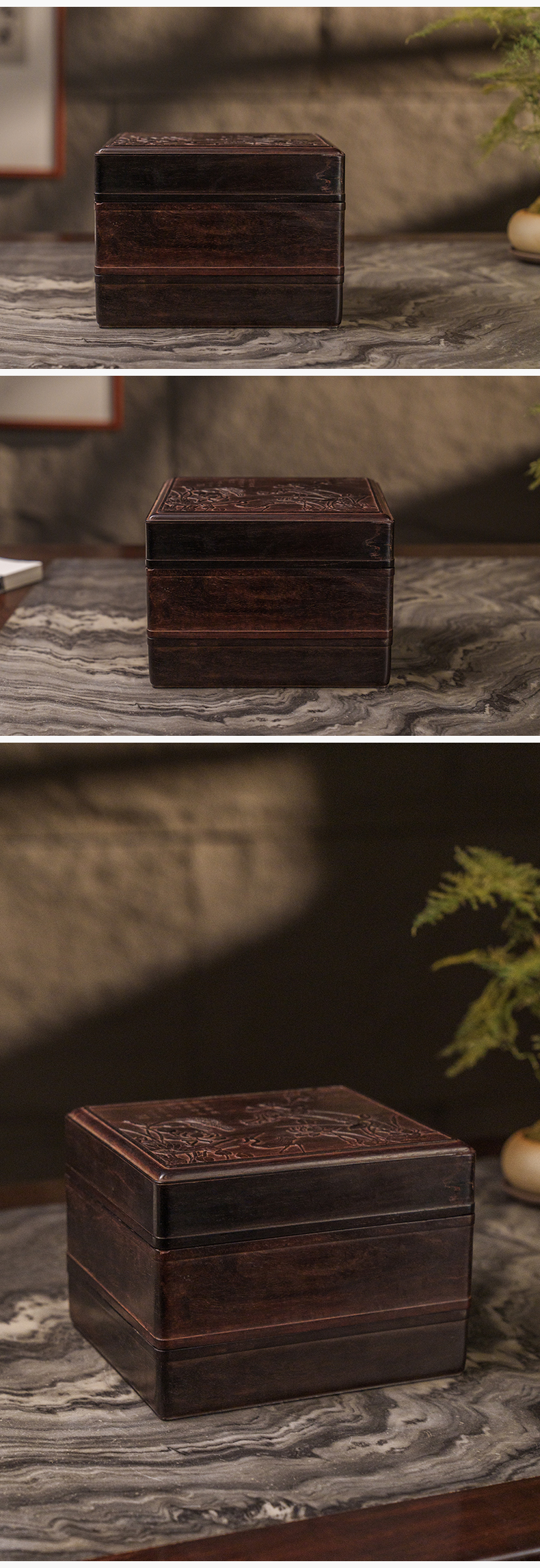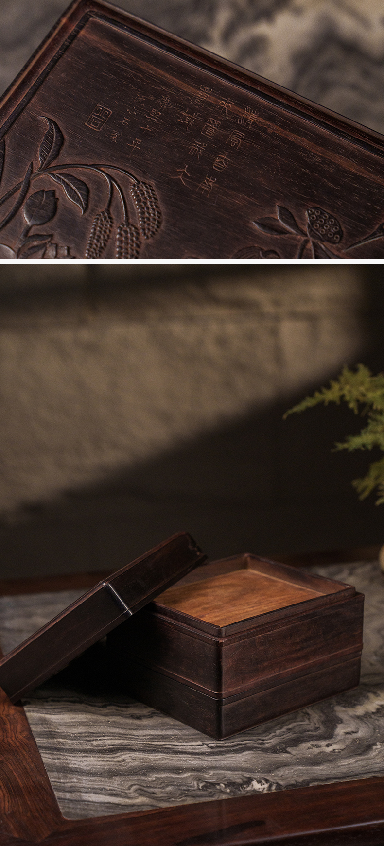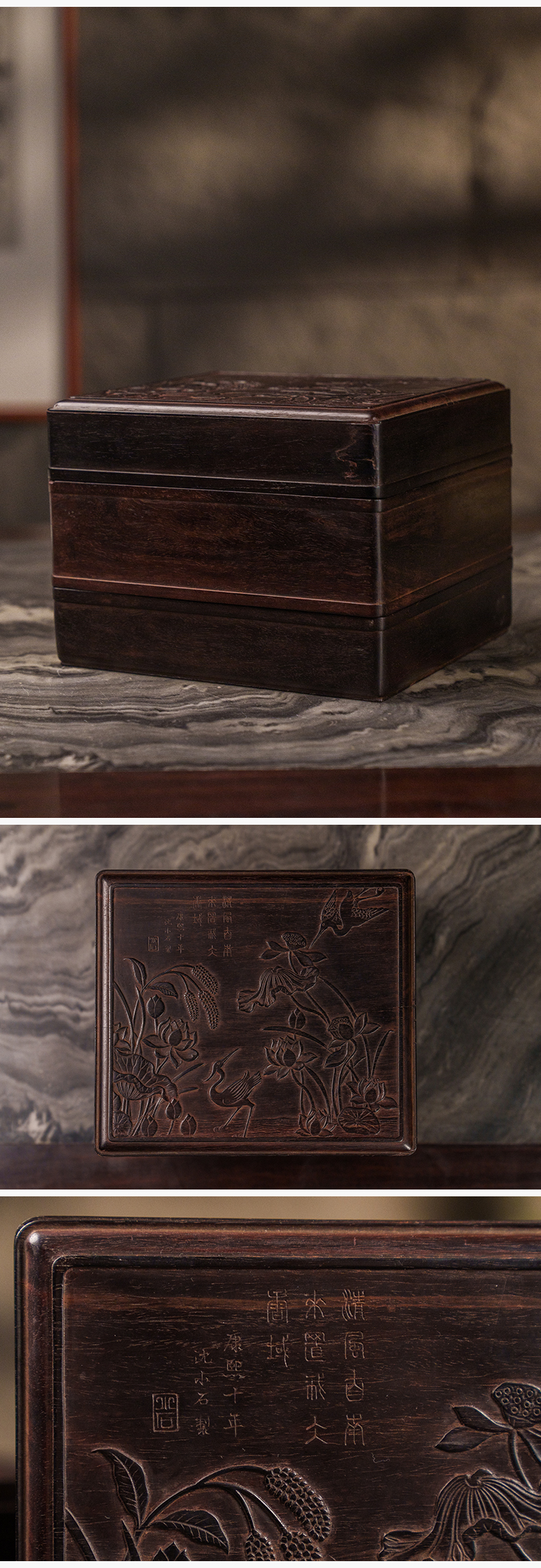 二十世纪 紫檀镶黄花梨雕一路连科双层盖盒