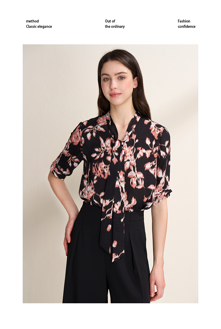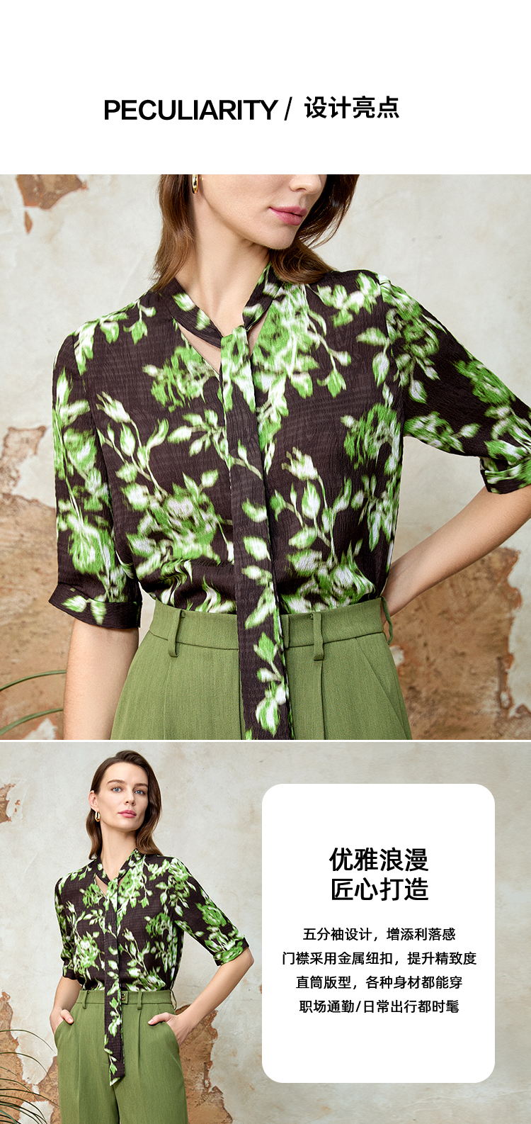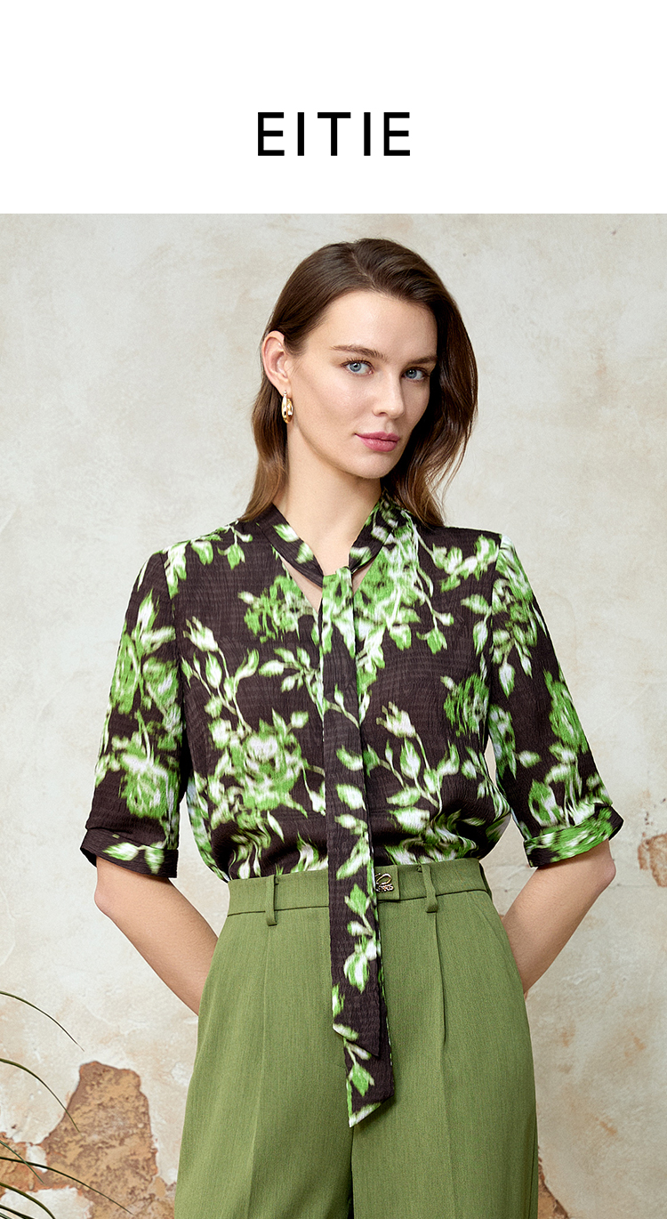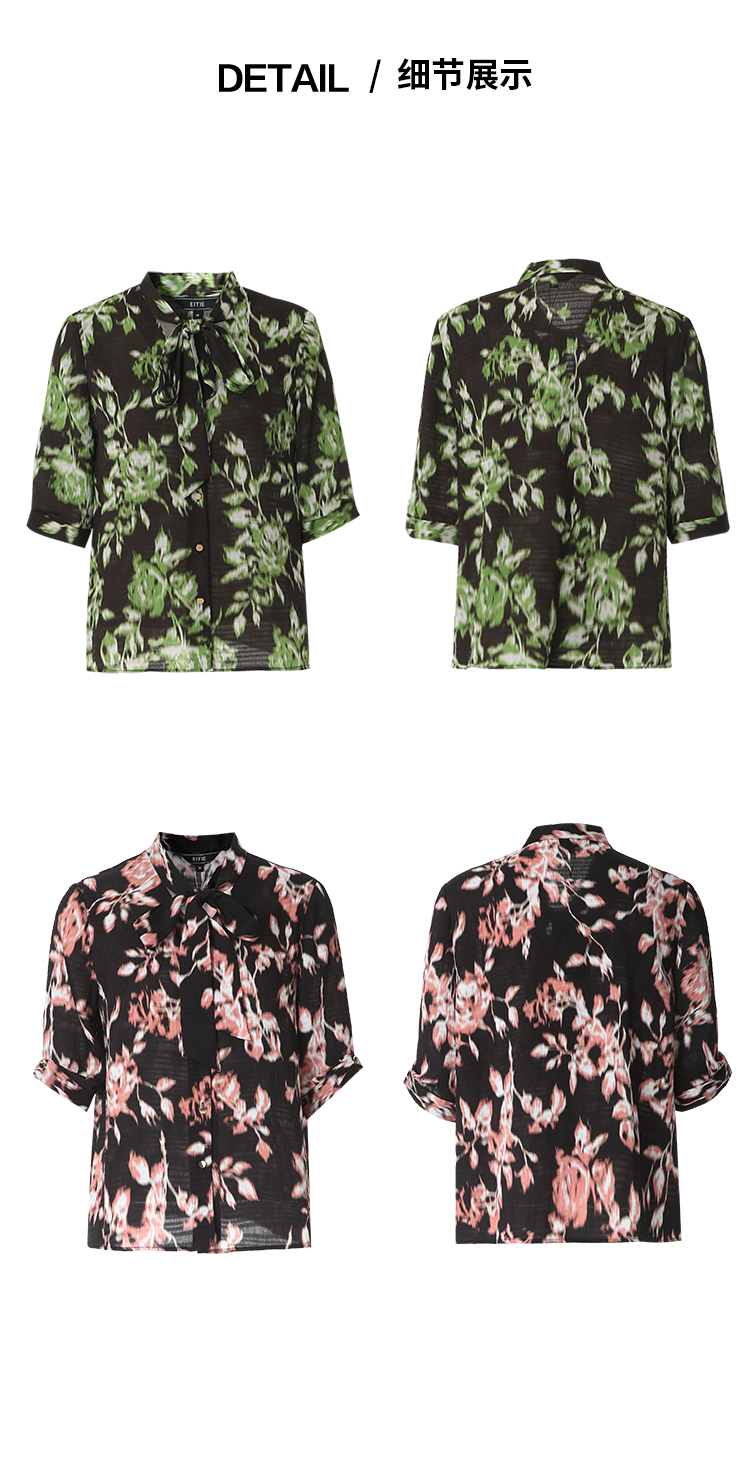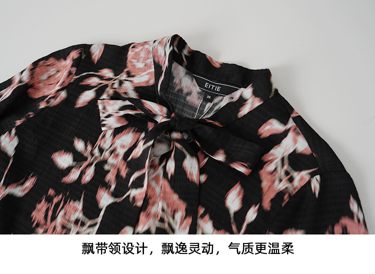 EITIE爱特爱复古飘带V领气质优雅印花中袖衬衫春季新款8109804
