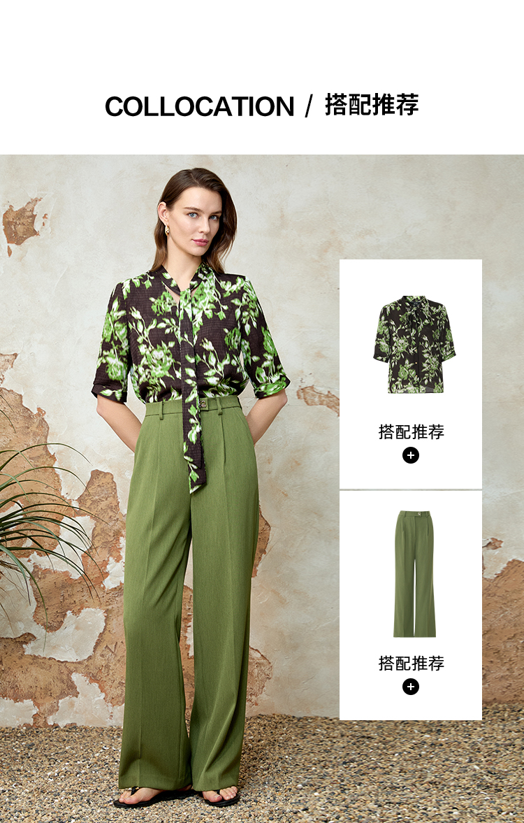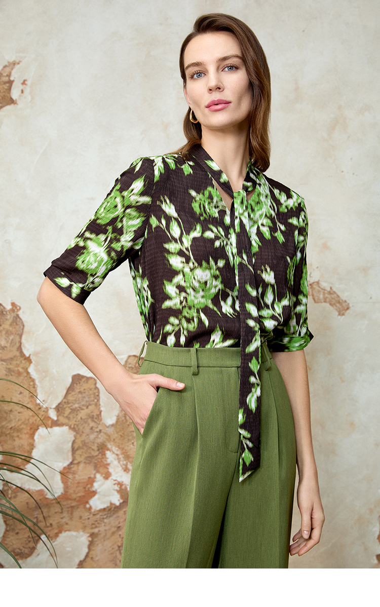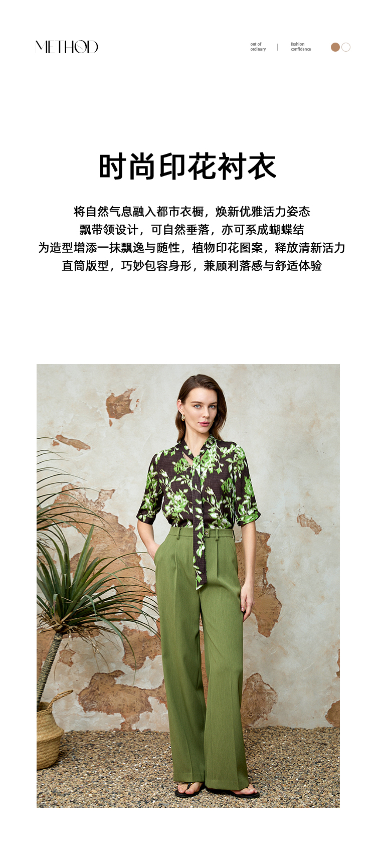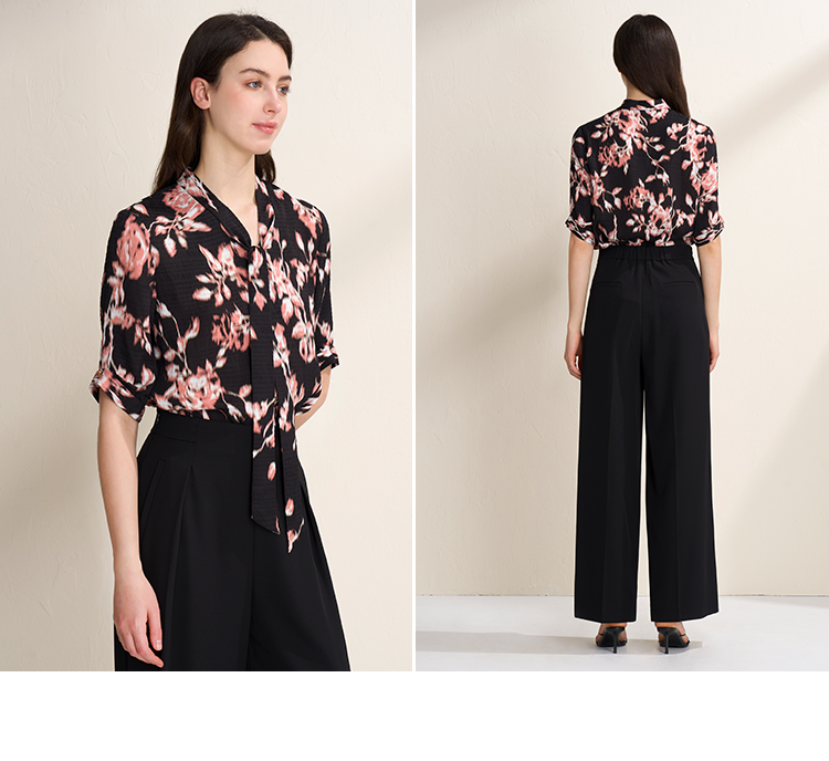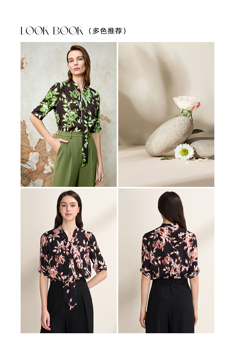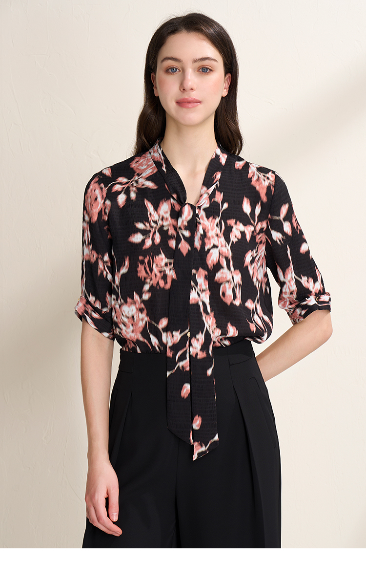 EITIE爱特爱复古飘带V领气质优雅印花中袖衬衫春季新款8109804