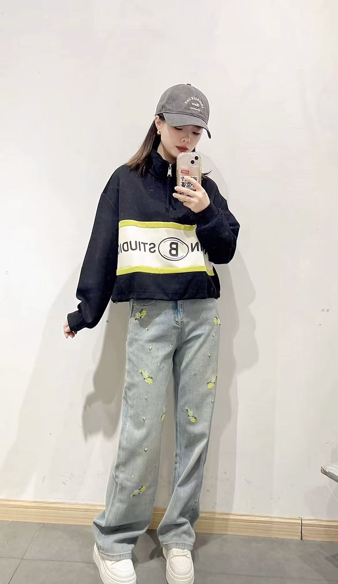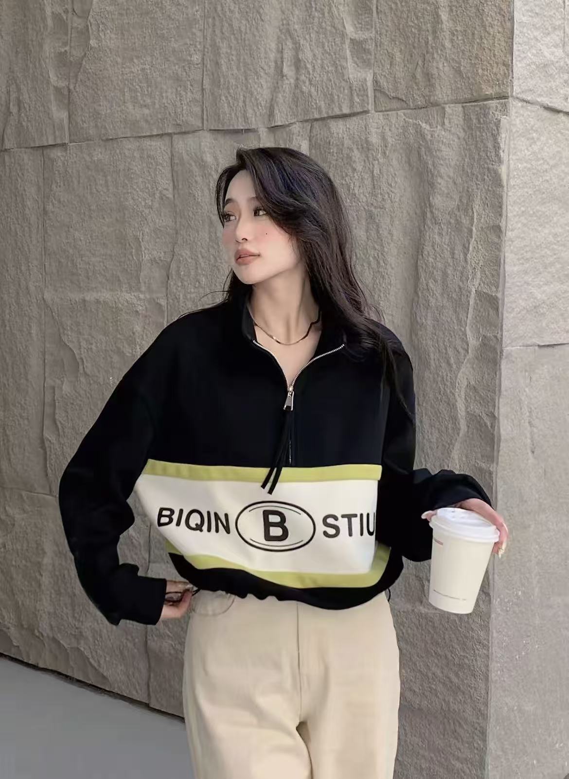 清货!!潮牌卫衣拼色半拉链下摆可抽绳宽松卫衣-喜出