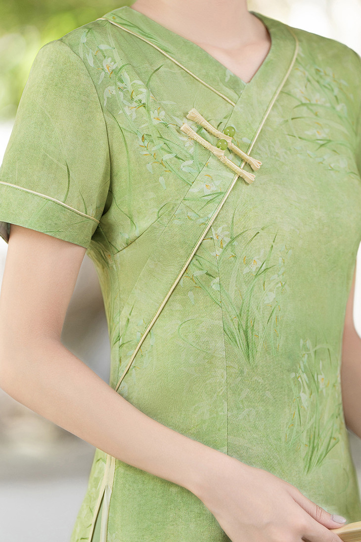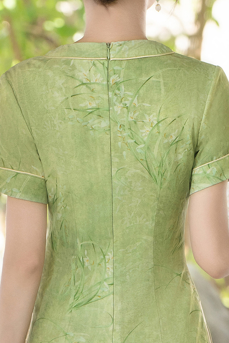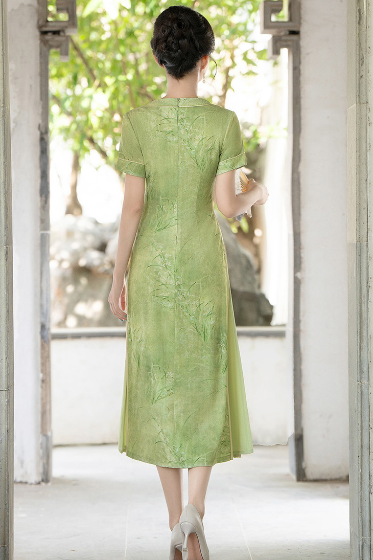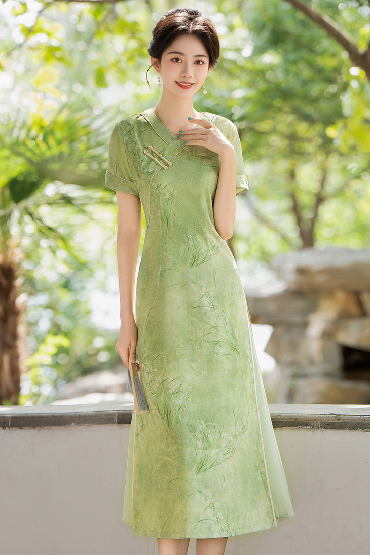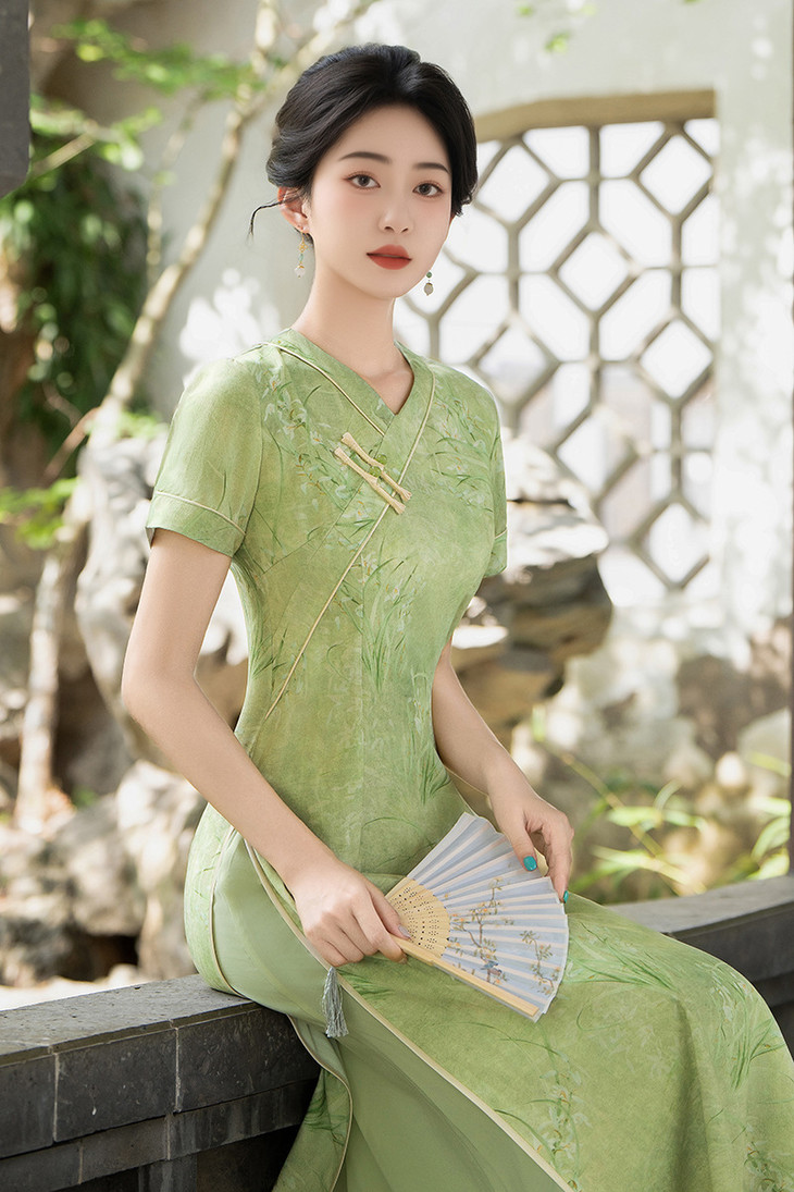 棉质绿色复古改良,V领奥黛新中式旗袍QMR-658