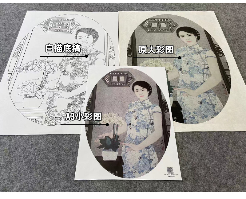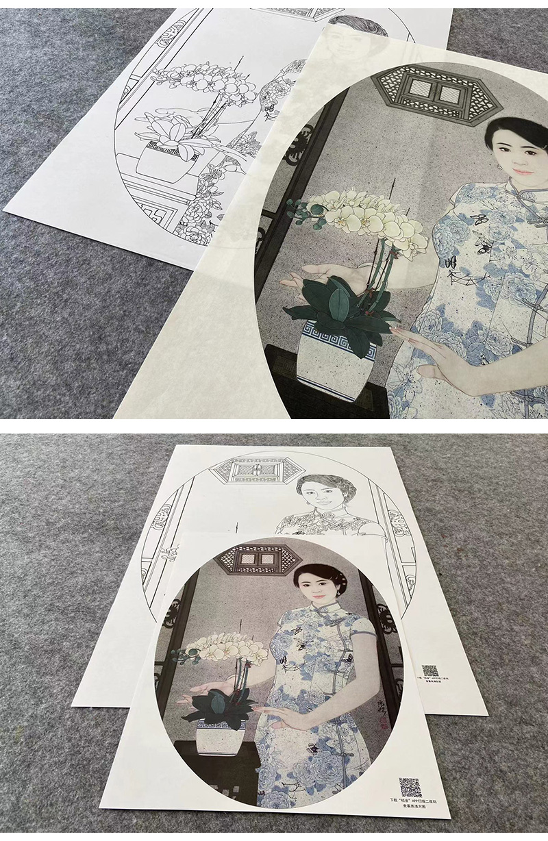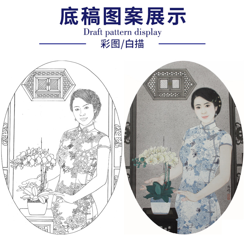 【大彩图】盘虎杰工笔画白描底稿小品《青花韵》现代人物高清打印稿HJ47