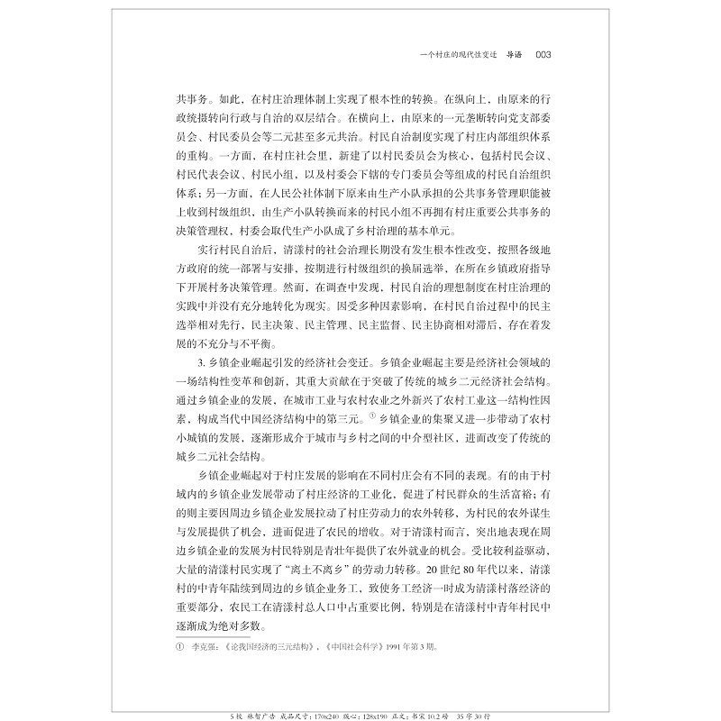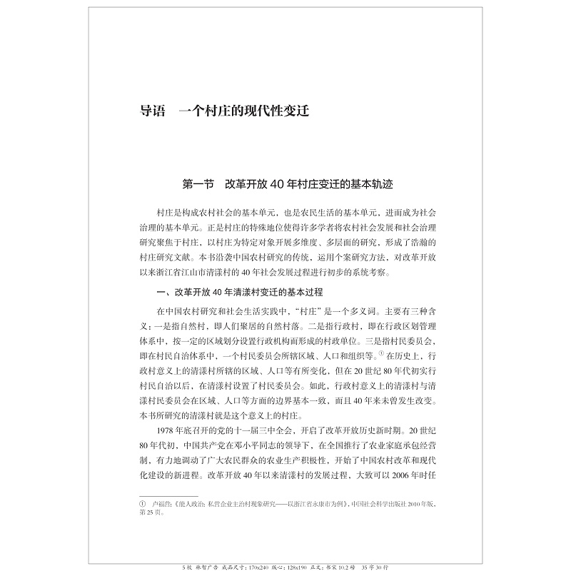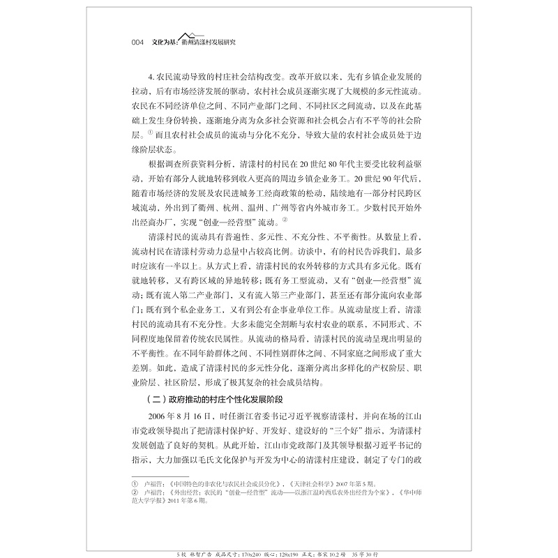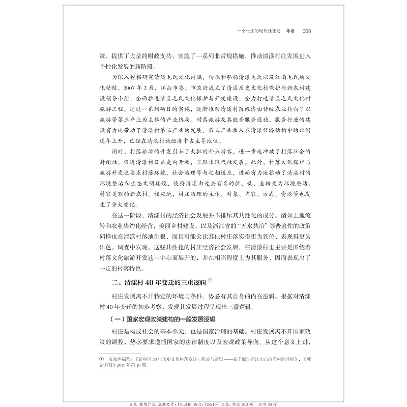 本书系“中国村庄发展的浙江样本研究丛书”之一。衢州市清漾村是江南毛氏发祥地,毛泽东的祖居地。本书基于村庄发展的客观事实,以2006年xp同志视察清漾村为标志,将改革开放以来清漾村的发展分为两个时期,从史地、经济、治理、文化、生态等层面,对40年的村庄发展进行了初步的系统考察。特别是对2006年来基于毛氏文化资源的保护与开发,发展村落文化旅游,促进文态、业态、生态融合,带动村庄全面发展的过程进行了全景式素描。剖析了清漾发展的三重逻辑,揭示了清漾发展的重要特色,探讨了清漾发展的样本价值与发展局限,提供了村庄发展的主要启示。