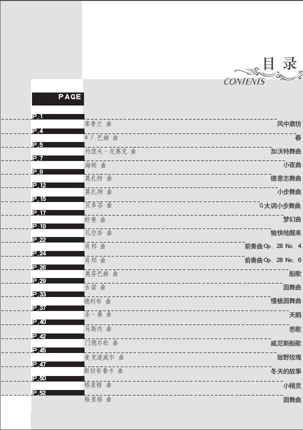 中外钢琴名曲(教学版)共三册,本册是第二册,内容适用于钢琴学习的初、中级阶段,相当于车尔尼849至车尔尼299程度,曲目大致按由易到难的顺序排列。曲目包含了古典时期、浪漫时期以及近、现代部分作曲家的钢琴作品。每首曲子均附有作者简介、音乐情绪提示、调性与曲式、演奏提示等简要介绍,供学习者进一步了解、掌握、学习乐曲。曲目包括《风中磨坊》《G大调小步舞曲》《威尼斯船歌》《冬天的故事》《木偶舞组曲》等。