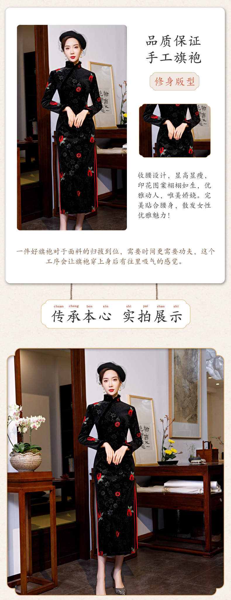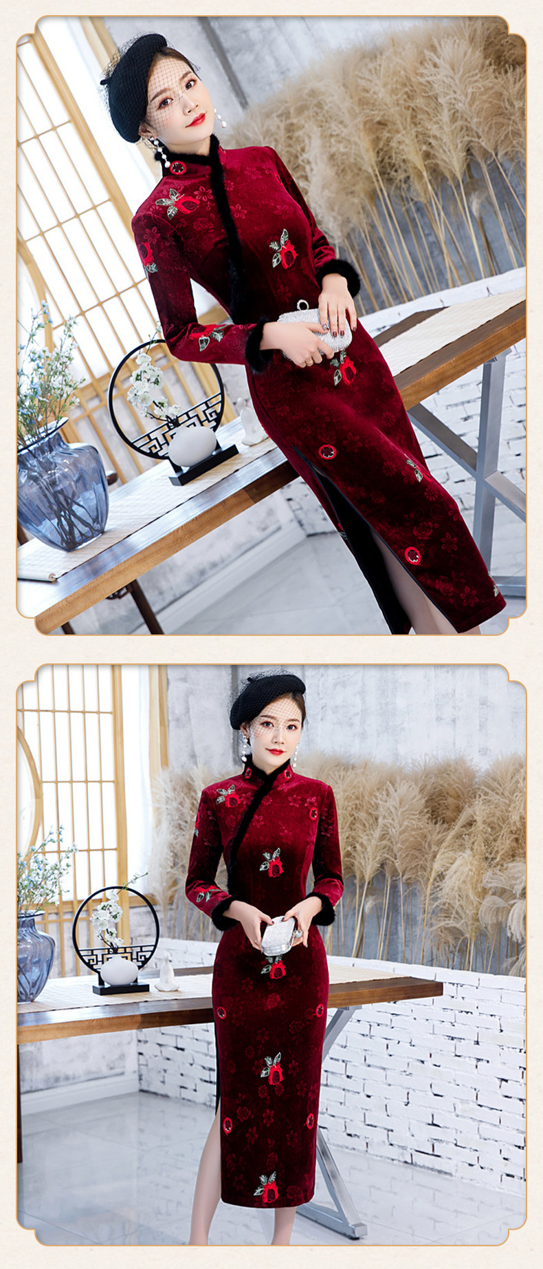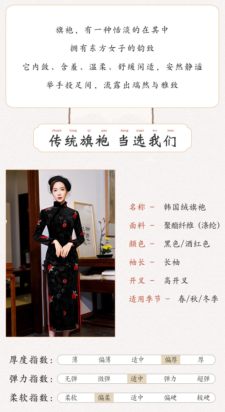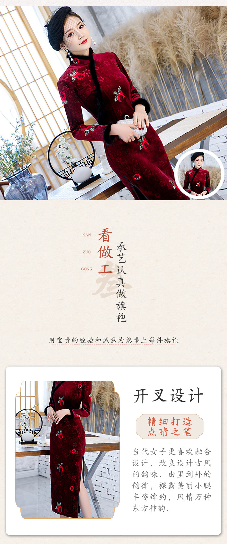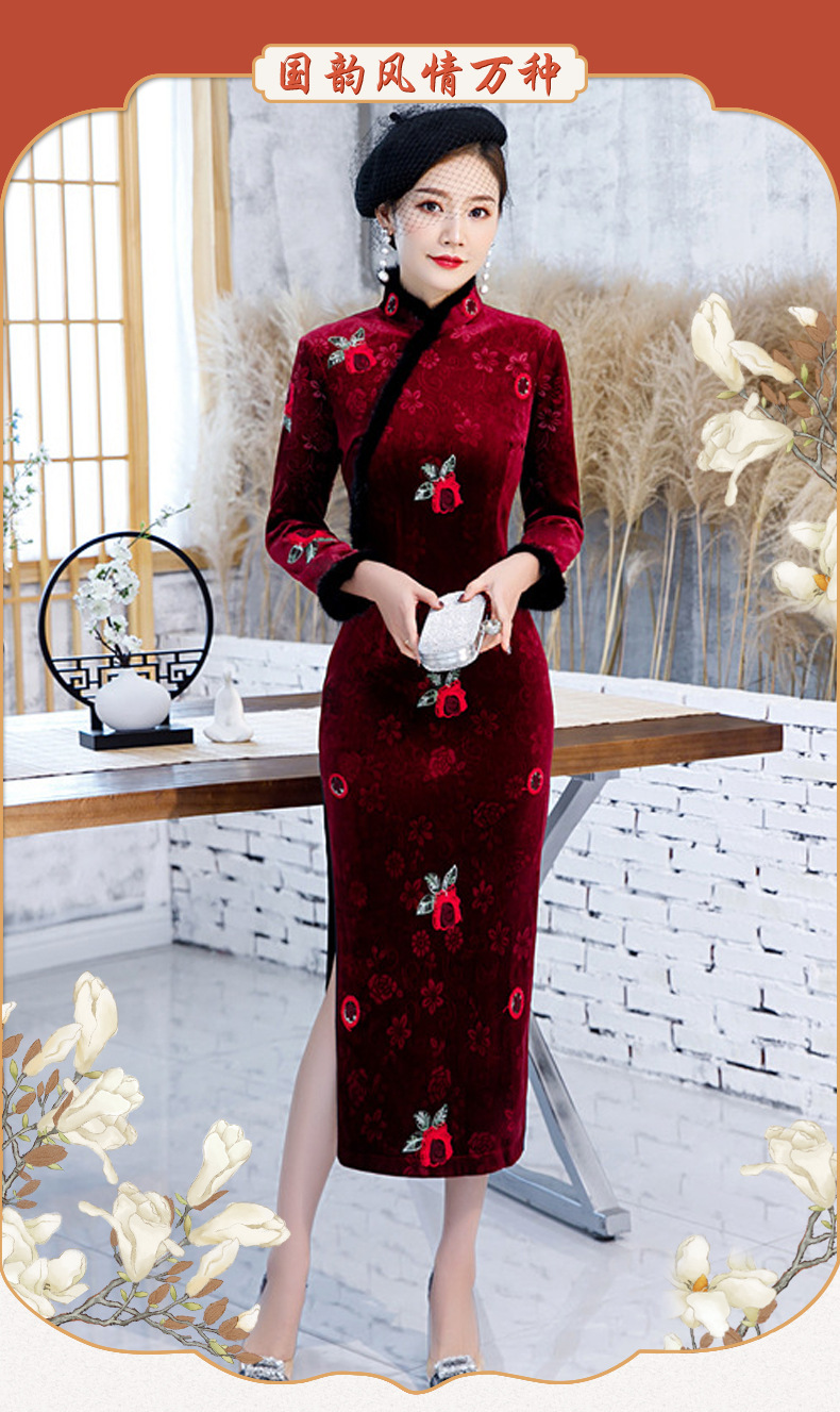 上海旗袍厂BJ-19347秋冬新款韩国绒长款加厚少女旗袍裙 修身显瘦改良旗袍连衣裙