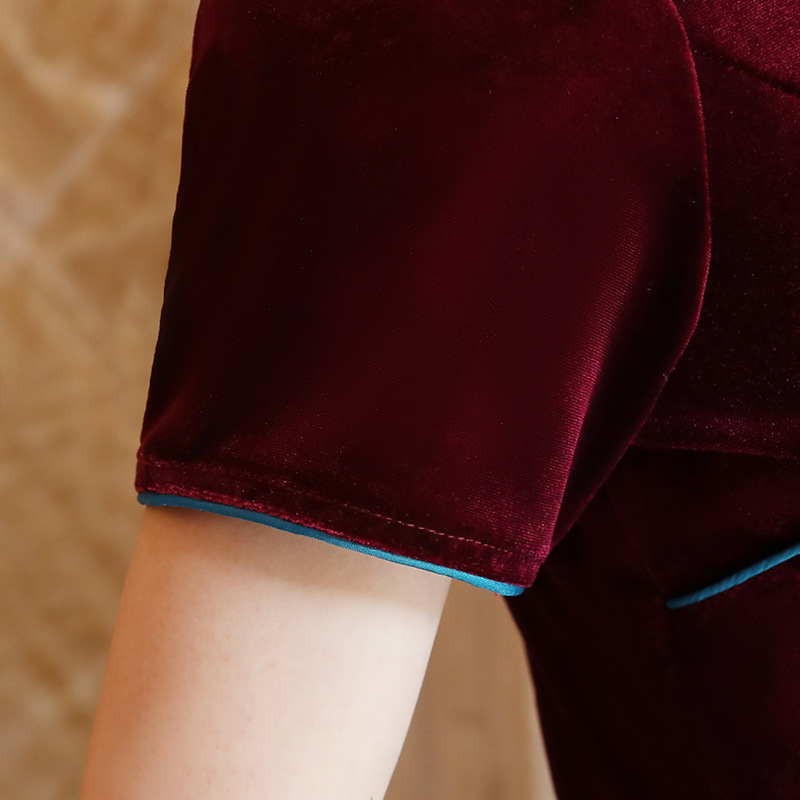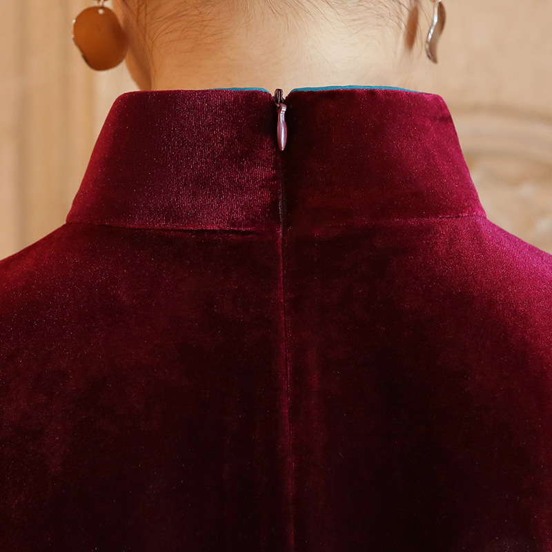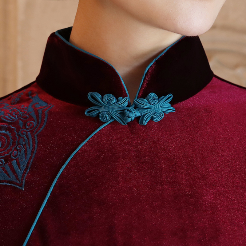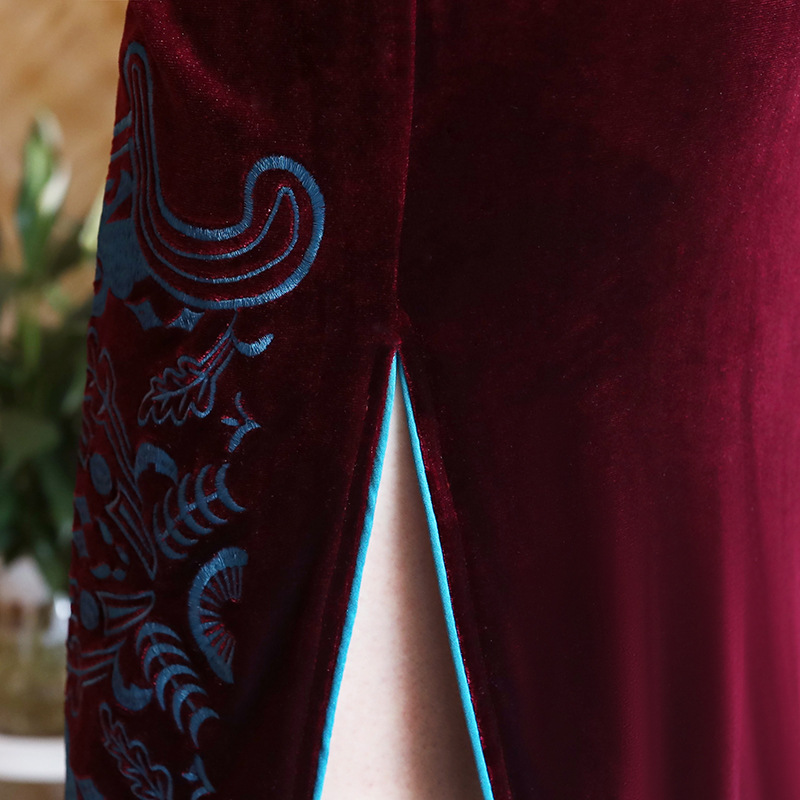 SDSJ218新款优雅气质修身显瘦立领短袖中长款丝绒绣花旗袍裙