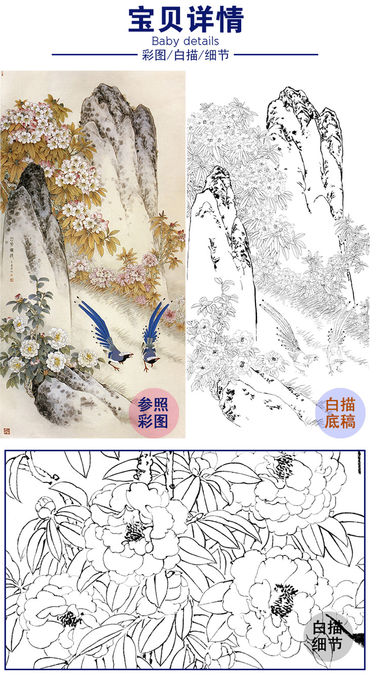 四尺六尺竖幅工笔花鸟白描底稿-王庆升《山花灿漫》-多种白描尺寸可选-RT08