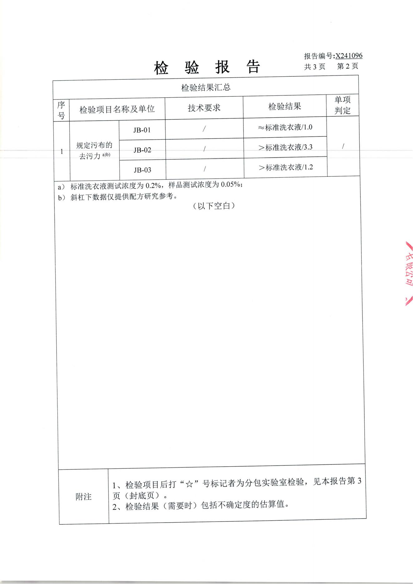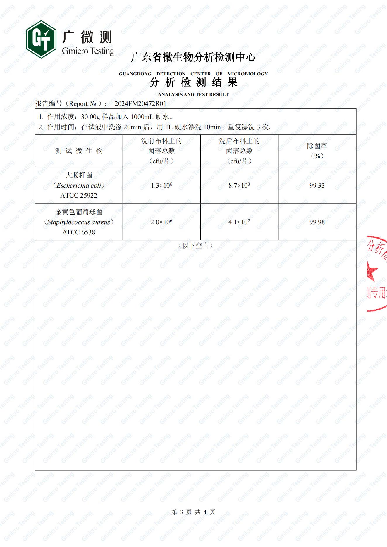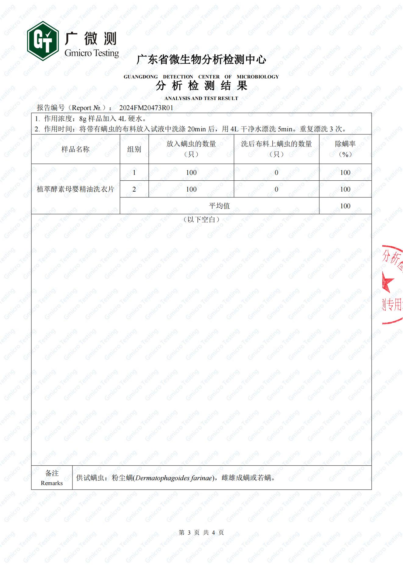 这款洗衣片也做了化学成分检测、净污能力检测、除菌检测、除螨检测。