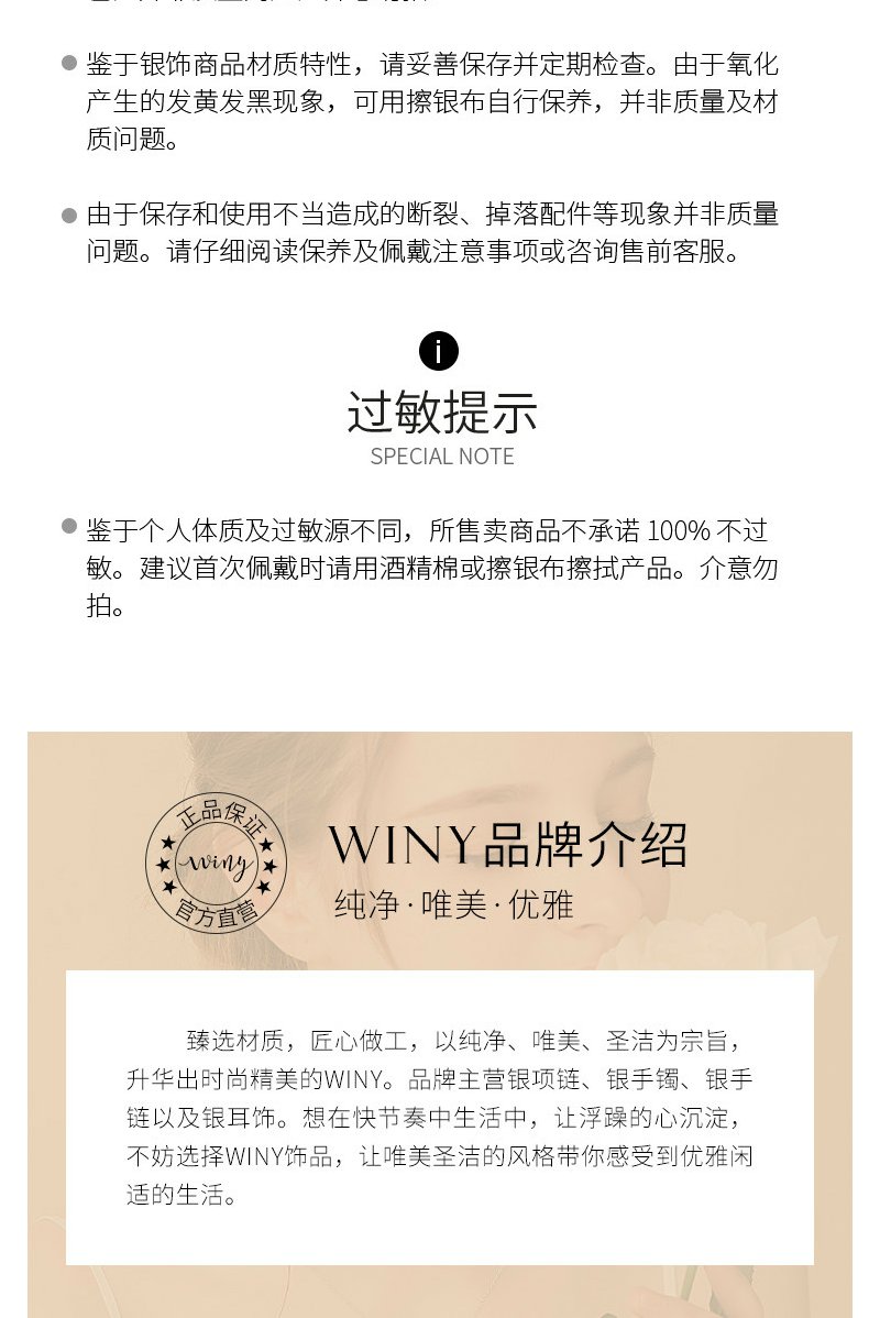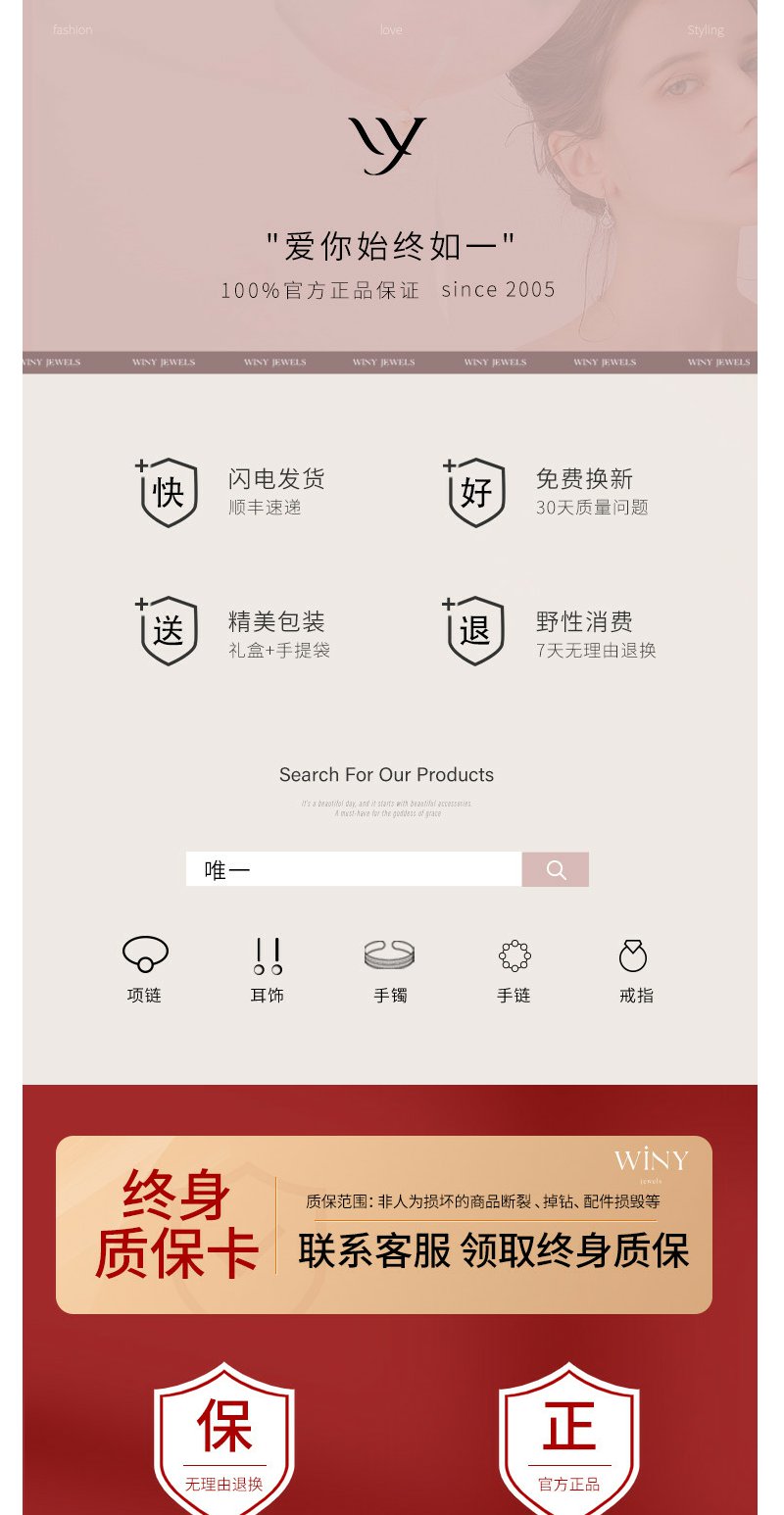 唯一winy是国内网络饰品品牌的先行者。 创立初衷源于对亲情、爱情、友情的珍惜唯一,用心做好每一件饰品为您守护人生中如珠宝般珍贵动人的那些时刻那怕岁月流转,唯爱始终如一。