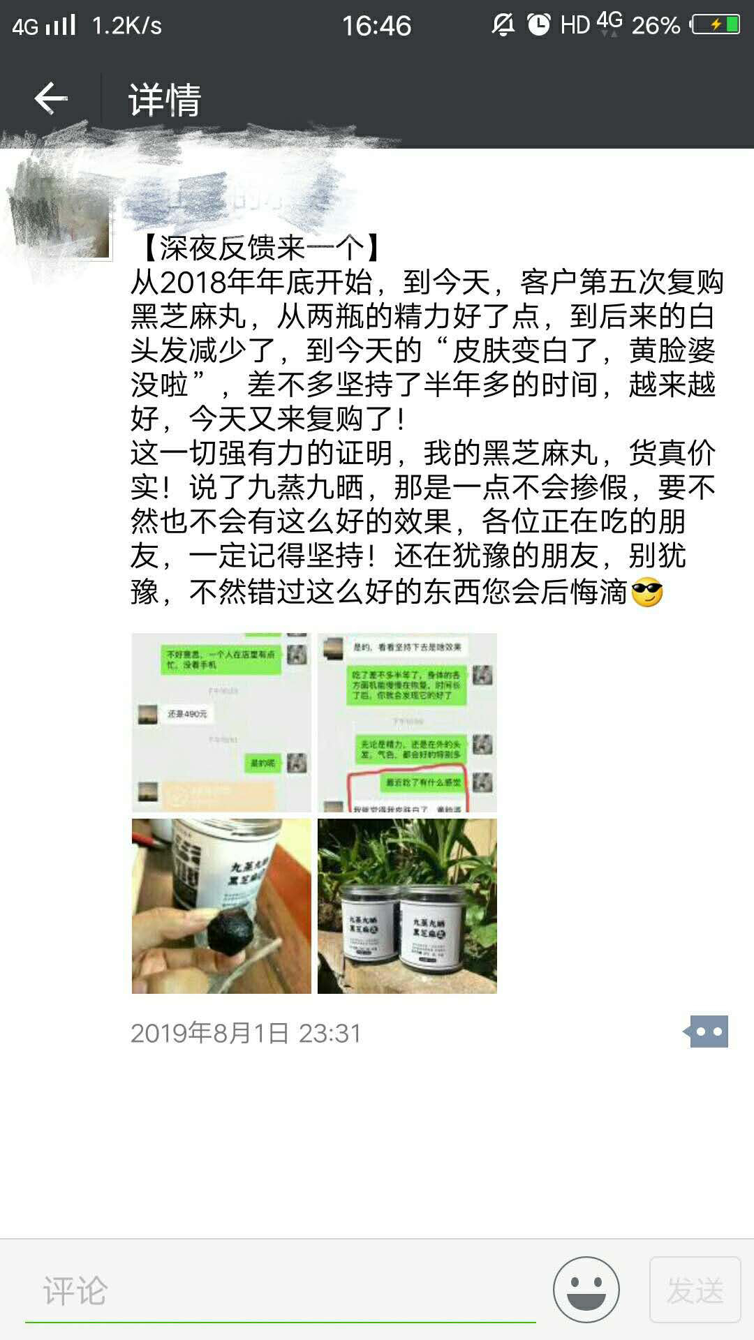 一句话介绍产品:黑芝麻丸,但凡知道这个品的,其实都是知道的,我这里不方便多介绍,而且必选九蒸九晒,市面上九蒸九晒基本分2种,价位便宜的,这个都不想讨论直接略过,价位高的基本都差在工艺和时间成本上面了,二象限这个九蒸九晒,是经过道家师傅指点,严格遵循节气、天气,基本70天才能完成一批的制作,可想里面的成本,吃上一段时间,会有一些感觉。产品特点:1、原料芝麻,生态农场的老品种黑芝麻,亩产只有50斤2、九蒸,凌晨四点开始,每次蒸的时间属于保密工艺,严格用土法柴火,一点一点温润,水选用也讲究,要求回甘3、九晒,特别挑剔天气和时辰,所以这个很难出量4、研磨尺度要掌握好,不然出油多,成型不了5、蜂蜜严格控制量,尽量有效的使用芝麻丸基础信息:规格:450g/罐颗粒数:45颗粒生产日期:近期10天内保质期:半年发货时间:1-3天
