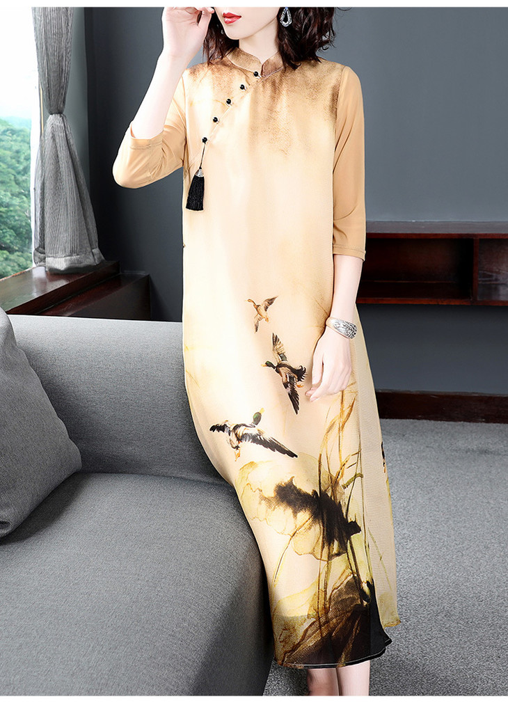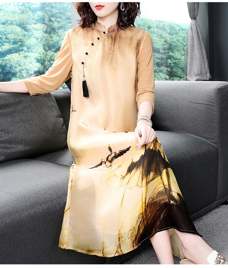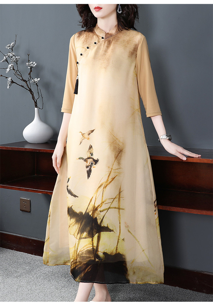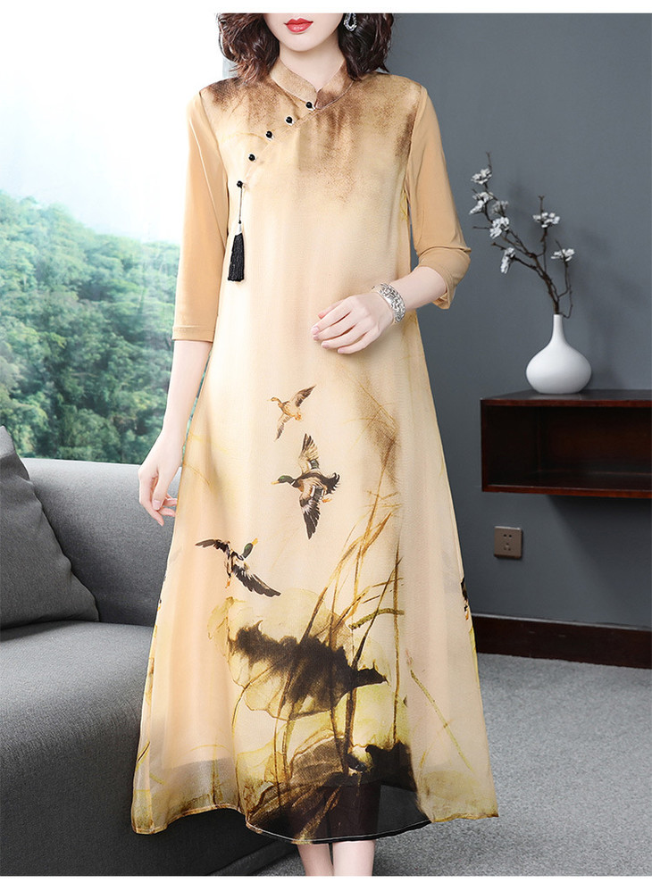 立领盘扣,真丝欧根纱印花连衣裙KDS-683