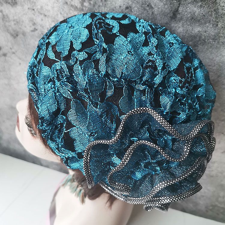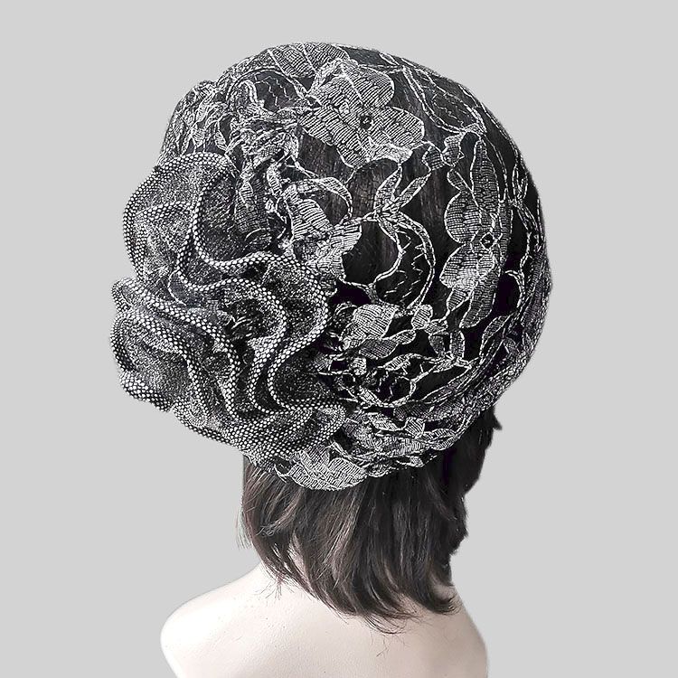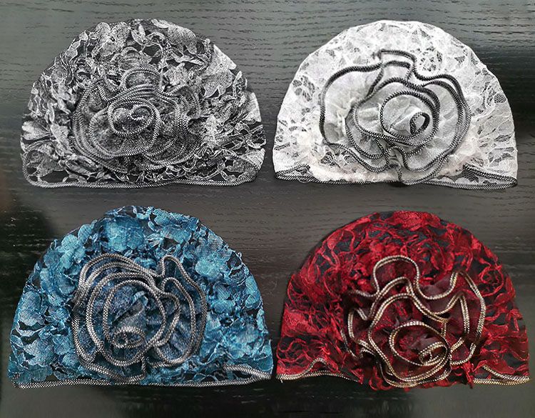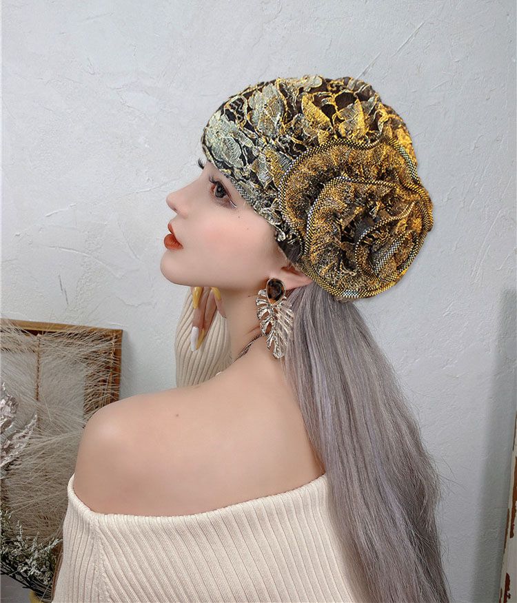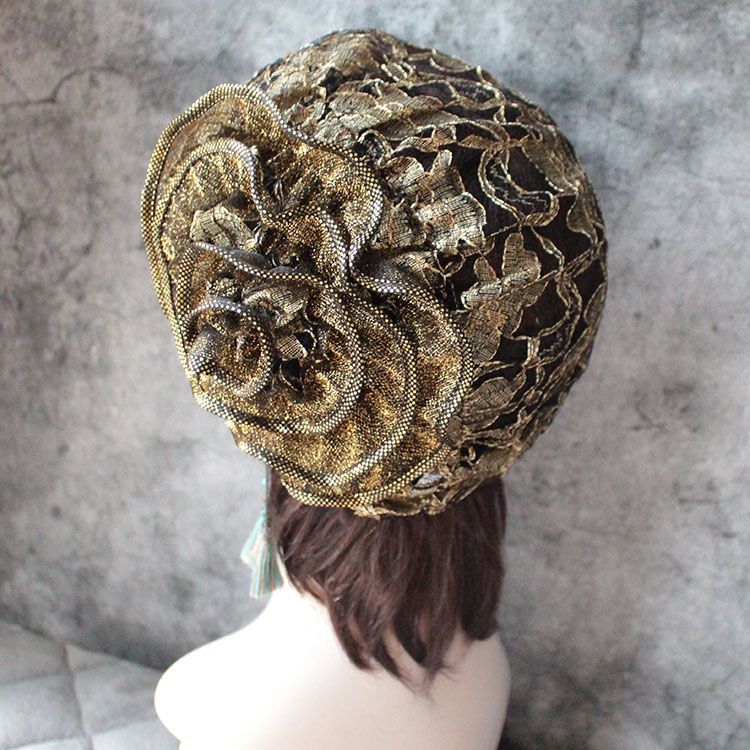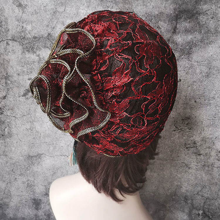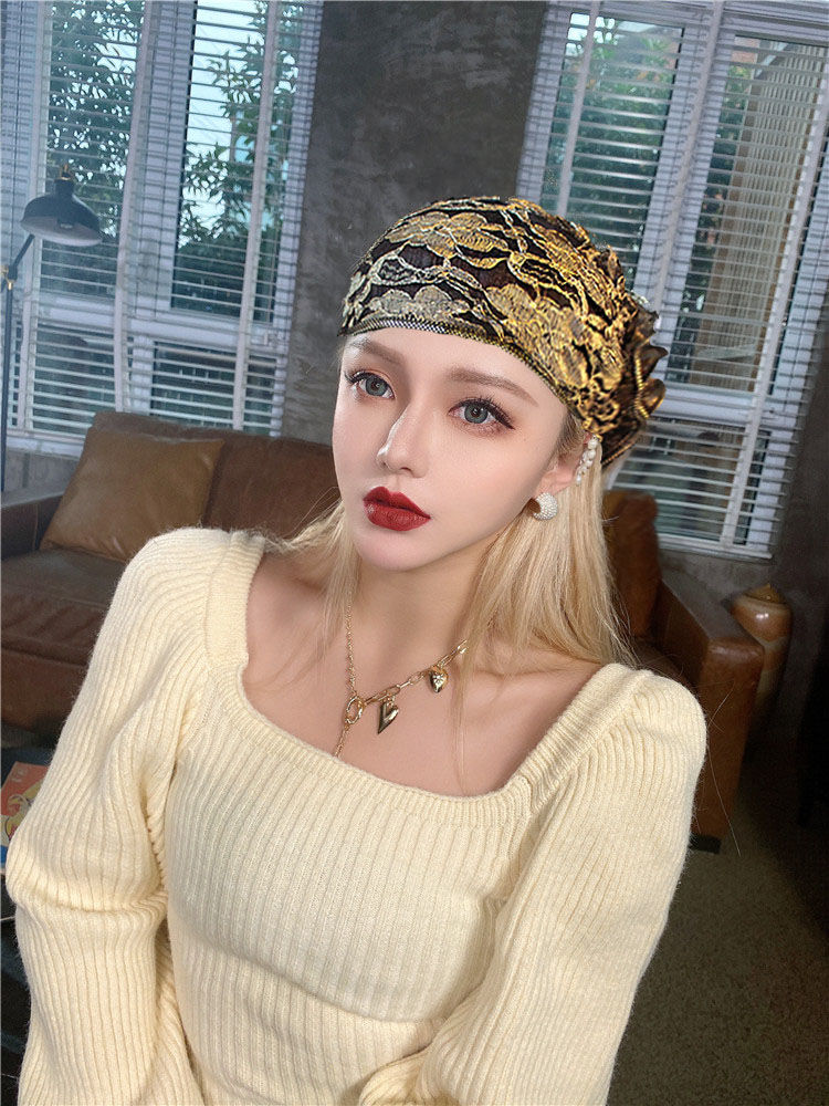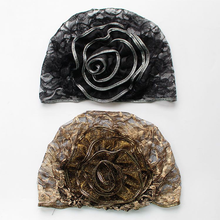 DD-新款复古镂空蕾丝头巾帽洋气大花朵包头帽遮白发薄头套女帽子