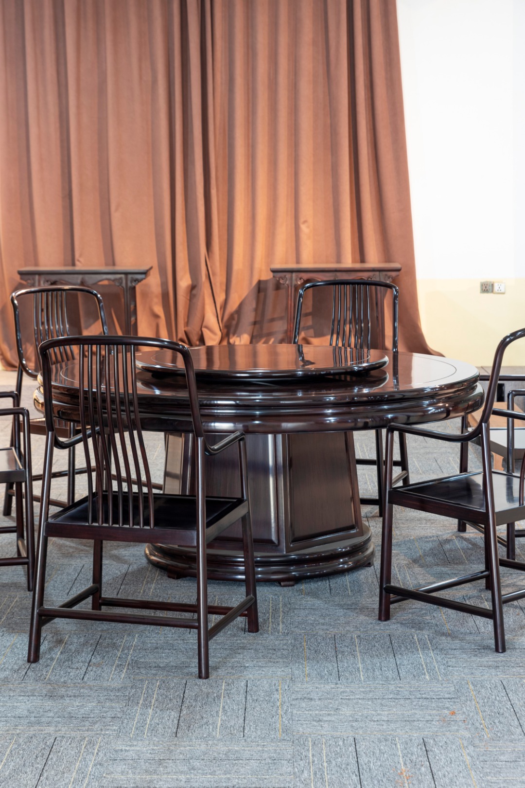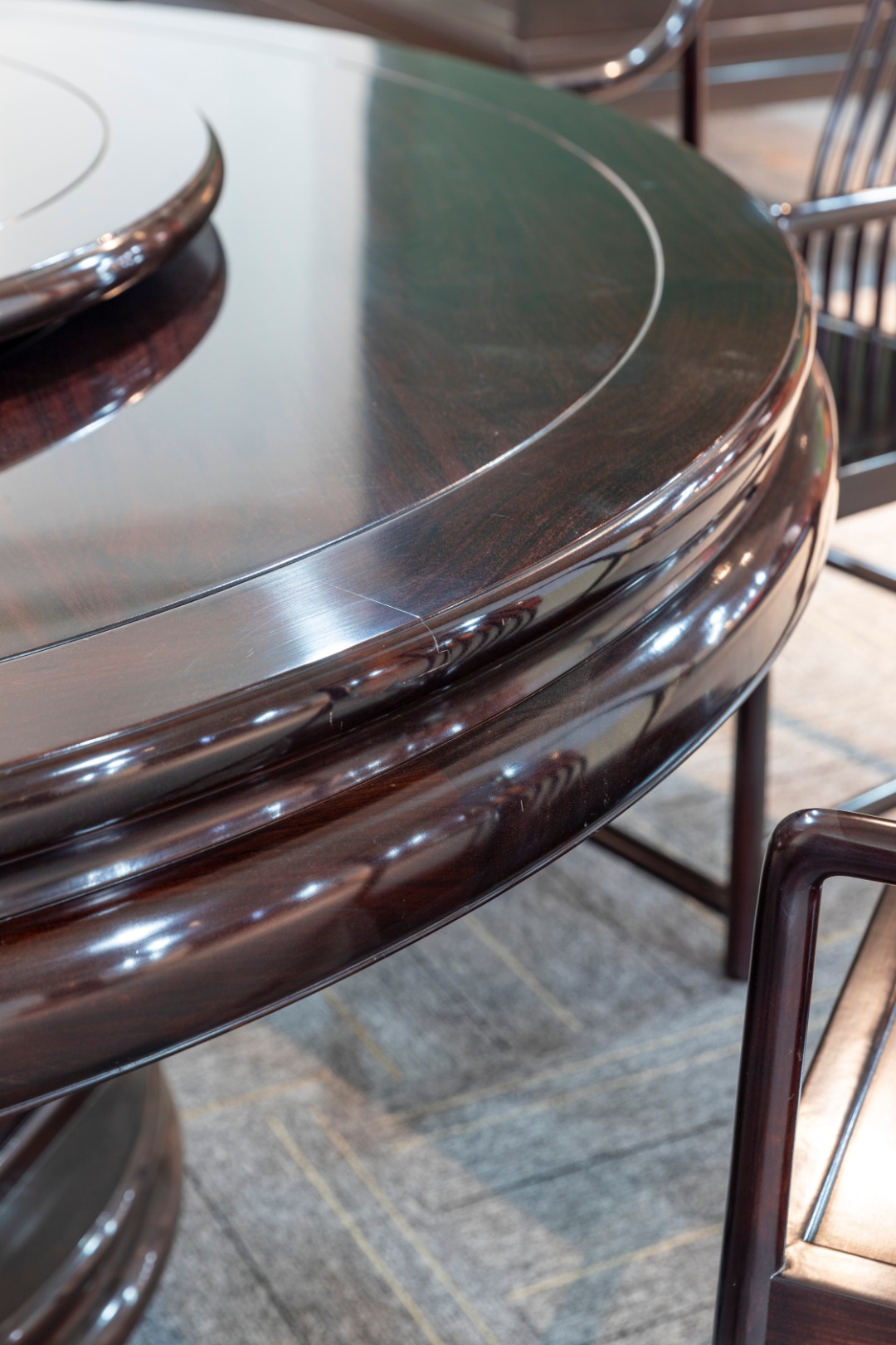 这款素边圆餐桌,牙板加厚,有束腰,圆形象征家庭幸福吉祥;束腰面板下挂牙结构是非常受力的,整器同层餐台同料所开,寓和谐同心;大小规格围坐适合不同人数,家人围坐,团结情感,共享美味佳肴,其乐融融;底座采用传统步步高升的六角底座做法,十分稳固。搭配灯挂椅,适宜大部分城市生活空间。