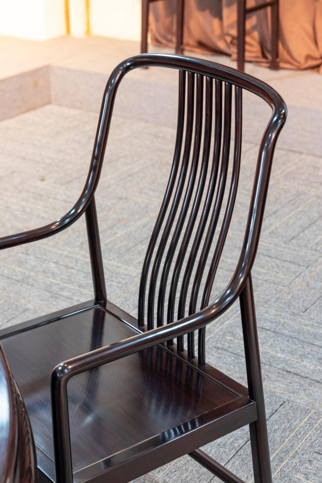 嘉选 梳背椅:此扶手椅,风格疏朗通透,富现代气息。以缅甸花梨木制作,全器除座面为四面平的方材、腿足外圆里方外,通体框架采用圆材,整体方圆结合。三弯靠背采用曲棂式样,搭脑与扶手的线条柔婉,以烟袋锅榫结合。座面硬屉为独板,用料考究。四腿八挓,腿间安步步高赶枨。整器高挑,造型呈梯状,给人稳定之感。