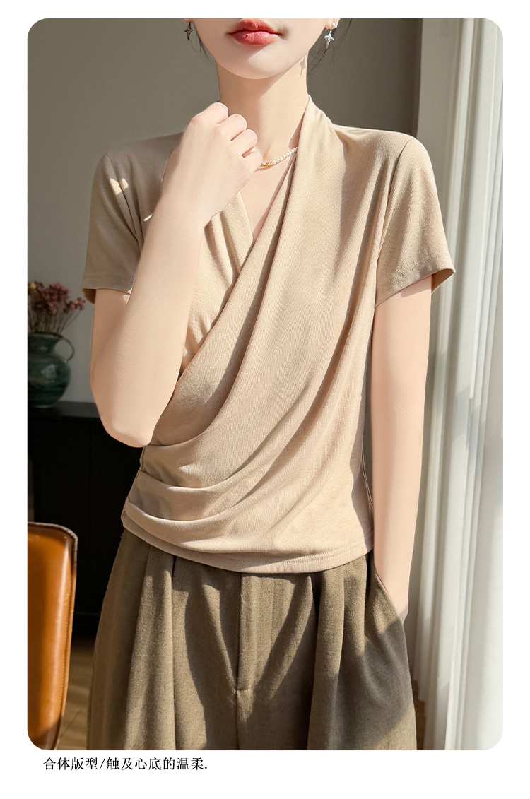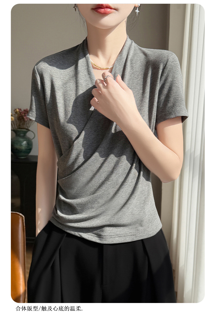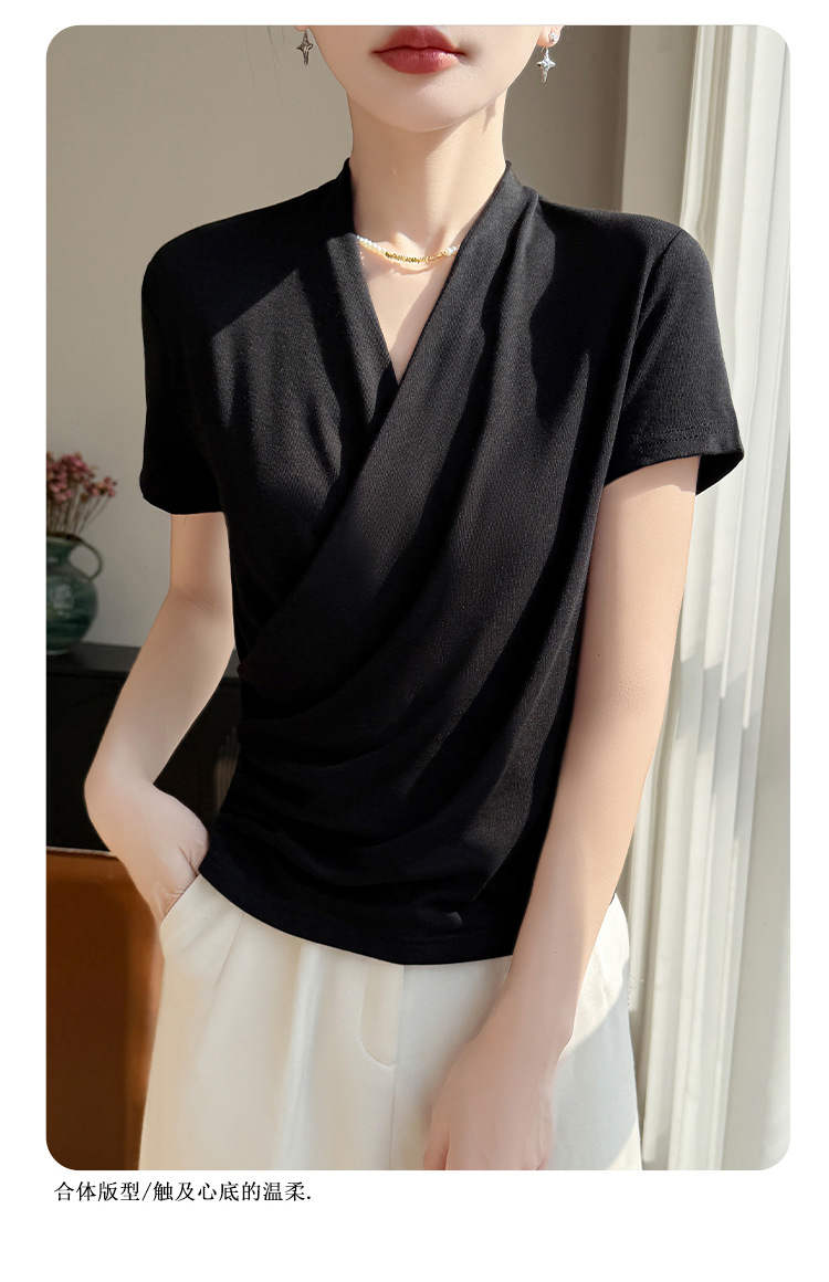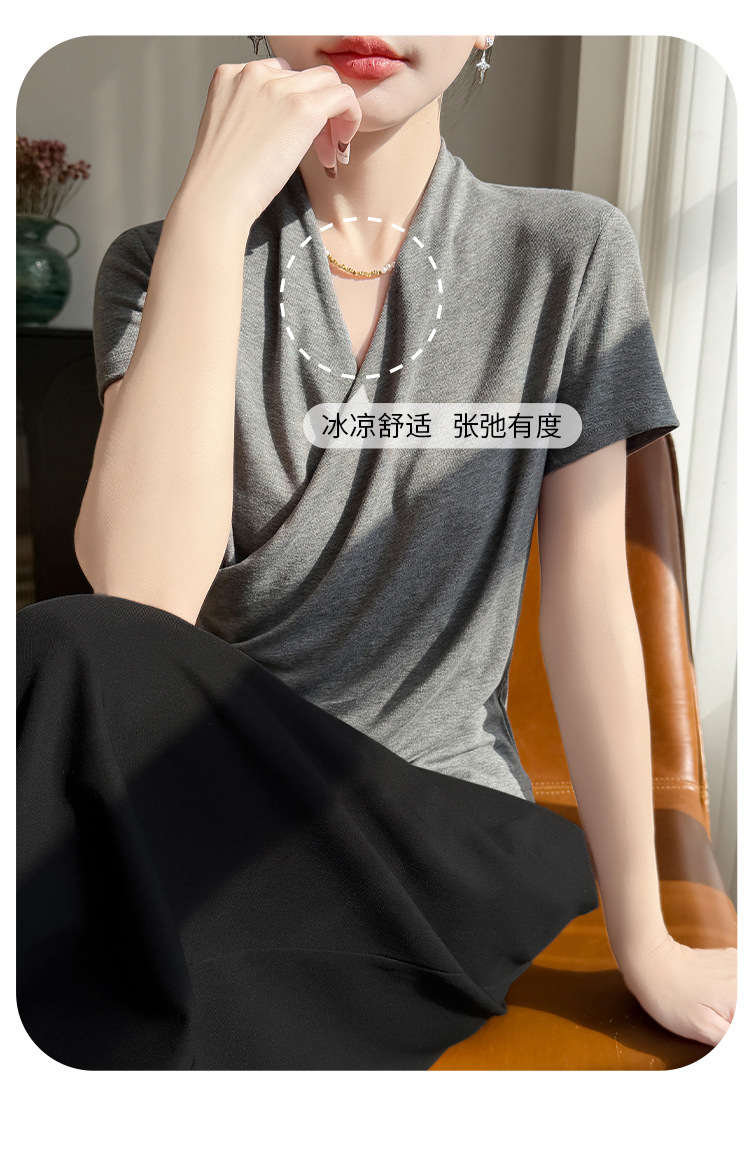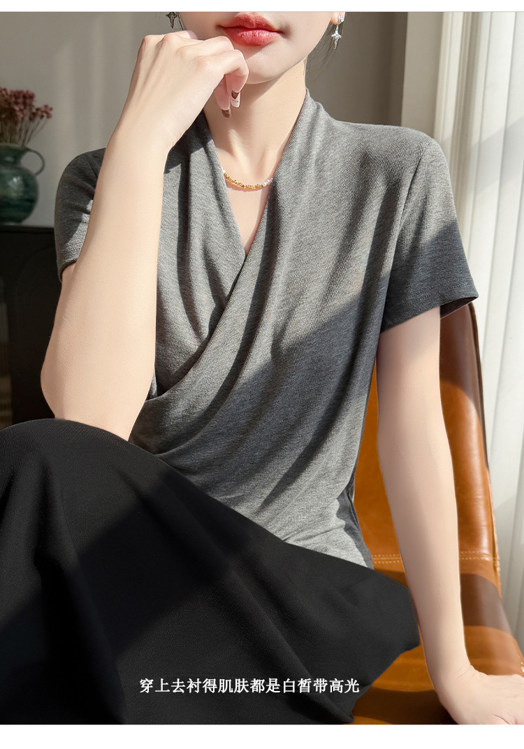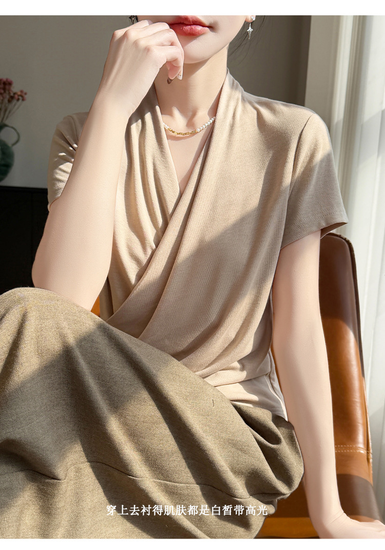 百媚生 精纺莱赛尔法式V领纯色交叉气质时尚短袖T恤YT-A311