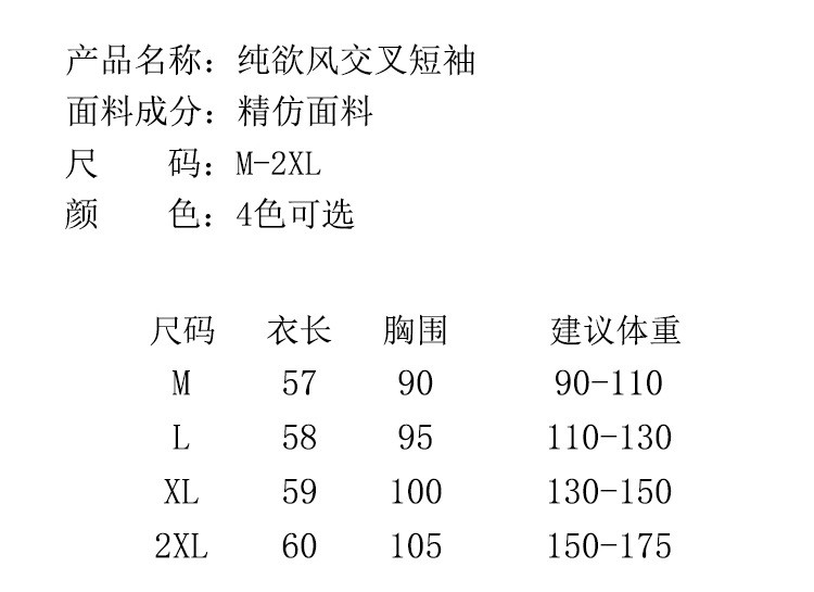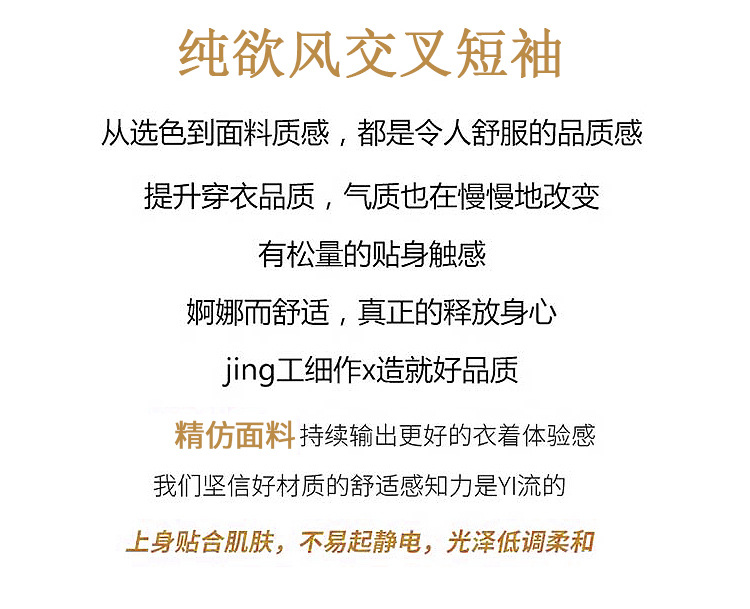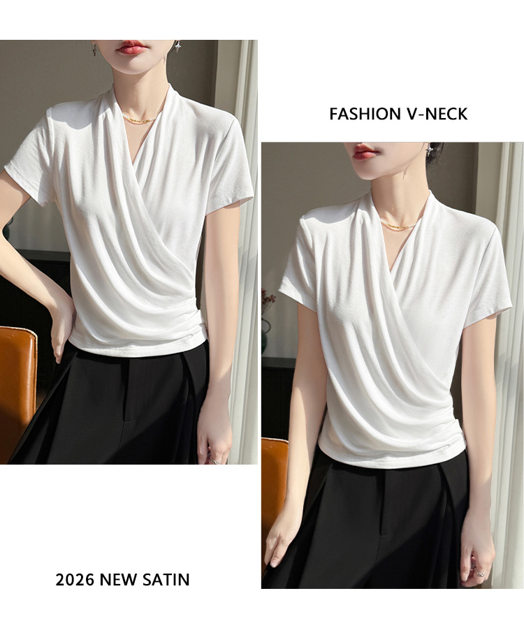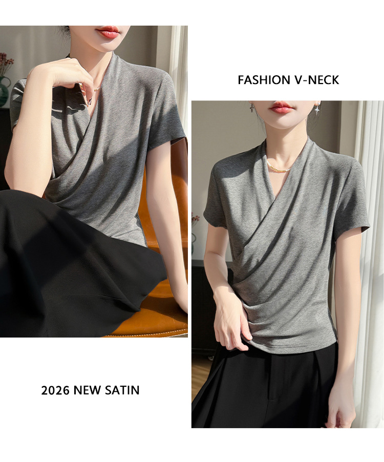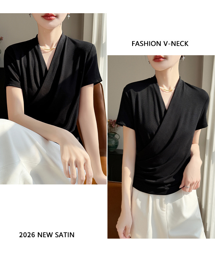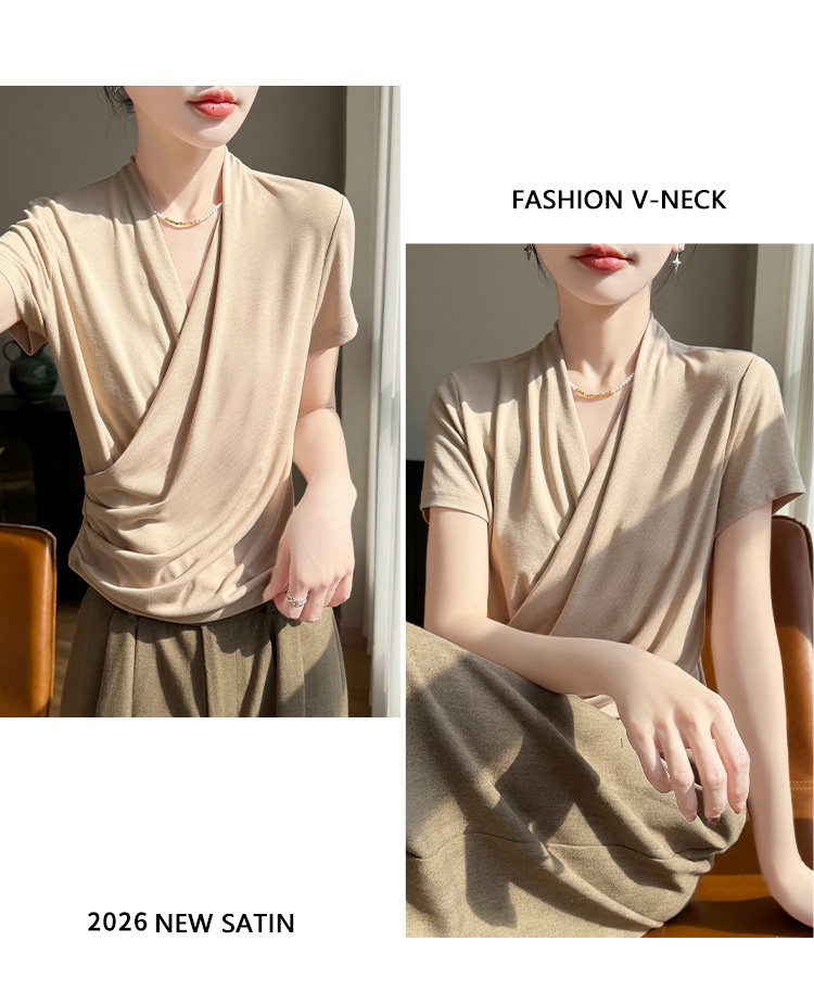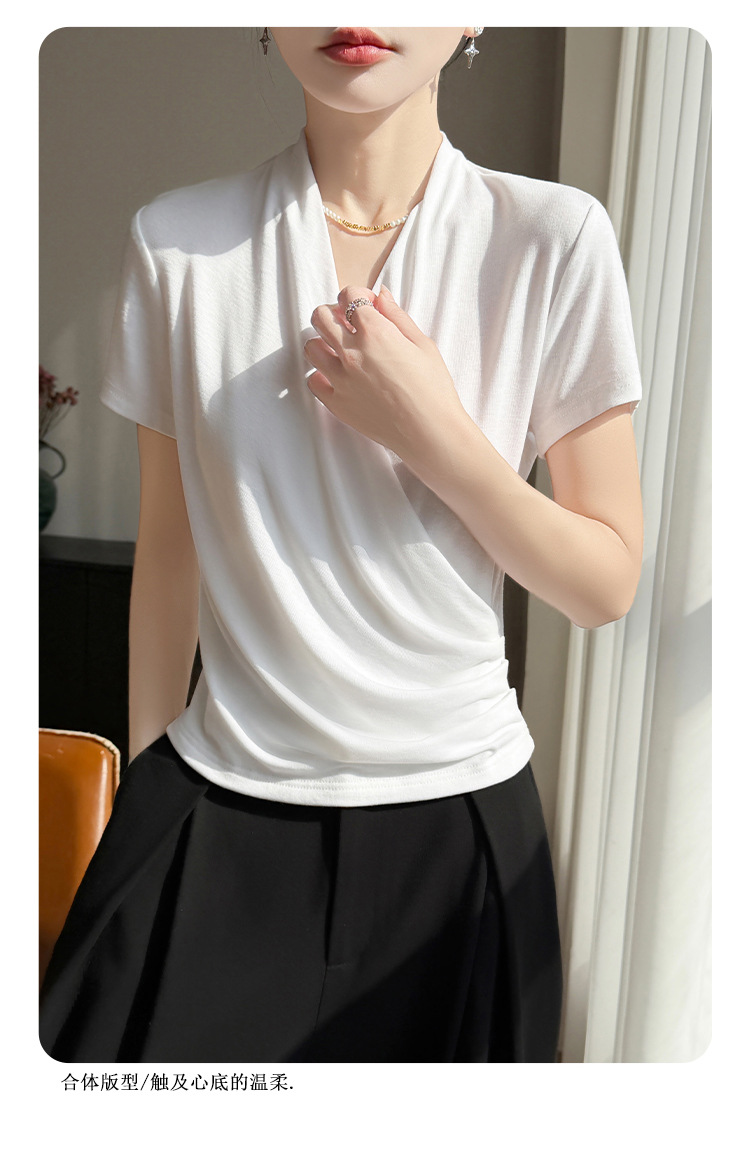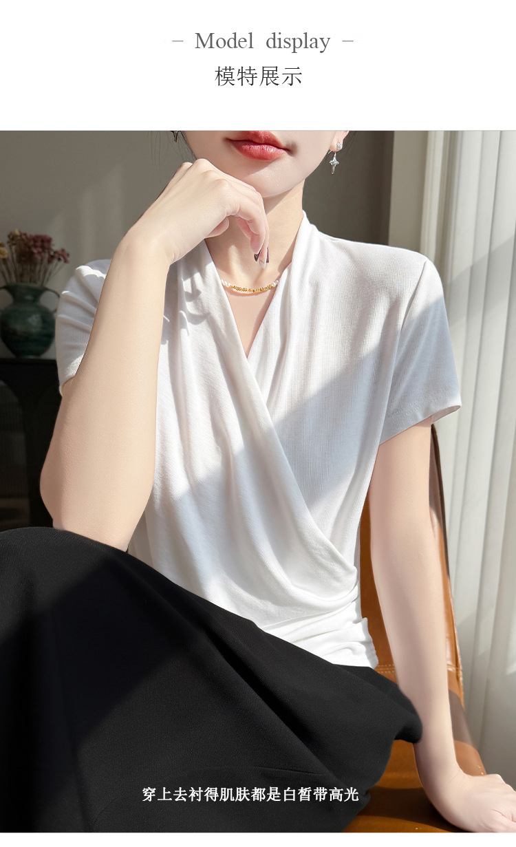 百媚生 精纺莱赛尔法式V领纯色交叉气质时尚短袖T恤YT-A311