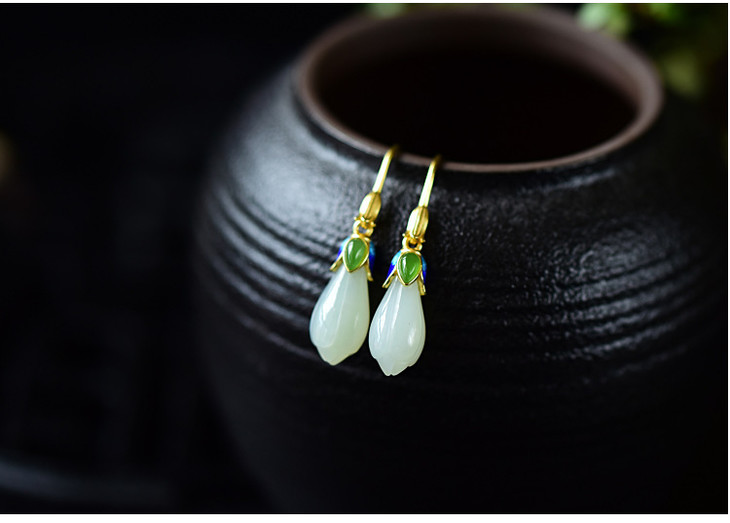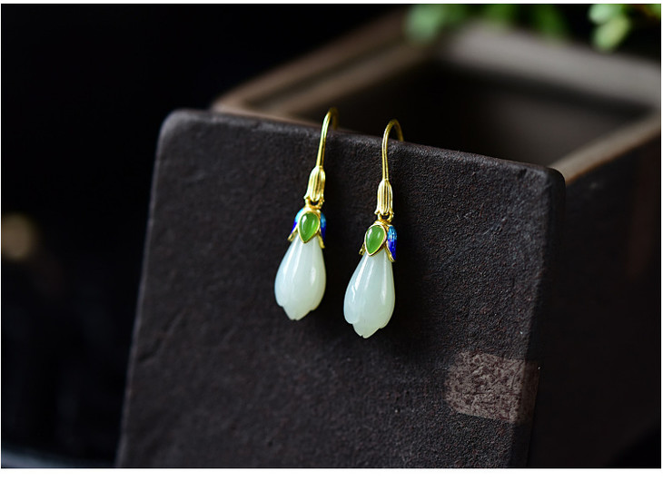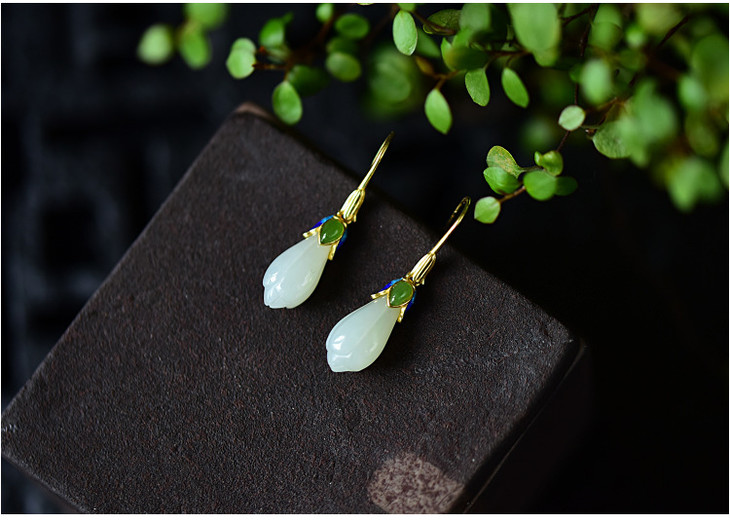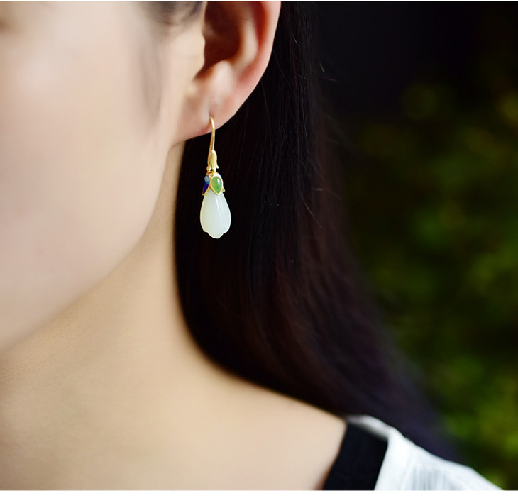 S925银镶嵌玉兰花耳环女白玉玉石景泰蓝耳坠耳饰耳钩