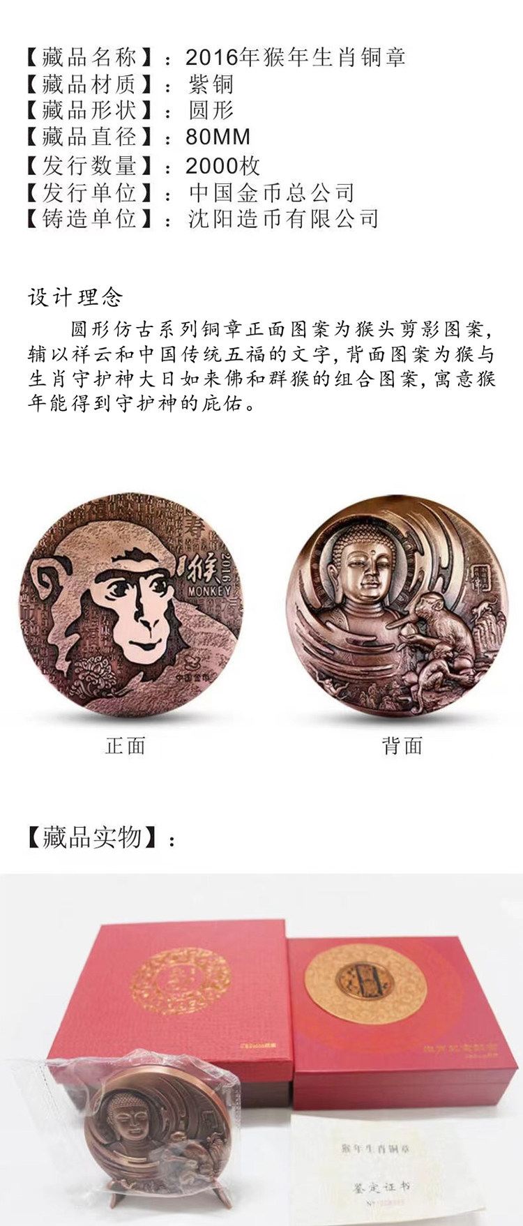 2016猴年生肖大铜章 80毫米