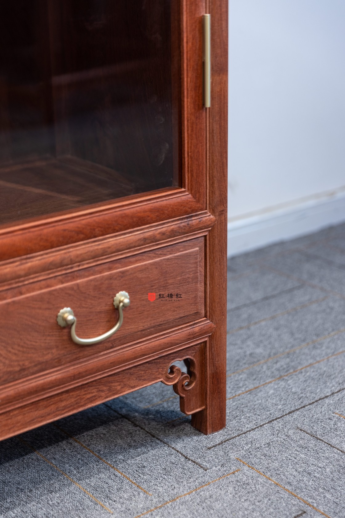 整器层次分明,空灵通透,光素无华,全器二膘用料,明式线条,简洁明快,铜件精致美观。下方设有抽屉两具,带铜件拉手;方材直足,足间牙板勾云如意;侧山干净,赏面悦目。此柜展示收纳一应俱全,通体素雅,器形古雅清逸,收纳强大。是当代又不失古典之韵味。
