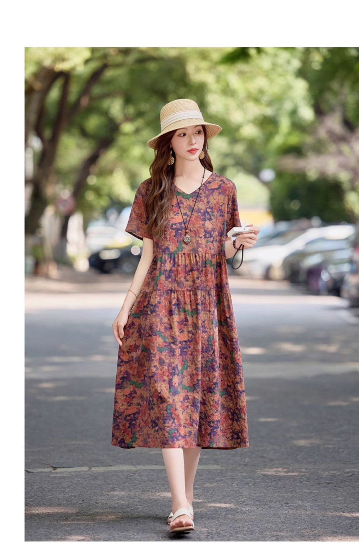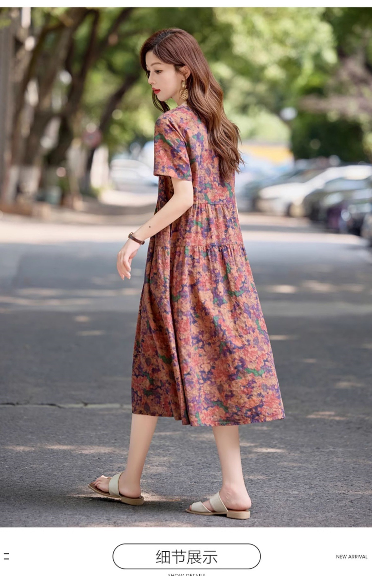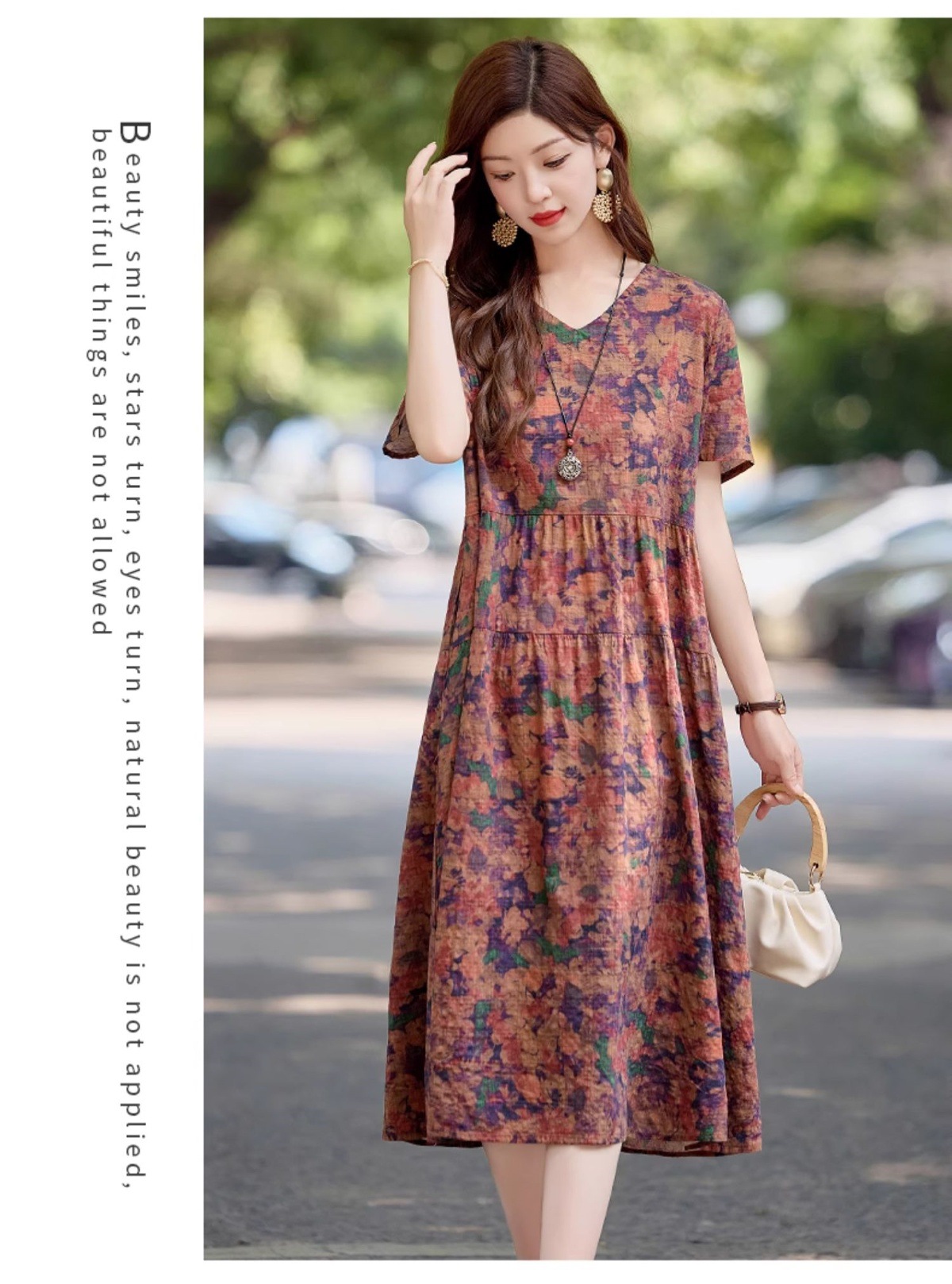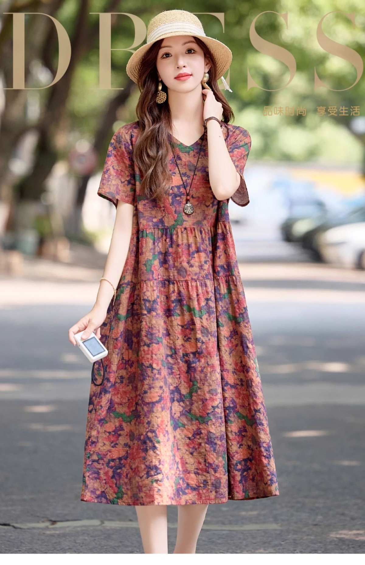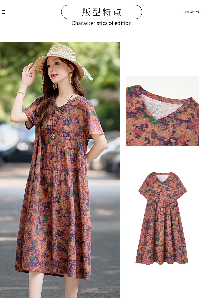 复古印花短袖棉麻连衣裙,优雅显瘦气质洋气减龄裙子HR-YWL1956