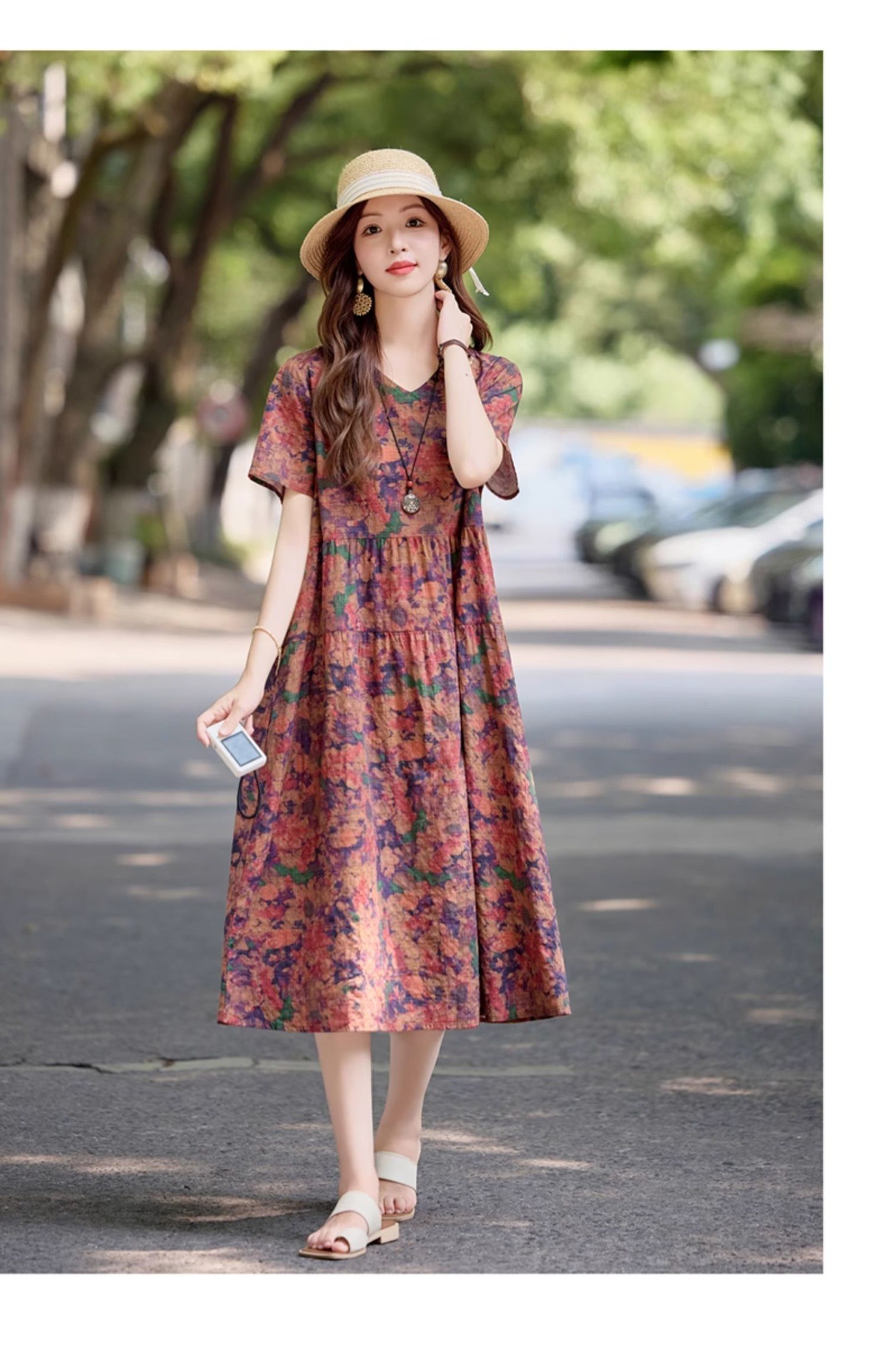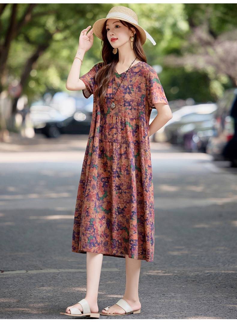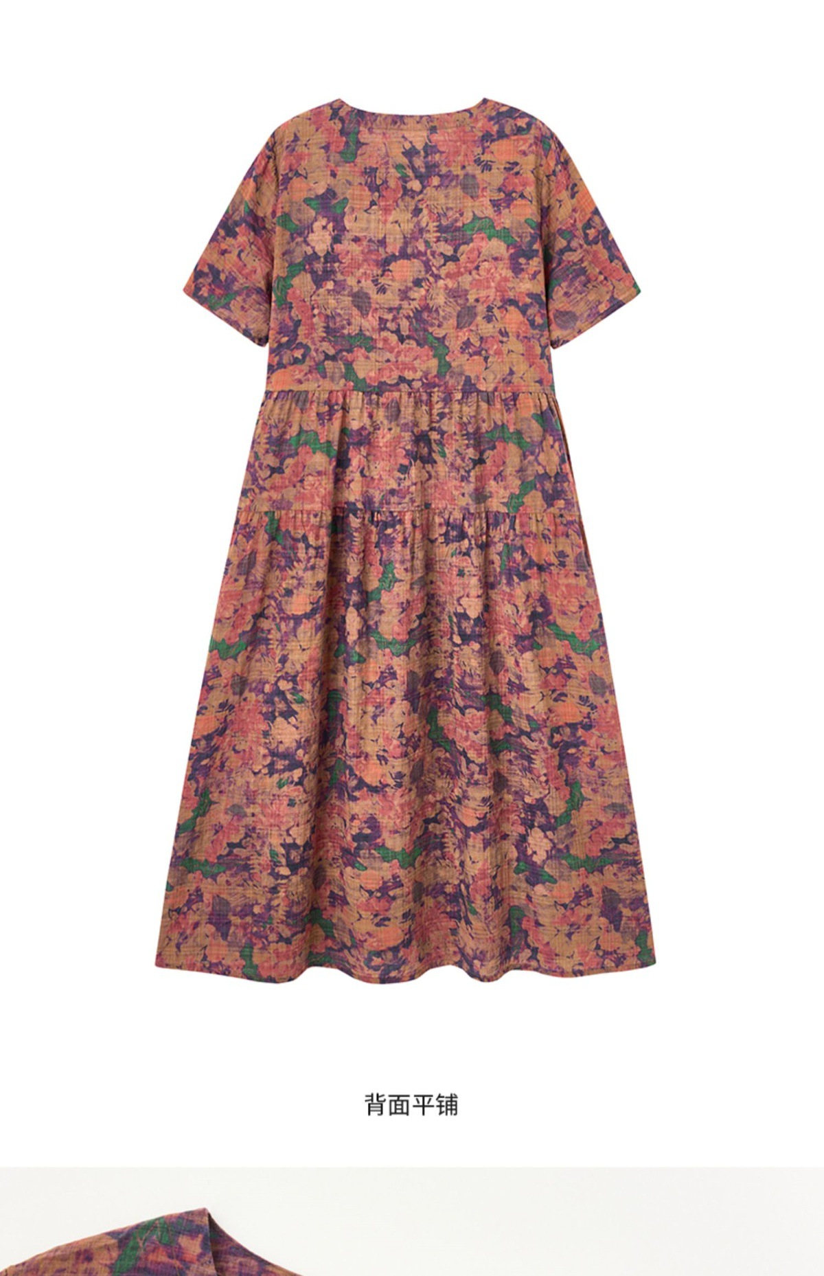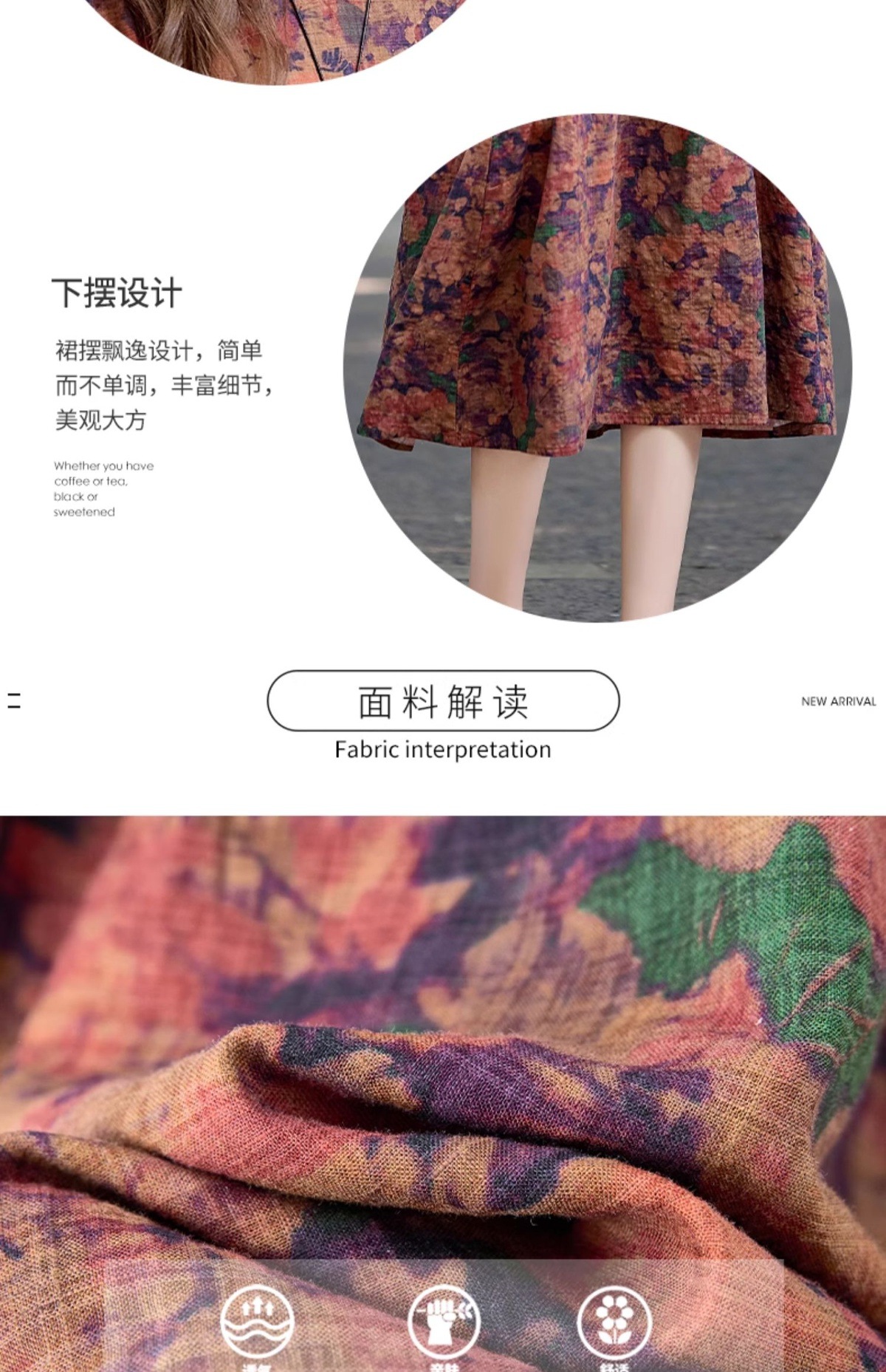 复古印花短袖棉麻连衣裙,优雅显瘦气质洋气减龄裙子HR-YWL1956