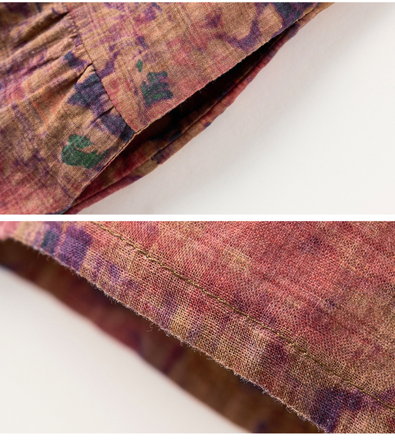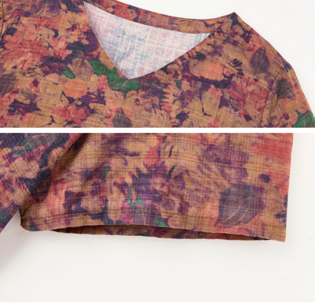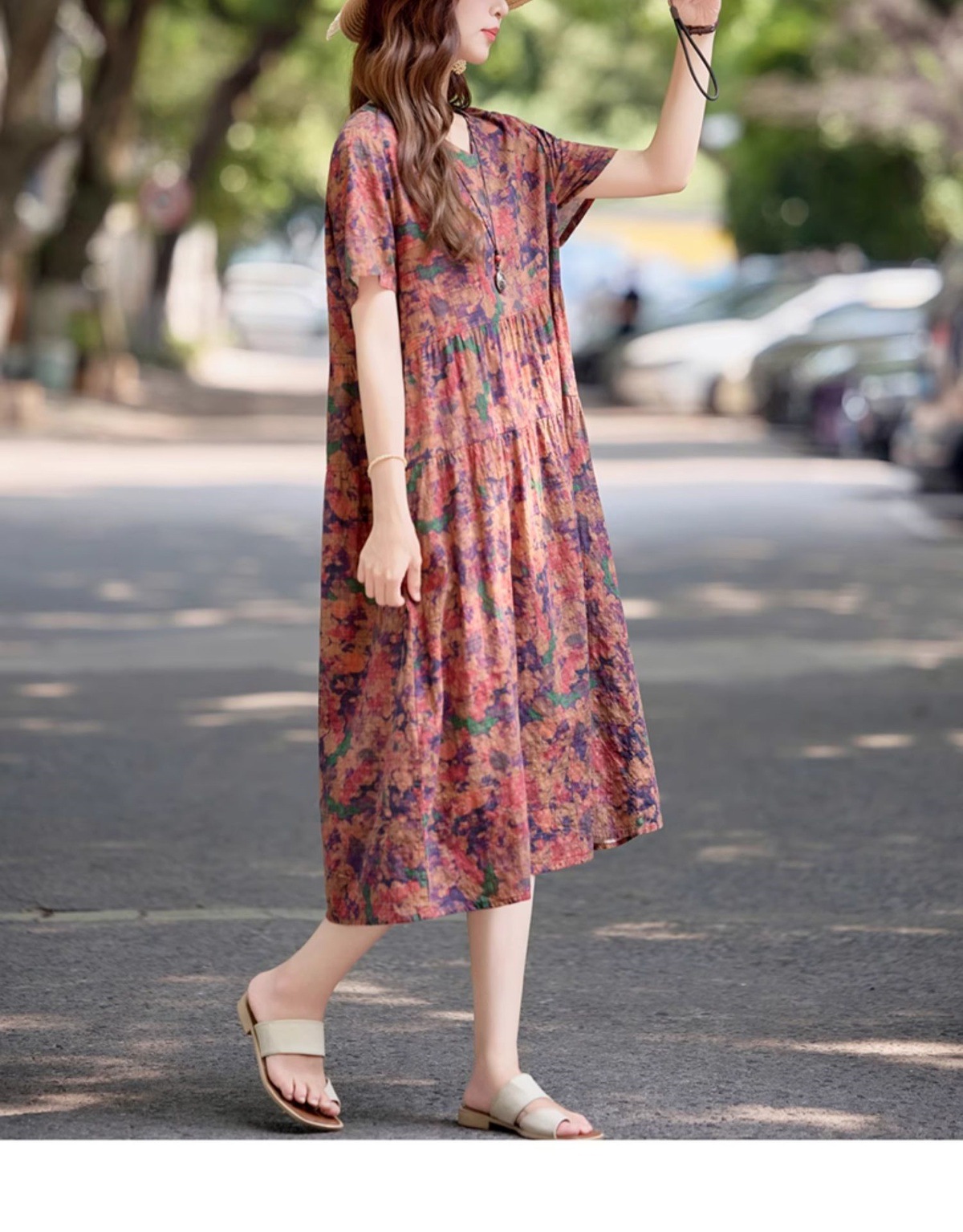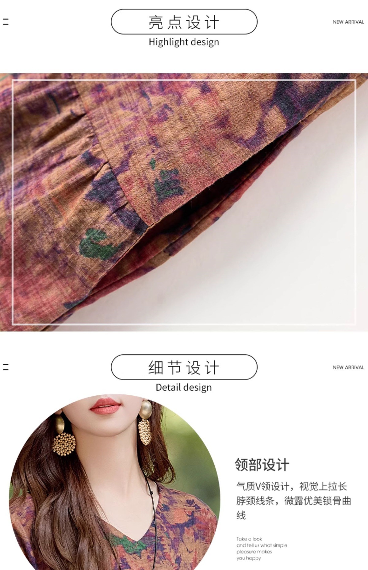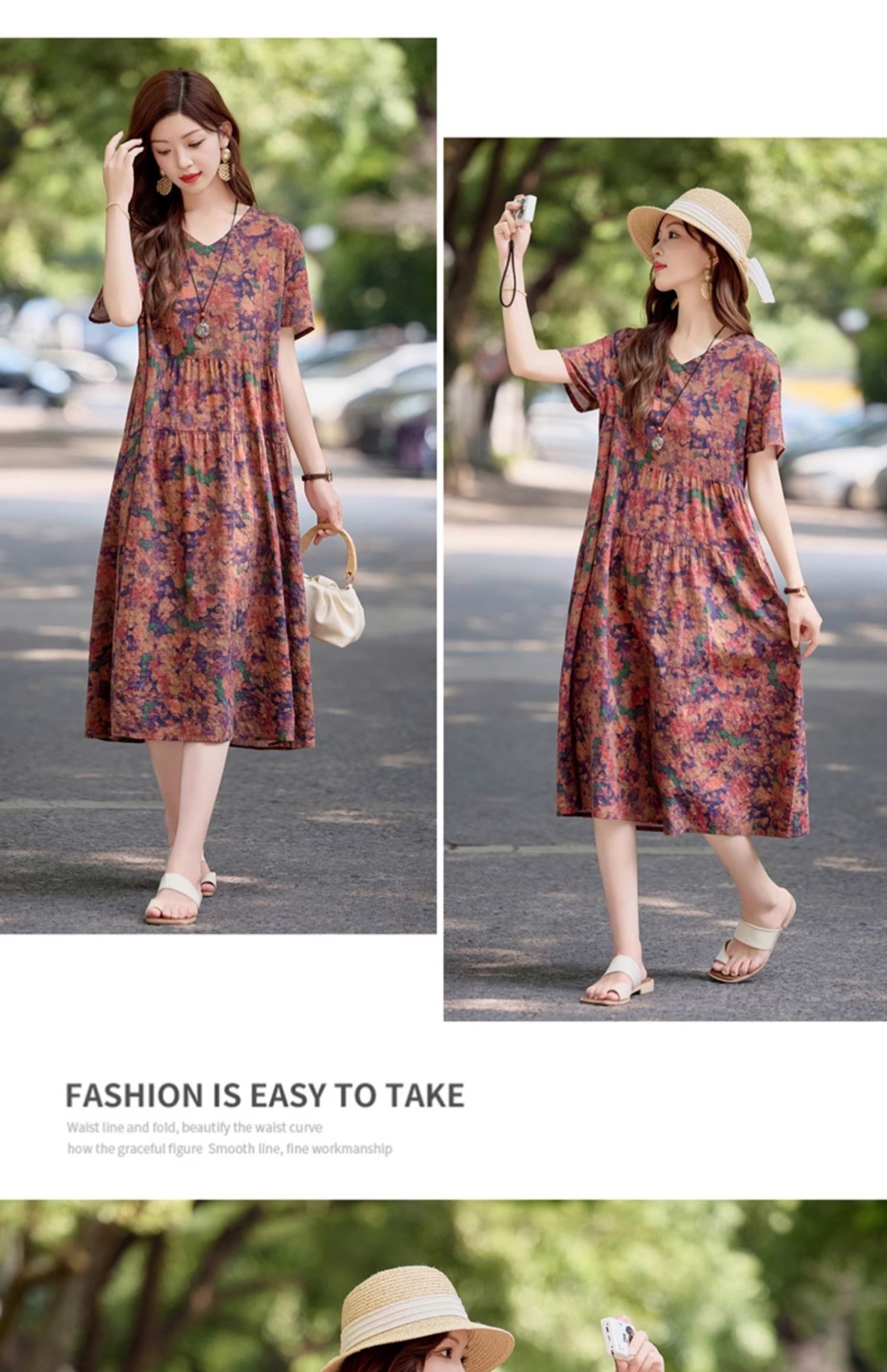 复古印花短袖棉麻连衣裙,优雅显瘦气质洋气减龄裙子HR-YWL1956