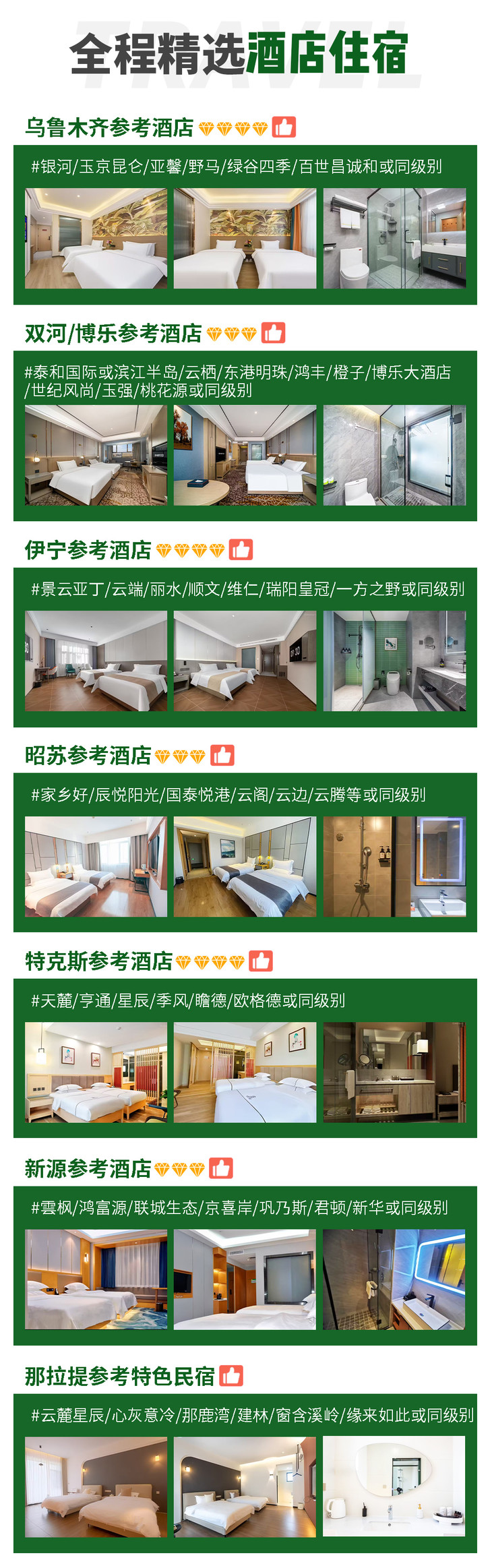 伊宁参考:景云亚丁/海旭/嘉会/润昌/好维佳/雲枫/丽水之都/云端/浦东假日或同级别酒店