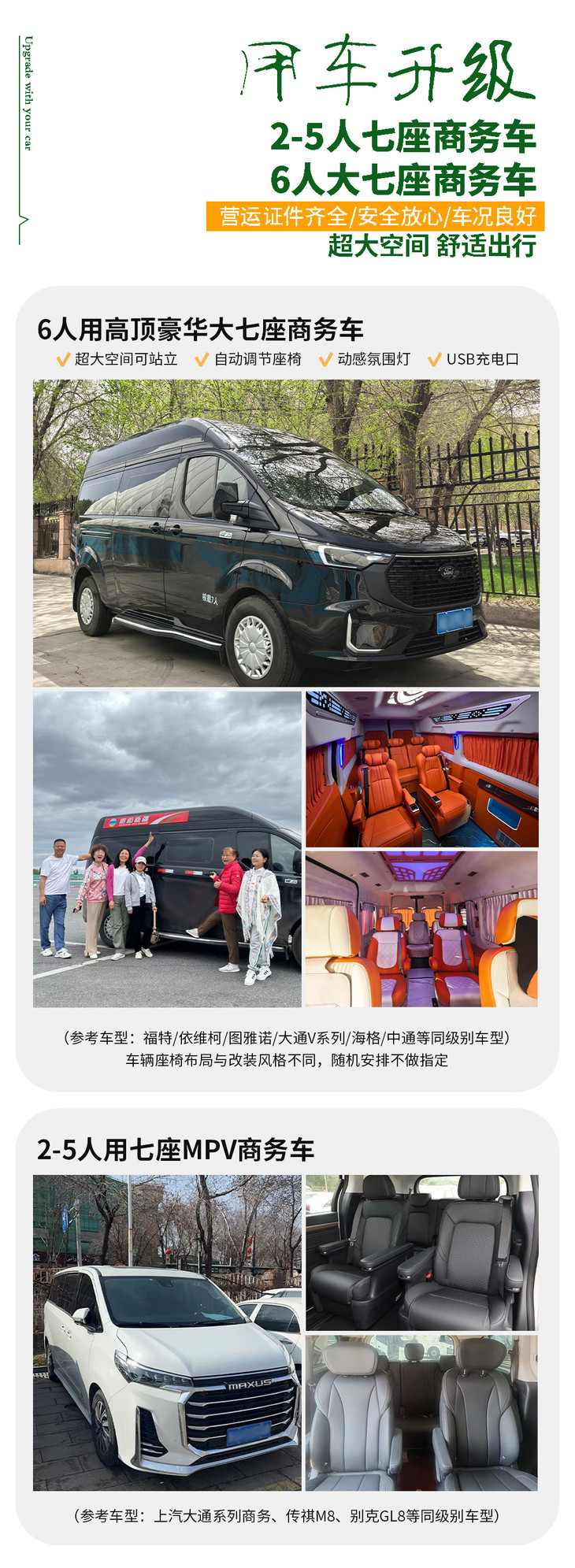 【当地交通】全程7天用车费用,2-5人用七座MPV商务车,6人用高顶大七座商务车(含司机、油费、过路费、停车费,司机食宿);具体车型根据人数安排,不接受指定车型,拼车全程座位需轮流换座。车辆空间有限,请携带不超过24寸的行李箱。