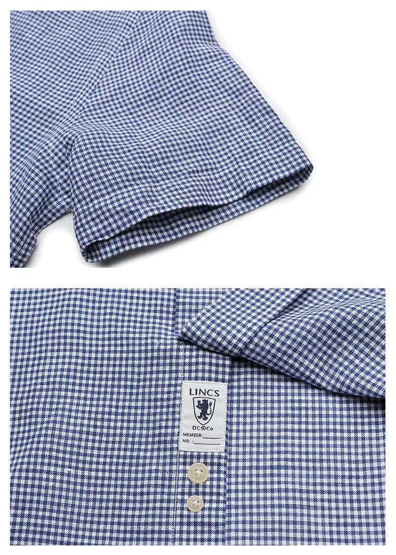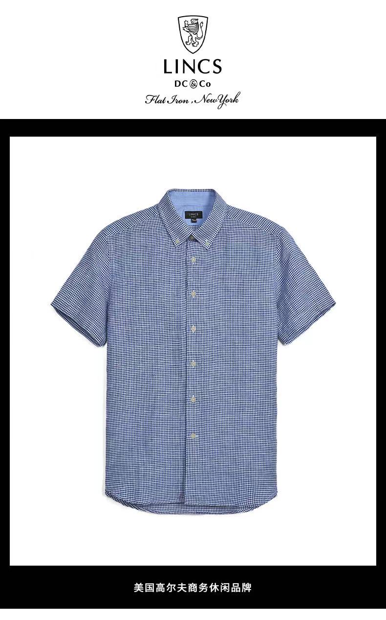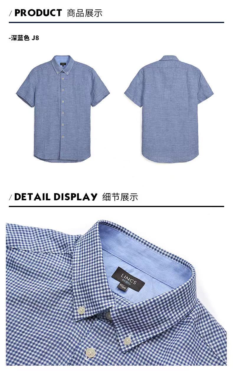 菱科斯男士短袖衬衫春夏新品男士小BUTTON DOWN 领全麻格子布短袖衬衫SS18WH115