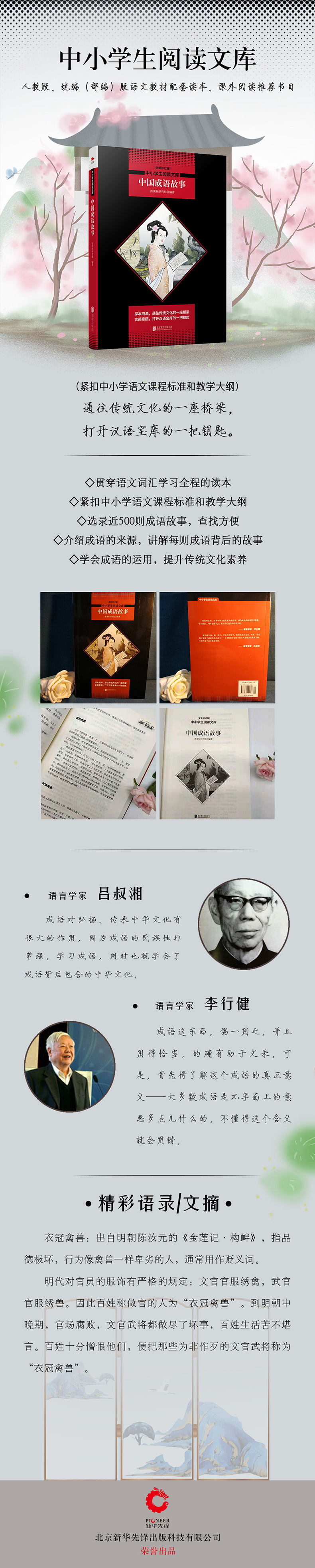 "探本溯源,通往传统文化的一座桥梁 言简意赅,打开汉语宝库的一把钥匙 中小学语文高一下推荐阅读 紧扣中小学语文课程标准和教学大纲 新课标研究组专家主持编写 深入浅出地讲解每则成语背后的故事 帮助学生学会成语的运用,提升传统文化素养 ★新语文教材,“读”字当先 2016年9月,全国数百万小学生和初中生开始使用“部编本”语文教材。新教材格外注重课外延伸阅读,提出了“教读”—“自读”—“课外阅读”“三位一体”的教学结构。“部编本”语文教材总主编温儒敏强调:语文教学通常讲“听说读写”,哪一样最重要?“读”最重要。应当把阅读放在首位。 ★阅读习惯要从小养成,改变“浅阅读”之风 在2018年中国全民阅读年会上,中国人民大学新闻学院教授周蔚华针对国内大学生图书借阅量和发散度均低于美国的现象,指出必须对大学生阅读经典原著加强引导,尤其要强化哲学、思想、文化类图书的阅读教育,改变浅阅读的习惯。教育相关部门也明确提出,所有高考科目都将对语文的素养持续考察,要提升试卷的阅读量,以鼓励学生增加各学科知识的宽度、广度,引导学生进行广泛阅读。“全民阅读”要从学生开始,更要从中小学生抓起,在他们人生的初级阶段就种下阅读的种子。 ★“中小学生阅读文库”,时间历练的经典 “佳作不厌百回读”,真正有价值的书籍是能够经得起时间考验的。“中小学生阅读文库”针对语文课程改革提出的新阅读要求,精选了古今中外流传已久,被广大读者广为传颂的众多名篇佳作。既有鲁迅的《朝花夕拾》、林海音的《城南旧事》、冰心的《繁星•春水》、老舍的《骆驼祥子》、丰子恺的《缘缘堂》、沈从文的《边城》《湘行散记》、孙犁的《白洋淀纪事》、吴强的《红日》等文坛经典,也有《星星离我们有多远》《飞向太空港》等当代作家充满想象力的代表作品;同时也收录了《伊索寓言》《钢铁是怎样炼成的》《简•爱》《童年》《鲁滨孙漂流记》《安徒生童话》《名人传》《物种起源》等众多脍炙人口国外名著,内容涵盖散文、小说、诗歌、传记、寓言、科普、历史、哲学等,针对中小学生语文学习的特点和要求,注重对中小学生阅读习惯的养成与提升,力求为读者提供具有代表性和可读性的至臻读本。 "