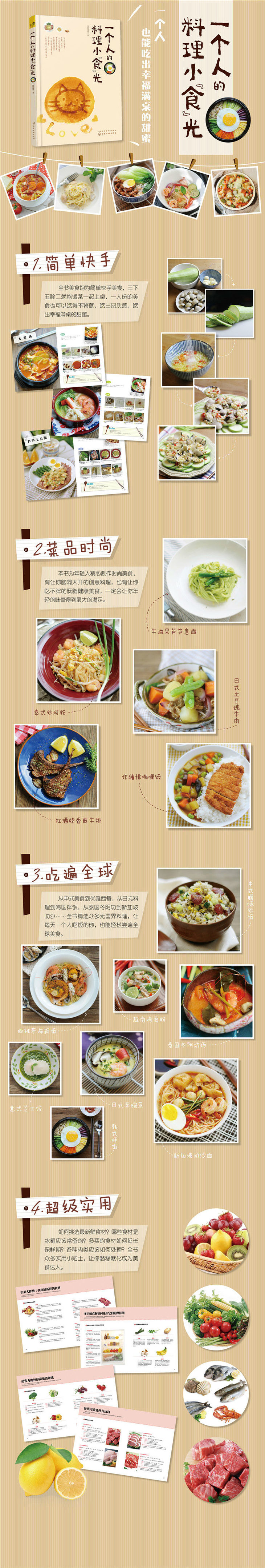 本书精心挑选近百种美食,从中餐到西餐,以健康为目的为你量身打造一个人的美食。从买菜教程开始,让你轻松学会如何挑选最新鲜的营养食材,再配以详细的美食制作图文步骤,让下厨再也不是难题。从现在起,抛弃外出吃饭文化,一个人也要好好吃饭,感受食物带来的温暖和甜蜜。