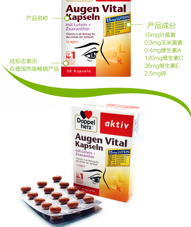 德国双心 Doppelherz护眼活力软胶囊 含玉米黄素和叶黄素 30粒