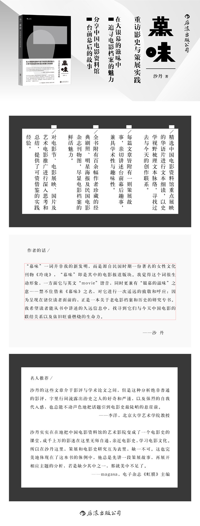“幕味”一词并非我的新发明,而是源自民国时期一份著名的女性文化刊物《玲珑》,“幕味”即是其中的电影报道版块。我觉得这个词很生动形象,一方面它与英文“movie”谐音,同时更兼有“银幕的滋味”之意……禁不住借来《幕味》之名,对它进行一次遥远的致敬和呼应:因为呈现在诸位读者面前的,正是一本关于老电影档案和历史的研究专书。我希望读者能从书中讲述的久远信息中,找寻到它们与今天中国电影的联结关系以及依旧旺盛燃烧的生命力。