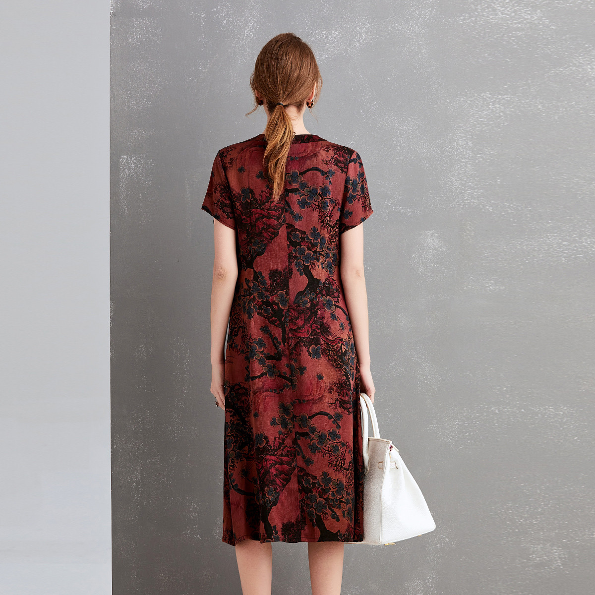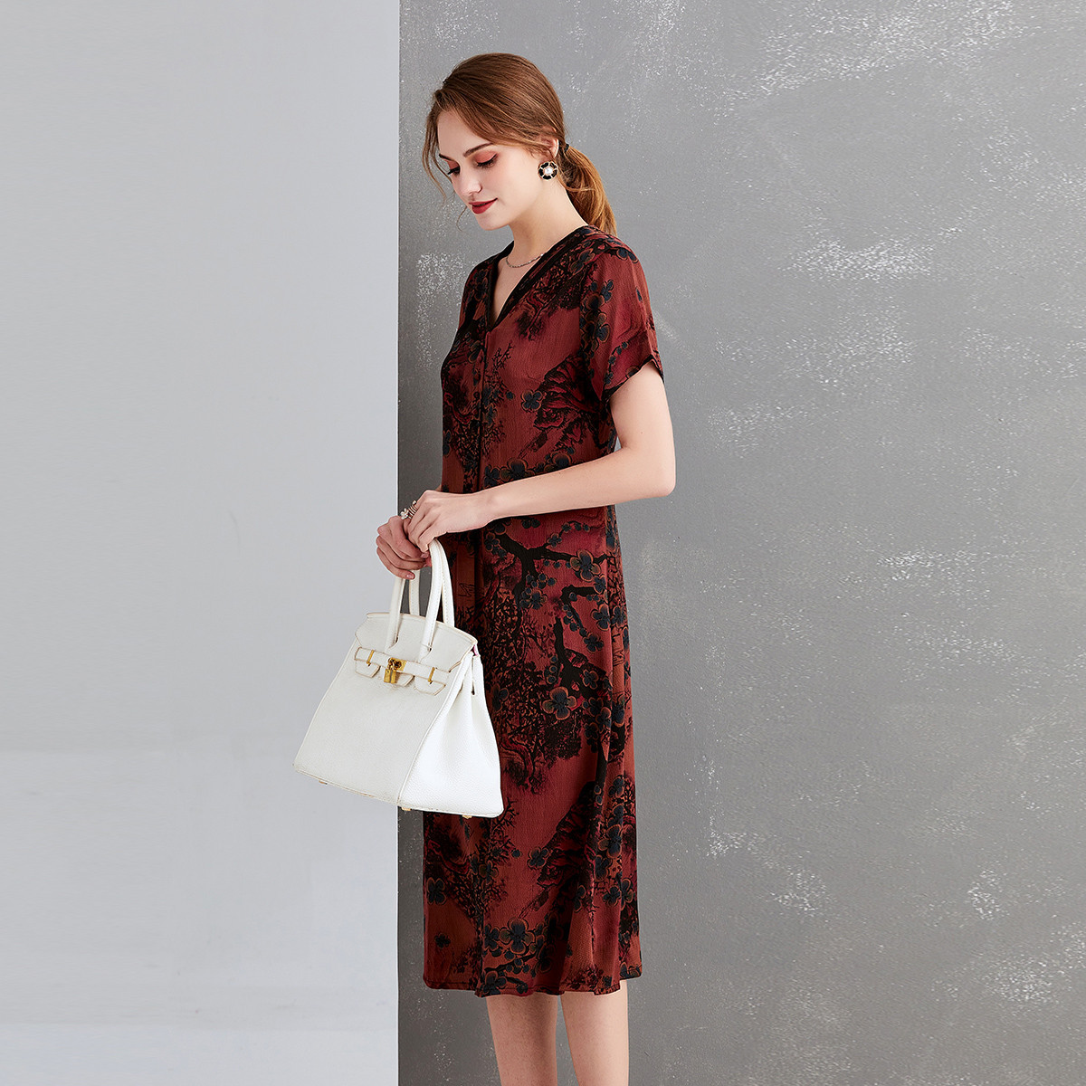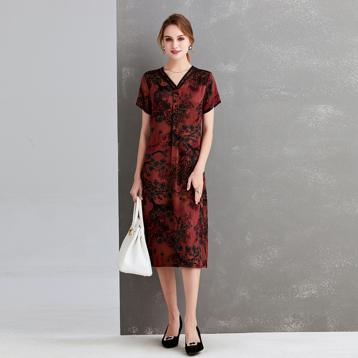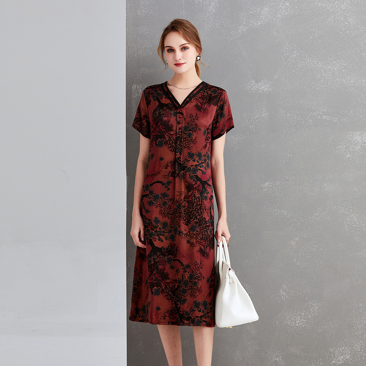 上海旗袍厂XT-21008-3复古V领桑蚕丝连衣裙 气质中腰碎花民族风女式香云纱连衣裙
