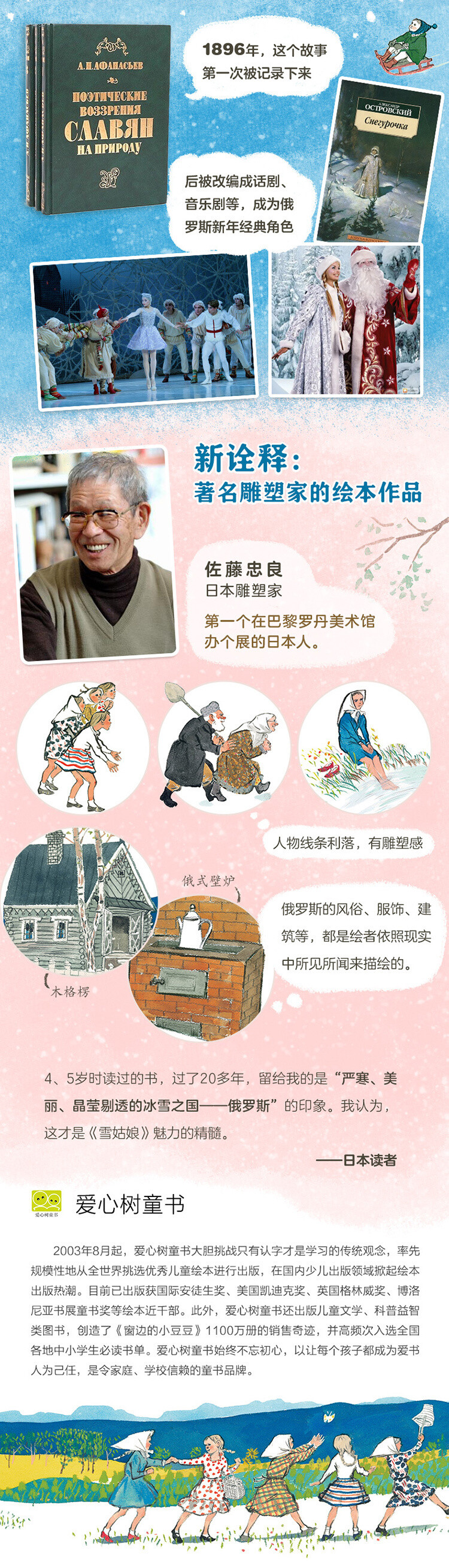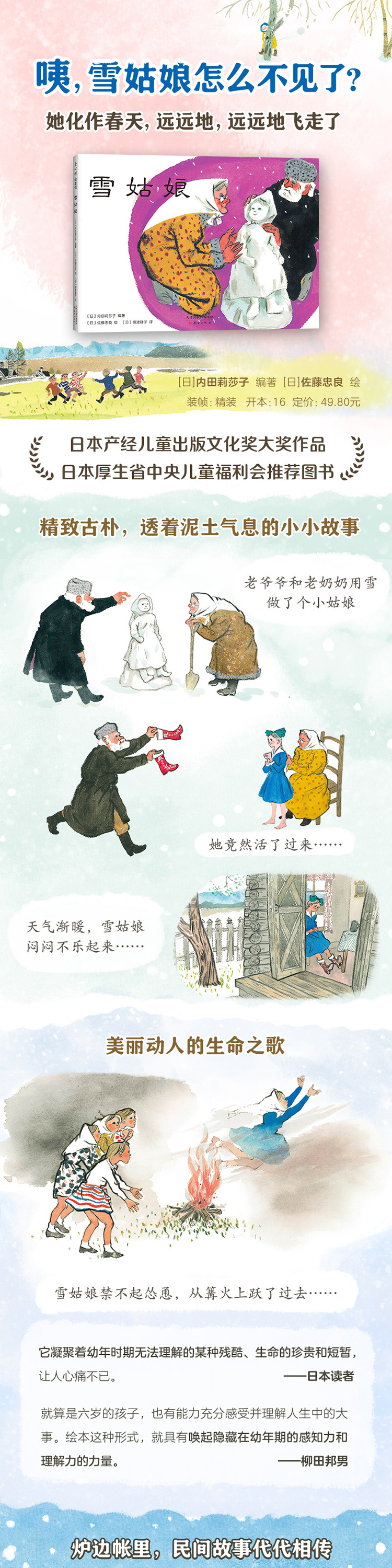 ☆日本作家、绘者研究者柳田邦男:“***算是六岁的孩子,也有能力充分感受并且理解人生中的大事。图画书这样的媒介,***具有唤起隐藏在幼年期的感性认知和理解力的力量。”《雪姑娘》以一种无比轻盈的方式讲述生命与死亡,唤起混合着失去和别离无可名状的悲伤。