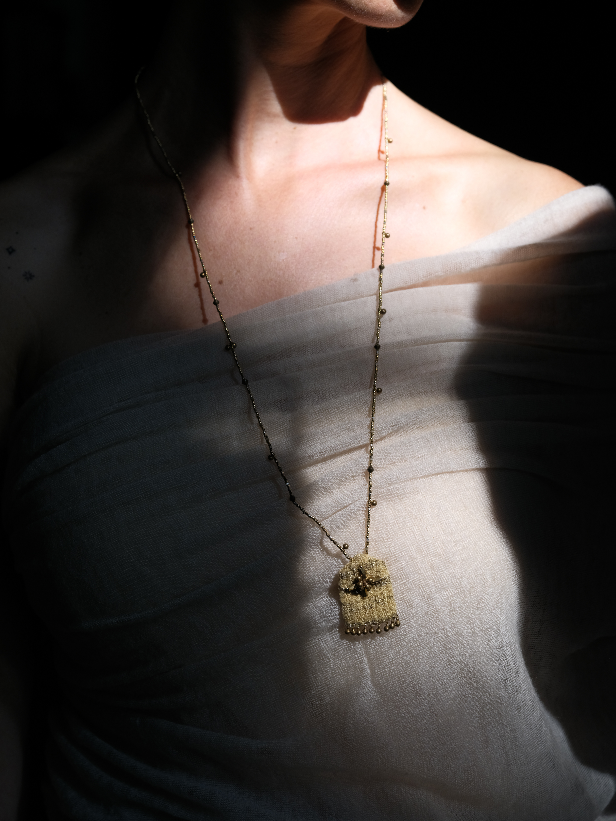 羊毛,泰丝,聚酯纤维,铜,18K镀金钉珠