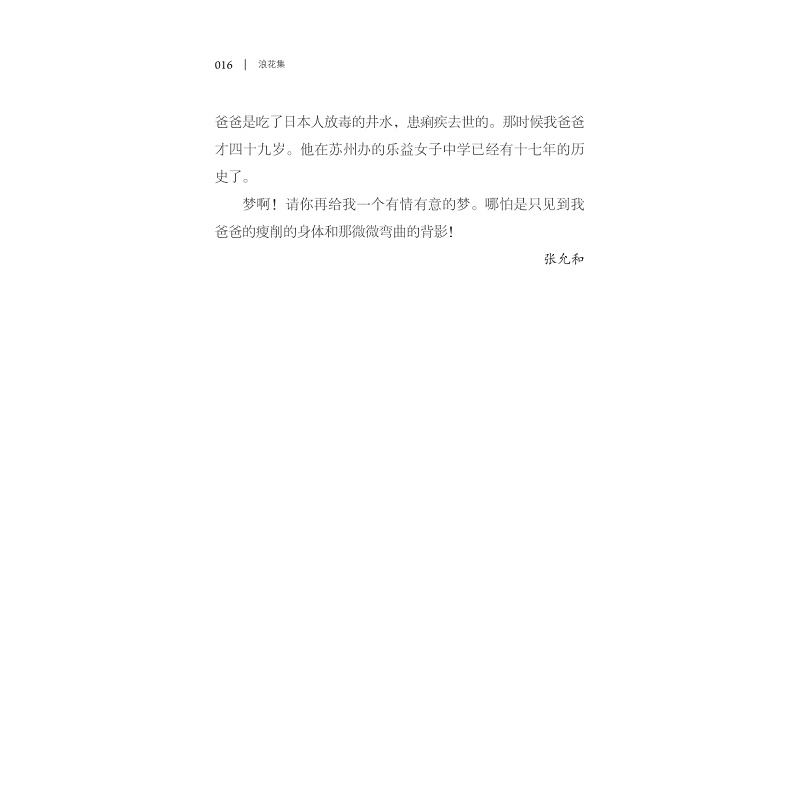 这本《浪花集(张允和作品集)(精)》中的所有文章来源于《水》。《水》的文章充满了真实、爱心和亲情,是个小小的家庭刊物,却被资深的大出版家范用先生誉为“本世纪一大奇迹也”。