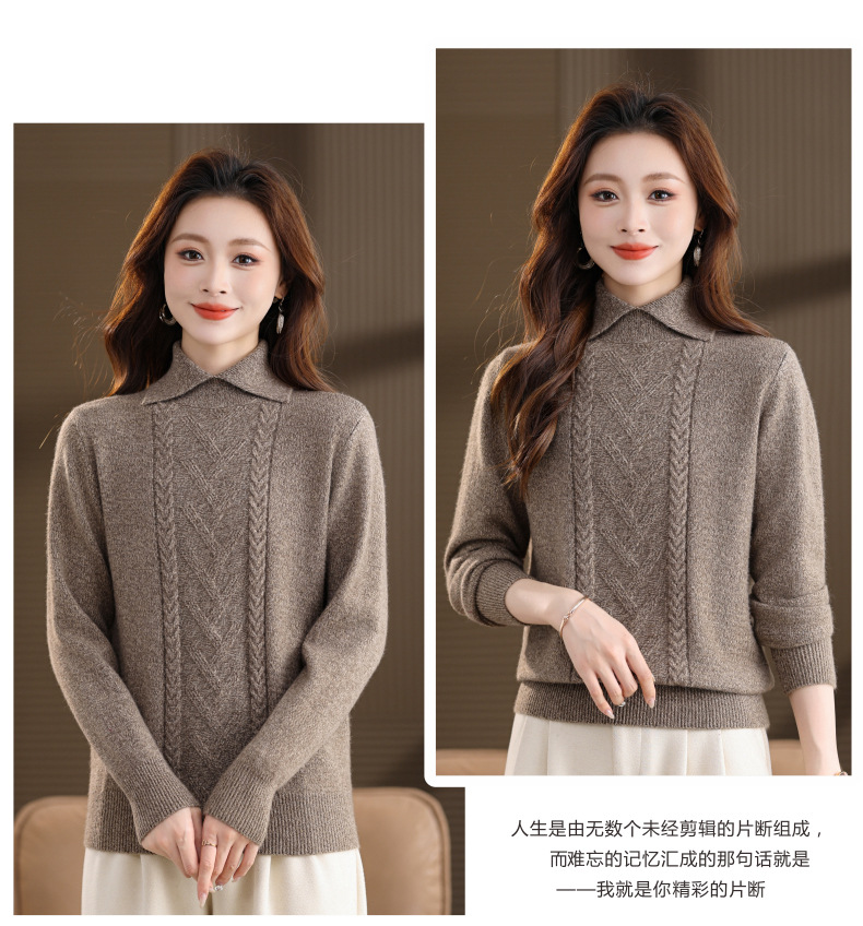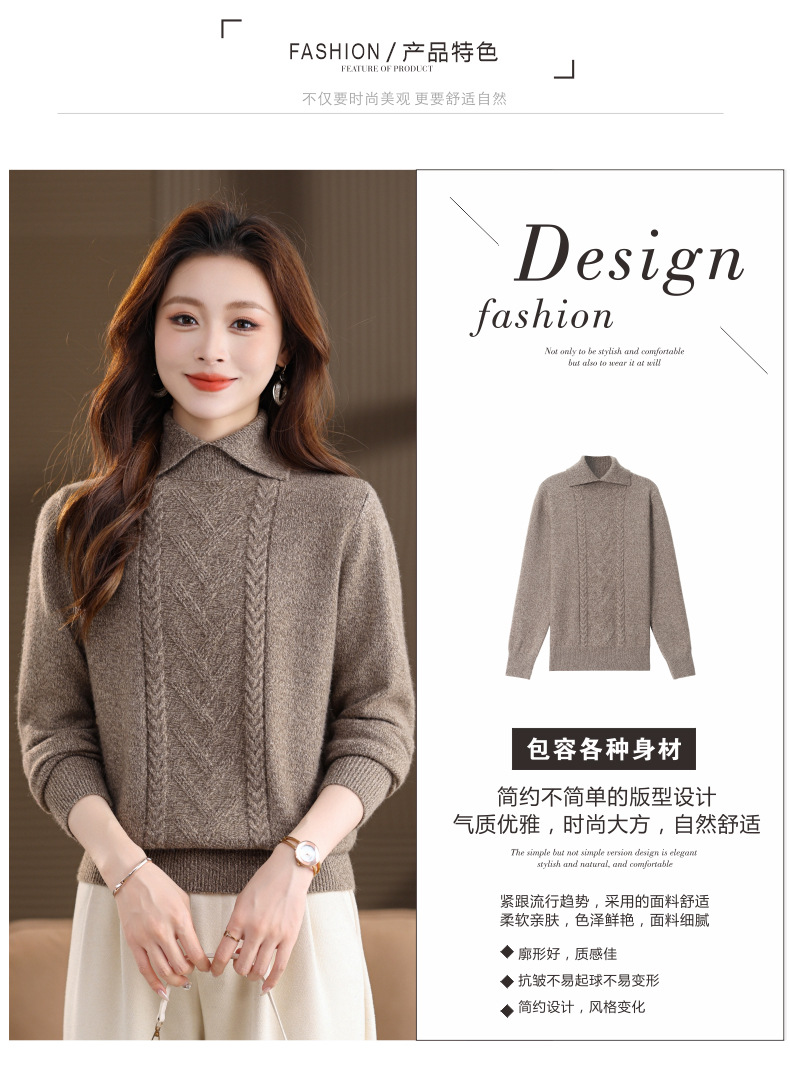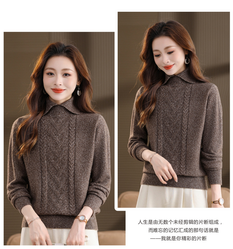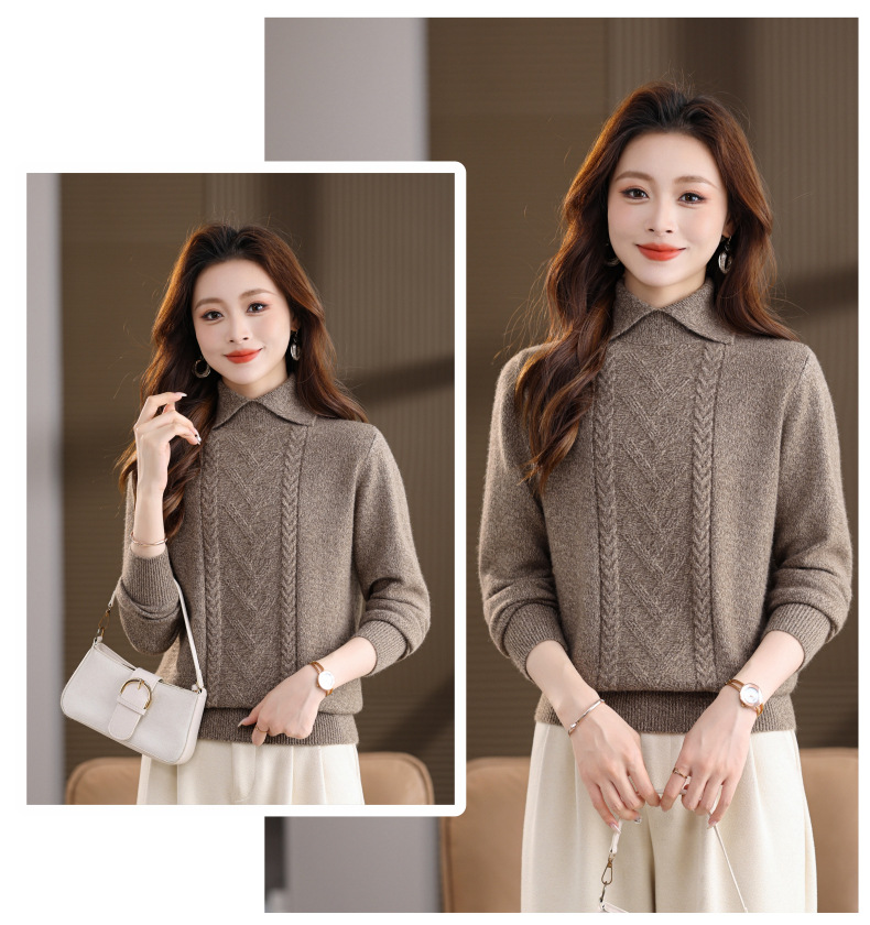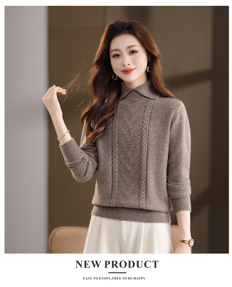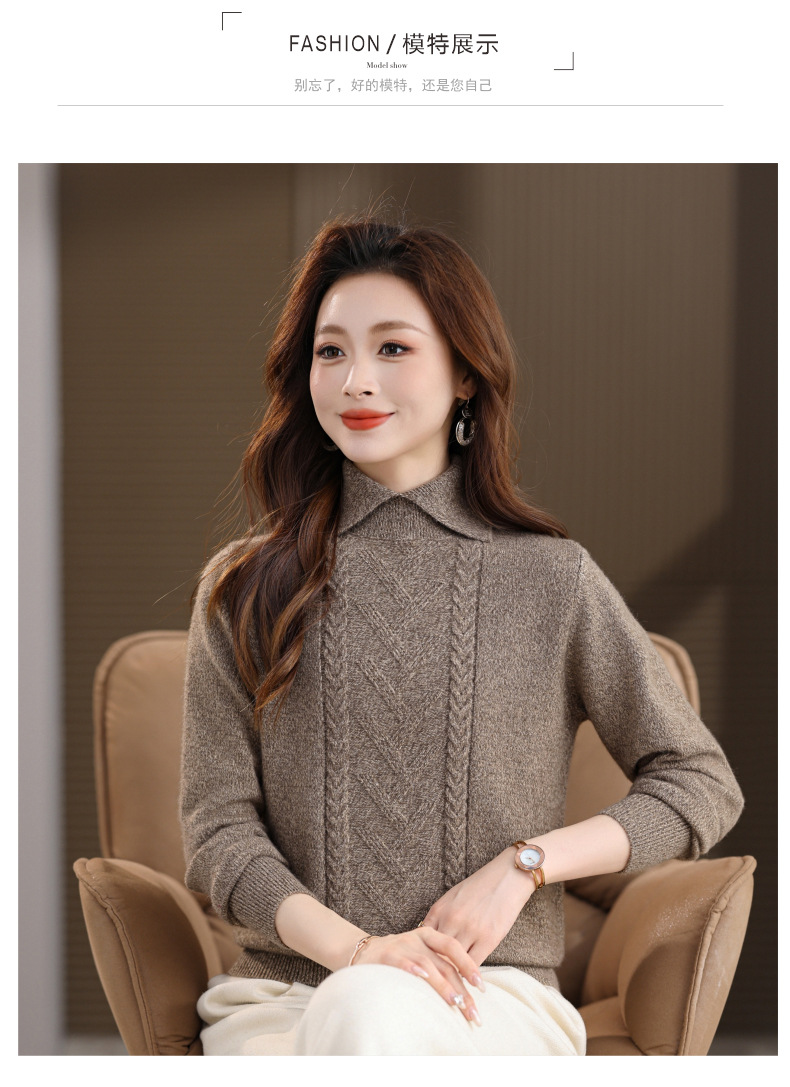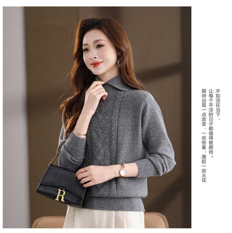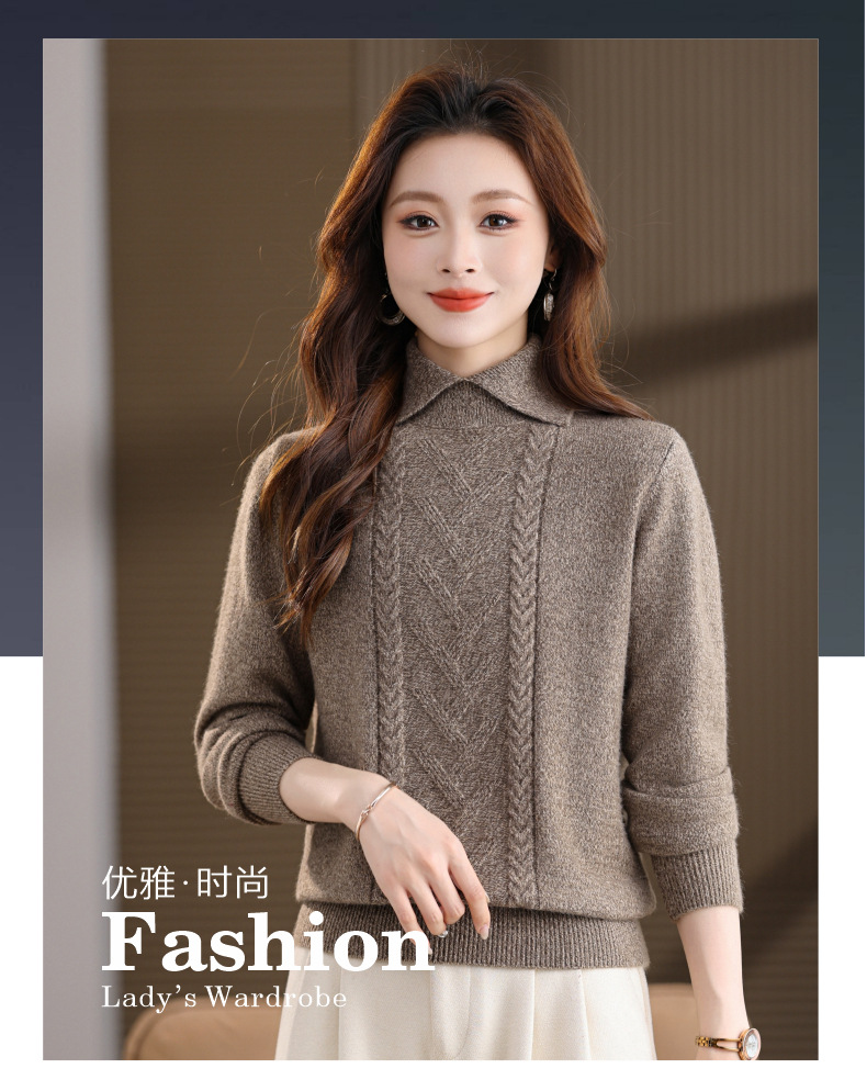 CC翻领短款毛衣女秋冬卡其色麻花针织衫复古风宽松显瘦百搭打底毛衣