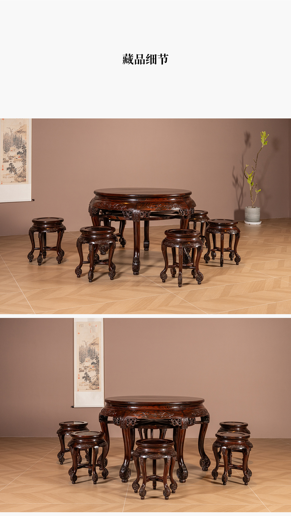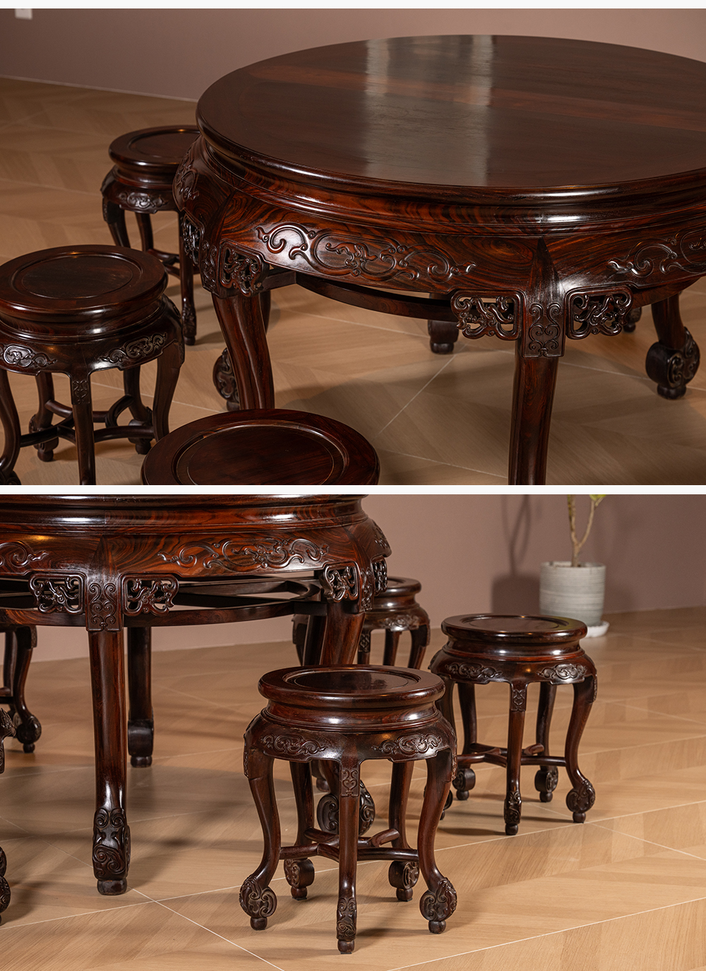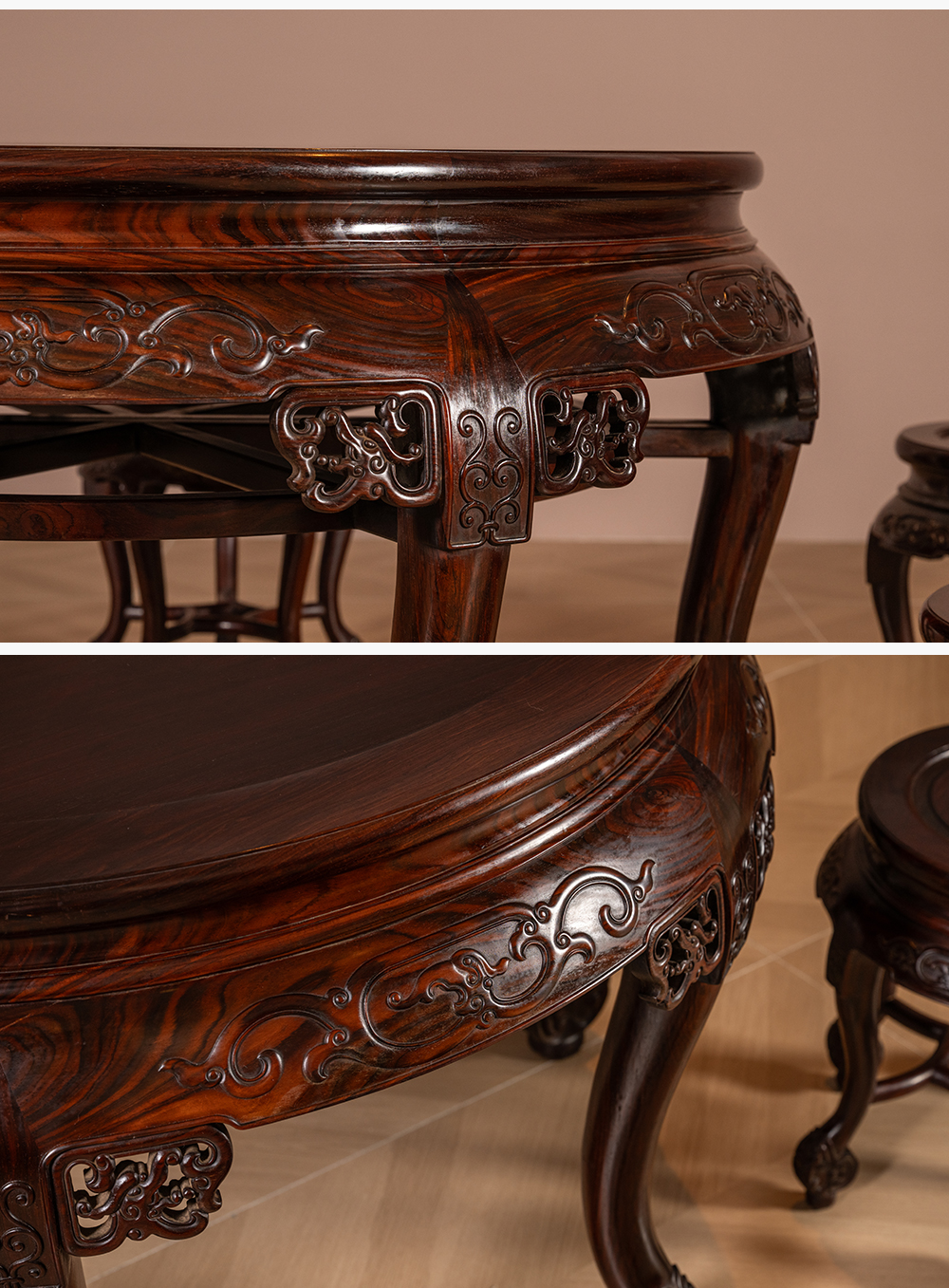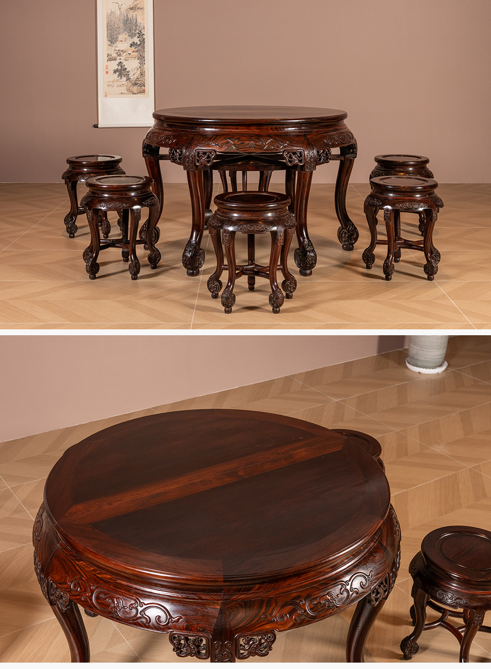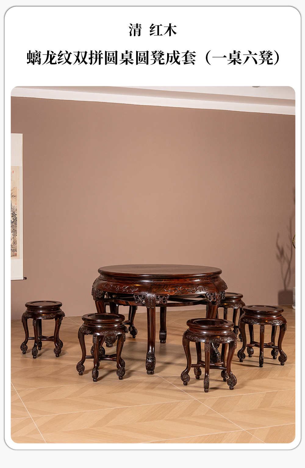 清 红木螭龙纹双拼圆桌圆凳成套(一桌六凳)